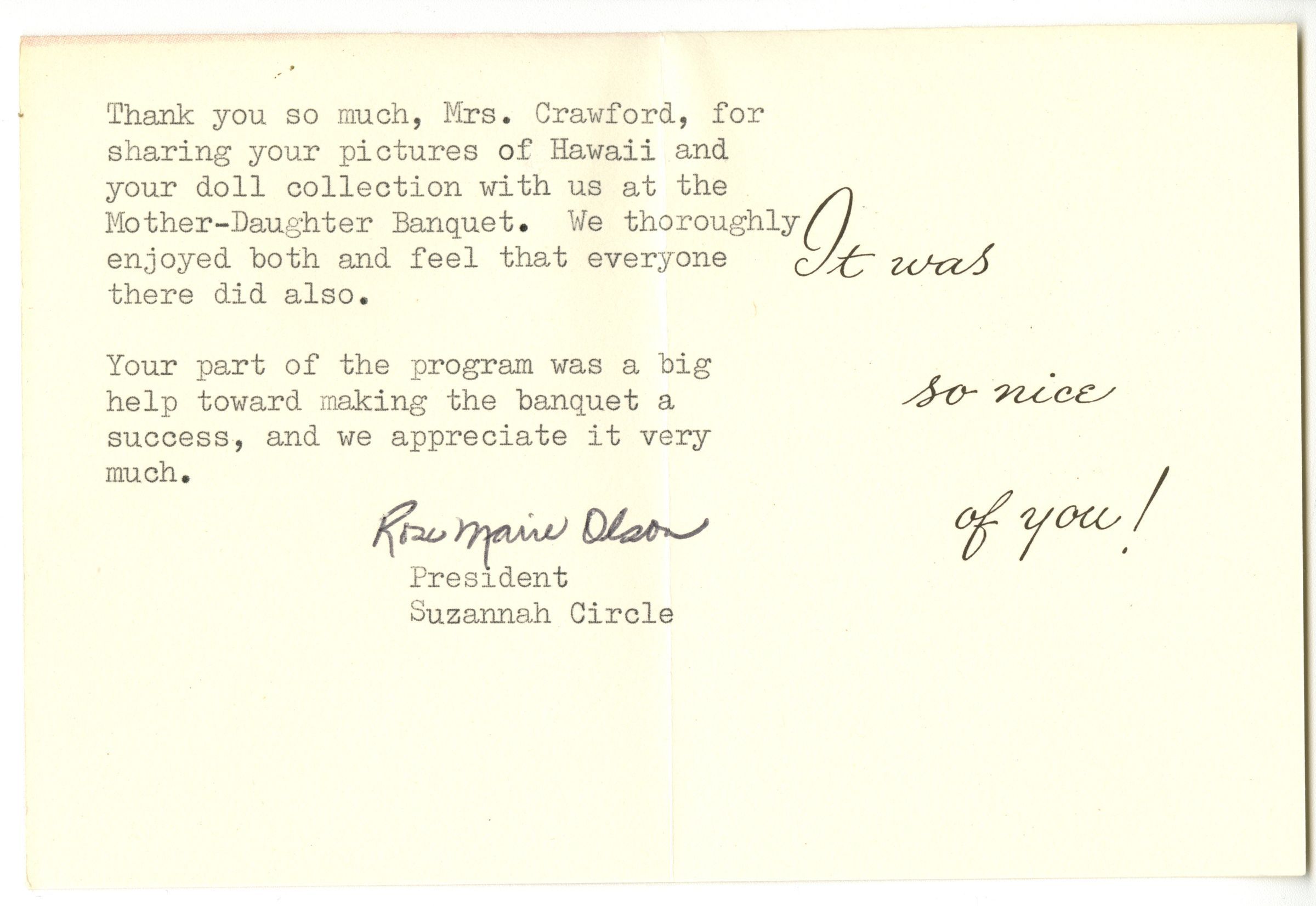 Thank you card to Mrs. Crawford for sharing her pictures of Hawaii and doll collection for the Mother-Daughter banquet of the Suzannah Circle. Signed by Rose Marie Olson, President.