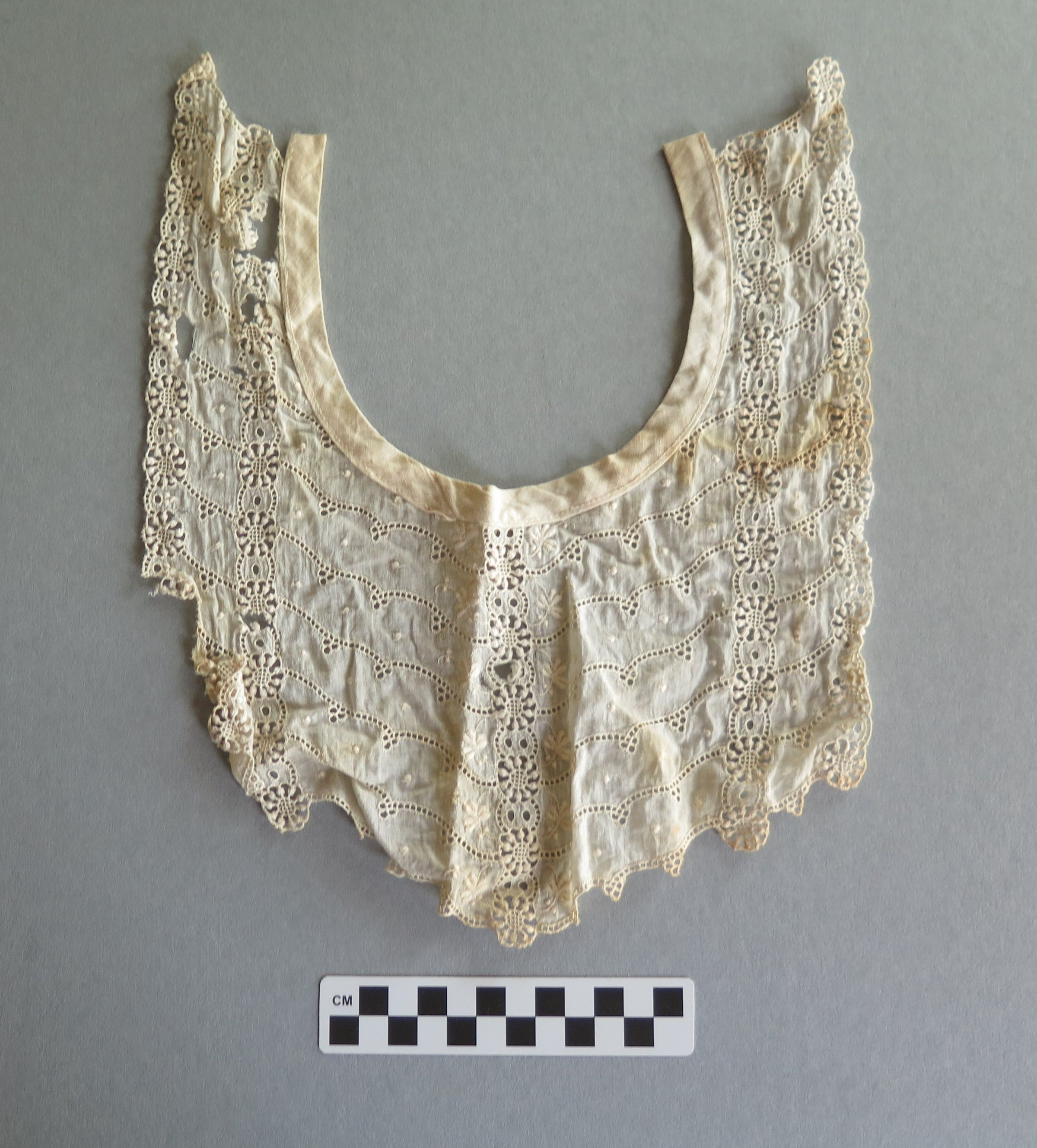White crocheted lace collar. The collar measures 6" (w) x 10" (l).