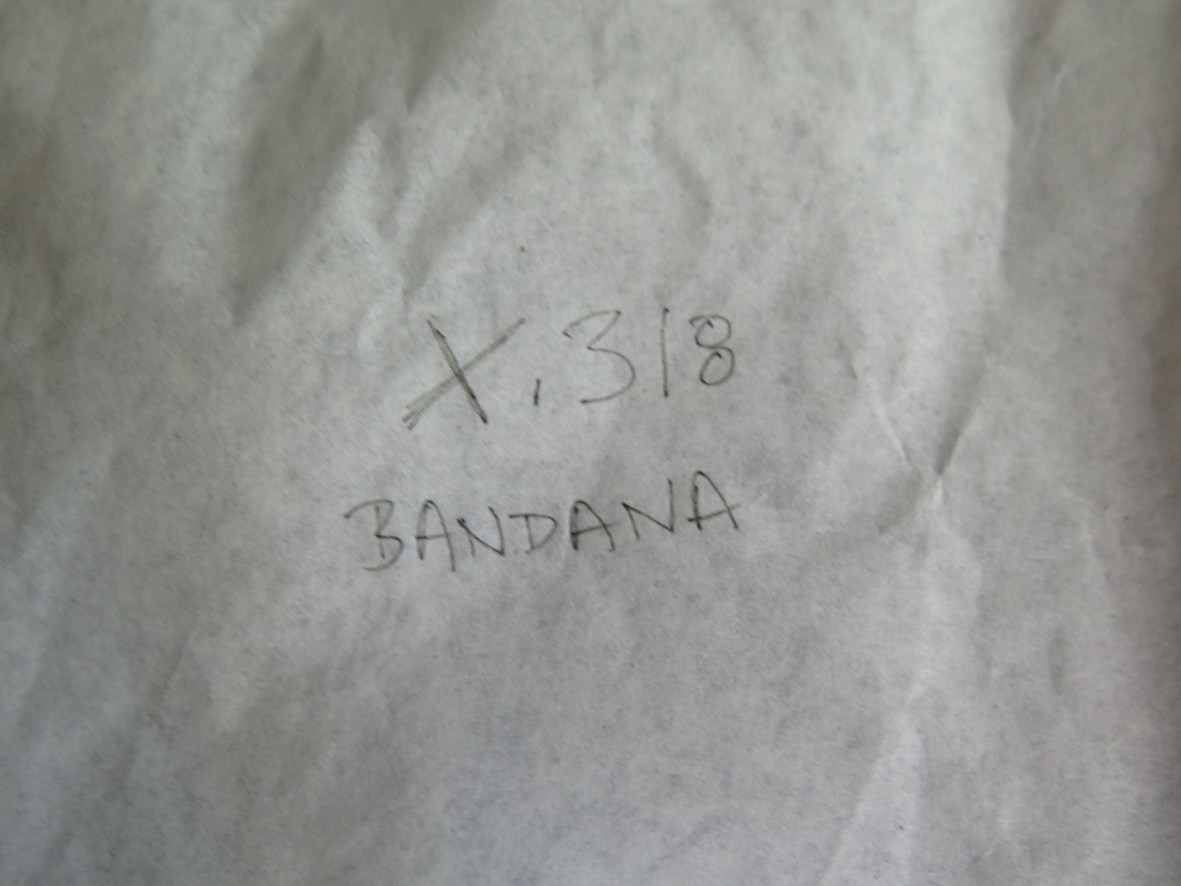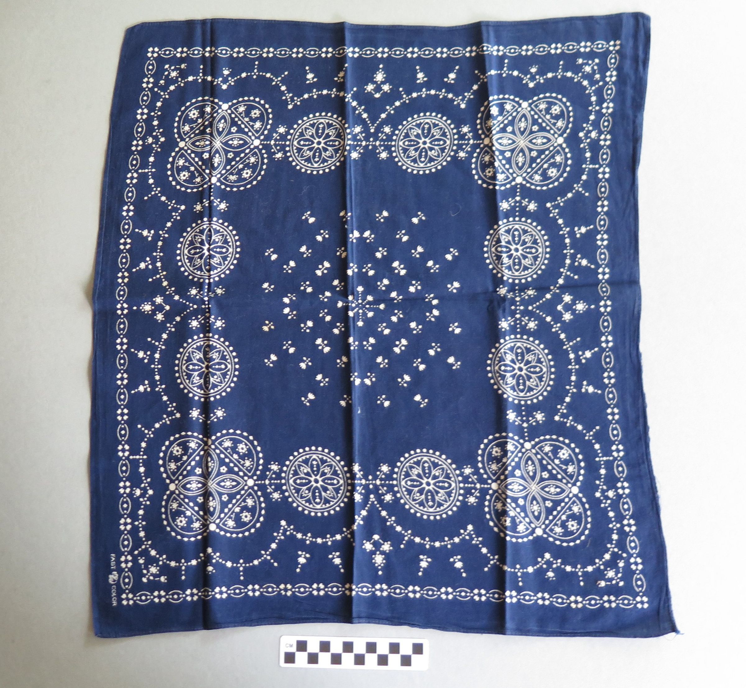 Blue bandana with white geometric designs. Bandana measures 24" (w) x 24" (l).