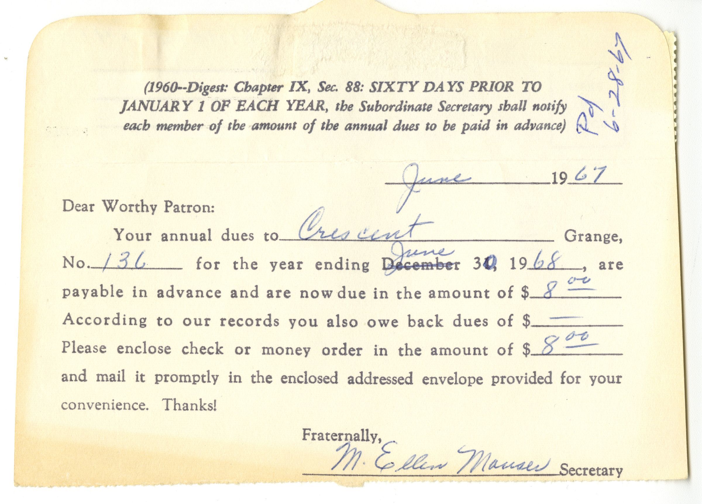 A request for payment of $8.00 in annual dues to the Crescent Grange. Signed by M. Ellen Mauser, Secretary. Added in blue pen along the top right corner, "Pd 6-28-67."