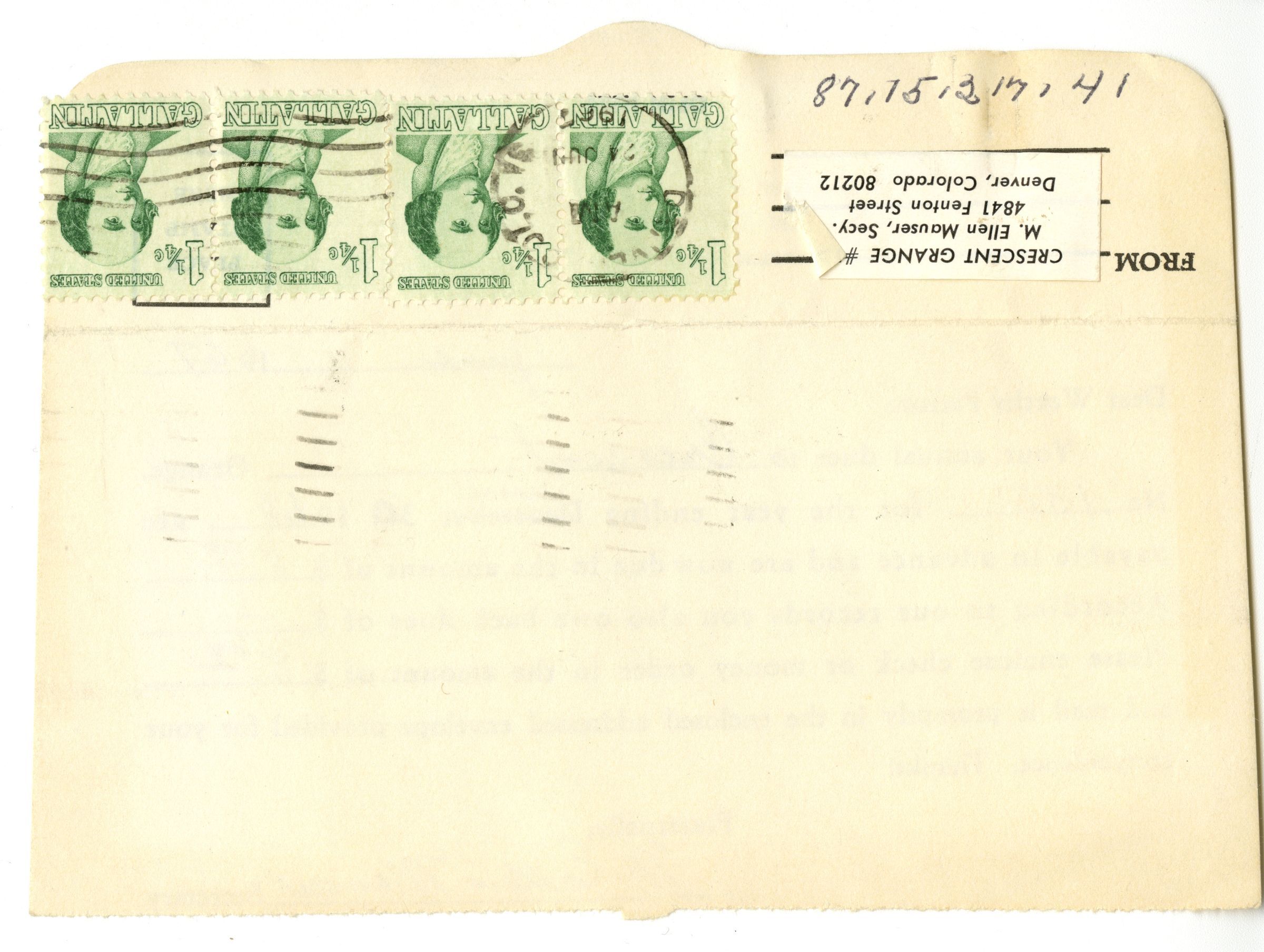 On the back: 4 green 1.25c stamps. Return address sticker listing "Crescent Grange #136. M Ellen Mauser, Secy. 4841 Fenton Street, Denver, Colorado, 80212.Collection