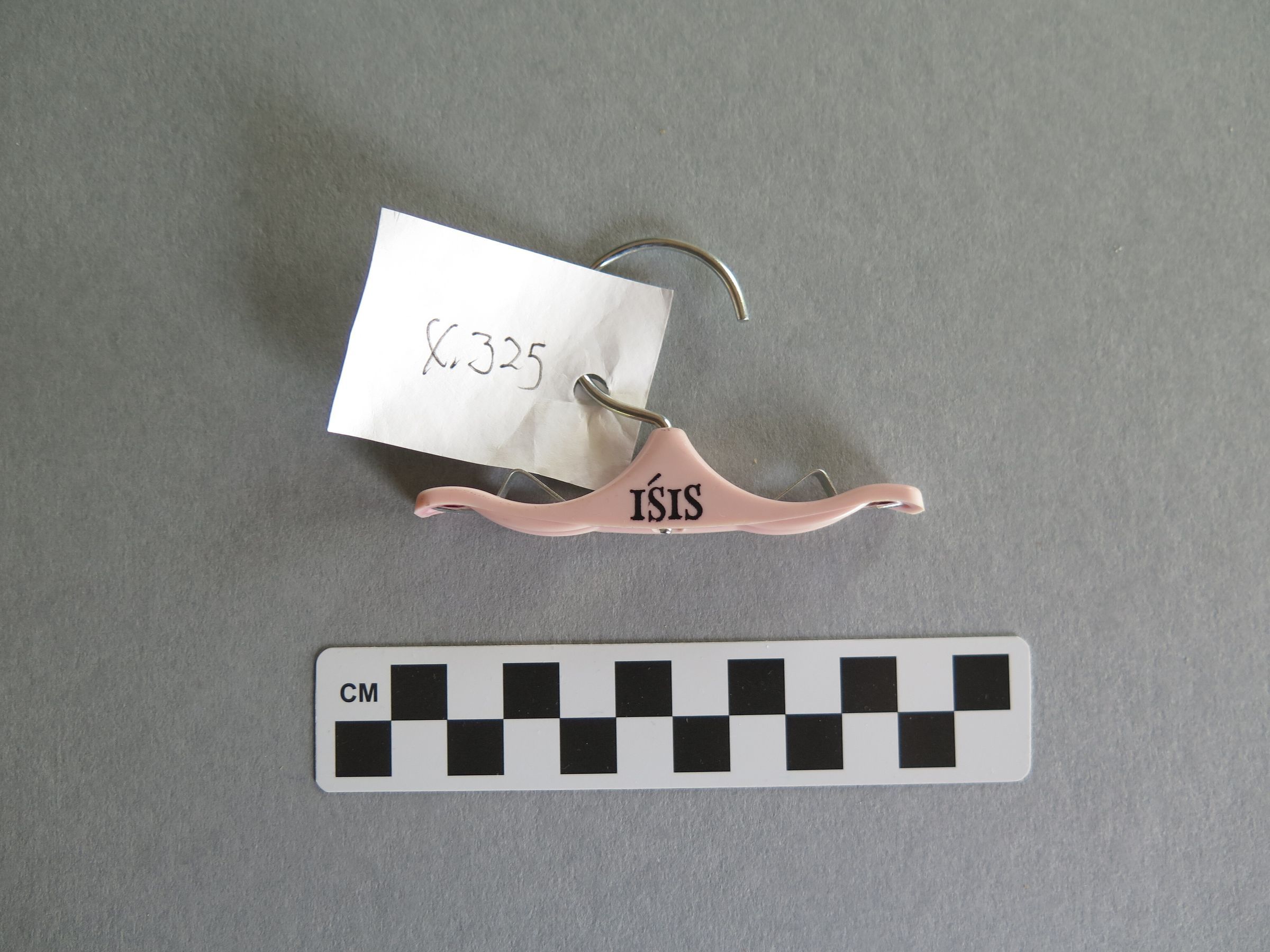 Small pink hanger with black text that reads "ISIS." The hanger measures 2" (w) x 3" (l).