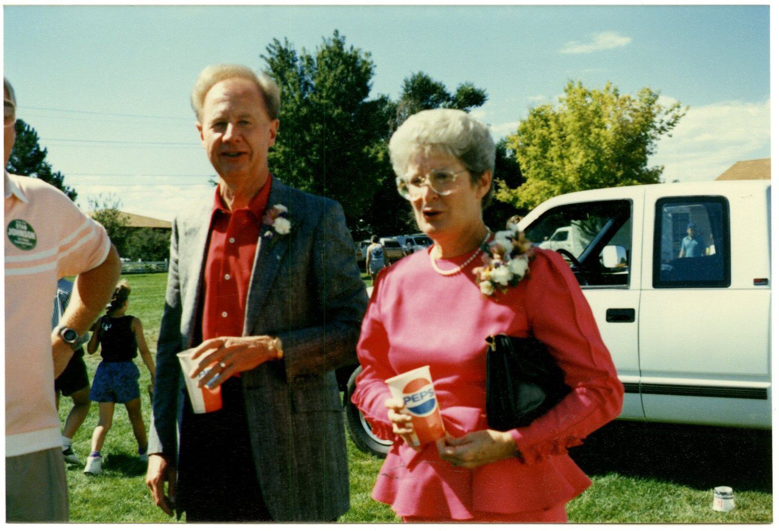 Item is a colored photograph taken during the 1990 Broomfield Days celebration. The photo centers around an elderly couple, Jack and Joyce TerHar, standing in front of a white van that is parked in a grassy field. Jack is on the left, wearing a red button-down shirt and gray suit jacket, and holds a Pepsi paper cup in his hand. Joyce is on his right, and she has glasses, a black purse, her own Pepsi cup, and a pink flowered blouse. To the left, someone else's arm is visible wearing a salmon polo shirt, and children play in the field. Large trees and the blue sky complete the background. Jack was likely associated with the Sill-TerHar car dealership.Photograph Details