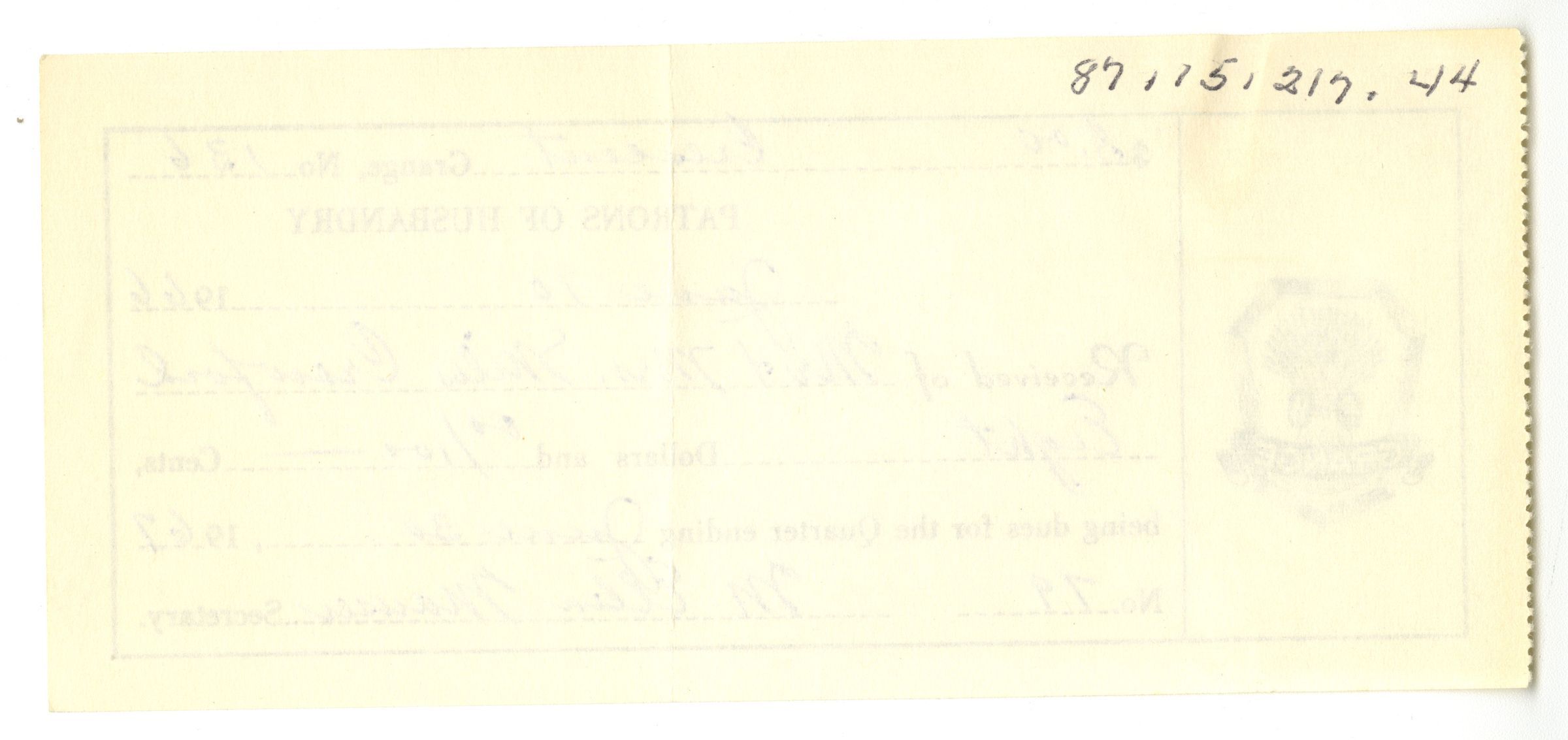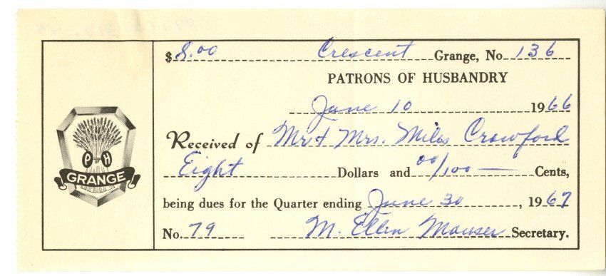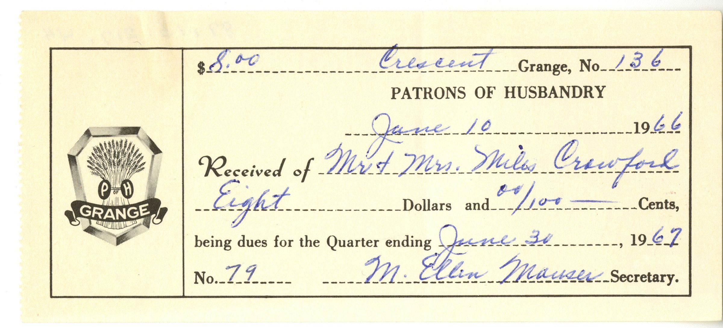 "Patrons of Husbandry. June 10, 1966. Recieved of Mr + Mrs Miles Crawford. Eight Dollars and 00/100 cents, being dues for the Quarter ending June 30, 1967." Signed M. Ellen Mauser, Secretary.Collection