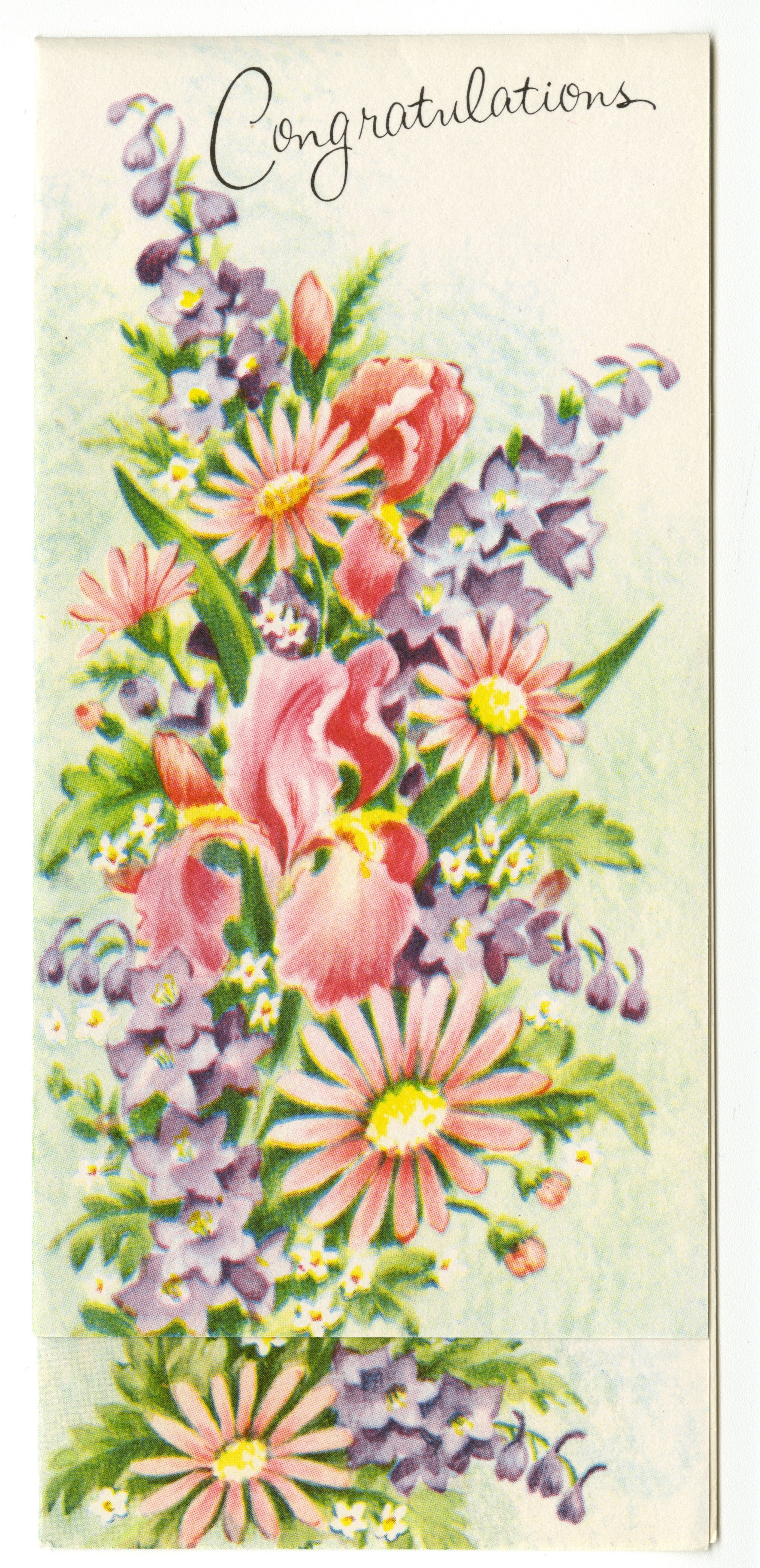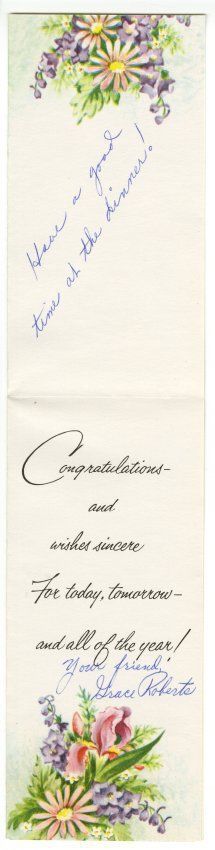 b: Letter. Flowers in pink and purple, "Congratulations" written across the top. Inside, typed, "Congratulations - and wishes sincere For today, tomorrow - and all of the year!" Handwritten: "Have a good time at the dinner! Your friend, Grace Roberts."Collection