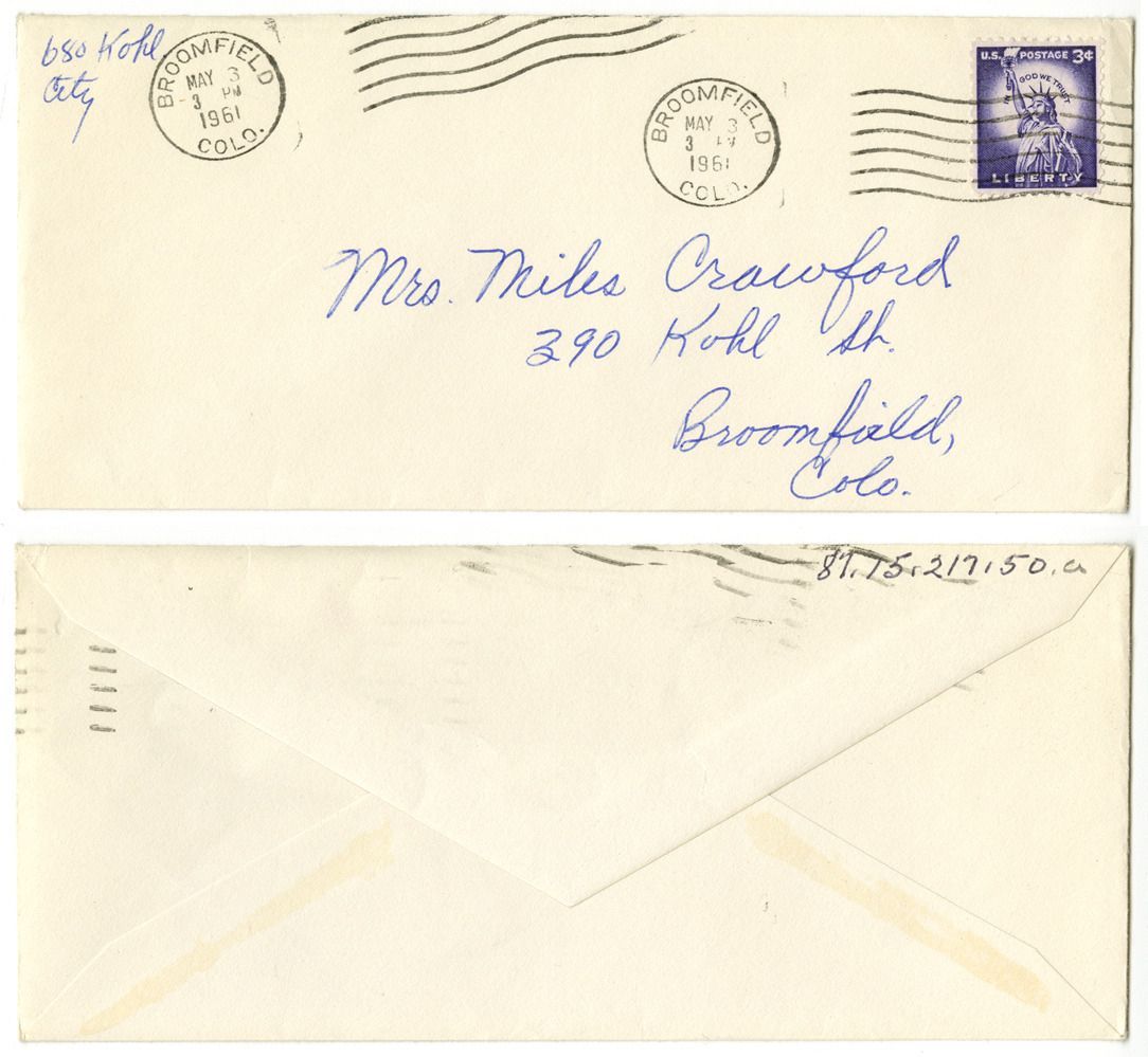 a: Envelope. Recipient Address: Mrs. Miles Crawford, 390 Kohl St. Broomfield, Colo.
