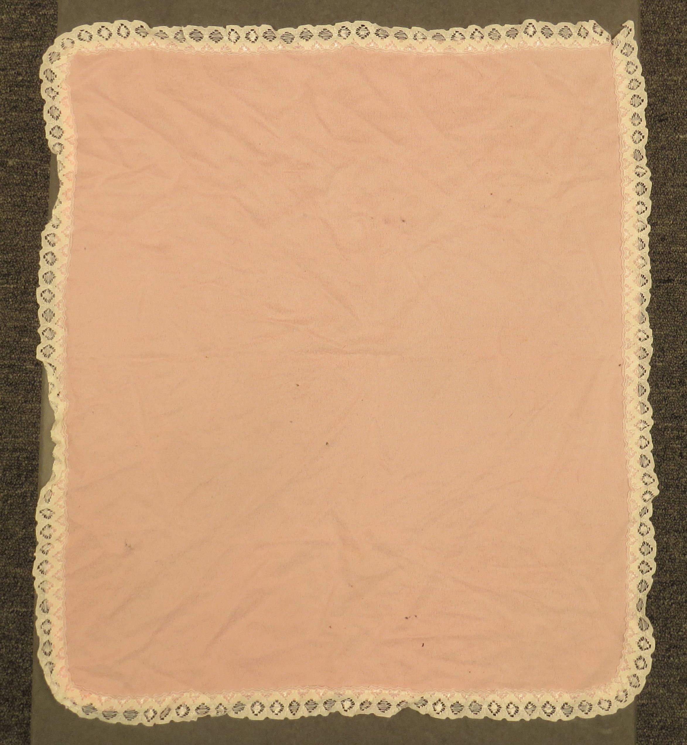 This is a pink blanket with a white lace border. The blanket measures 21" (w) x 21" (l). Note: This was recommended for disposal by Megan Huelman in October 2013 (TTempleman 06/30/2017).