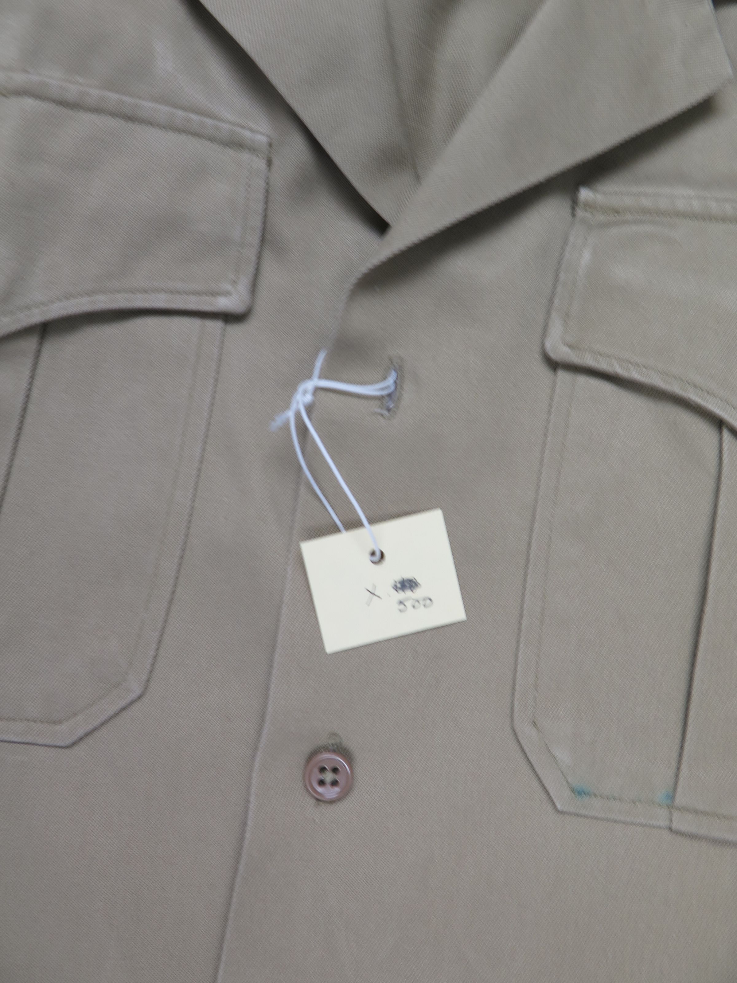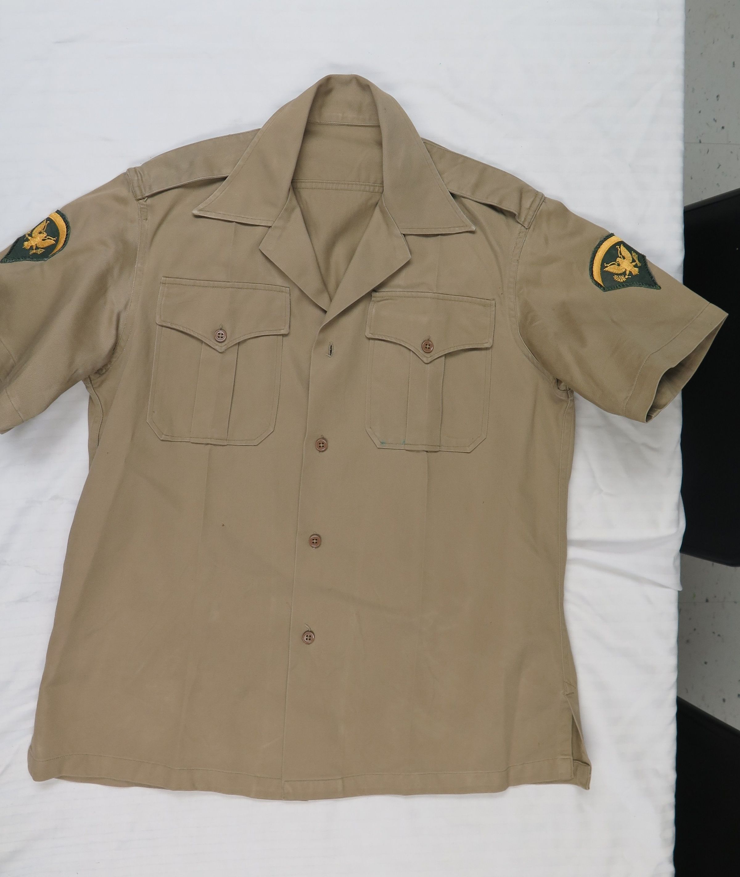Olive men's short sleeved button up military shirt. There are two patches on the shoulders of shirt. The patches are green with gold details of an eagle eating a snake. The shirt measures 17" (w) x 30" (l).