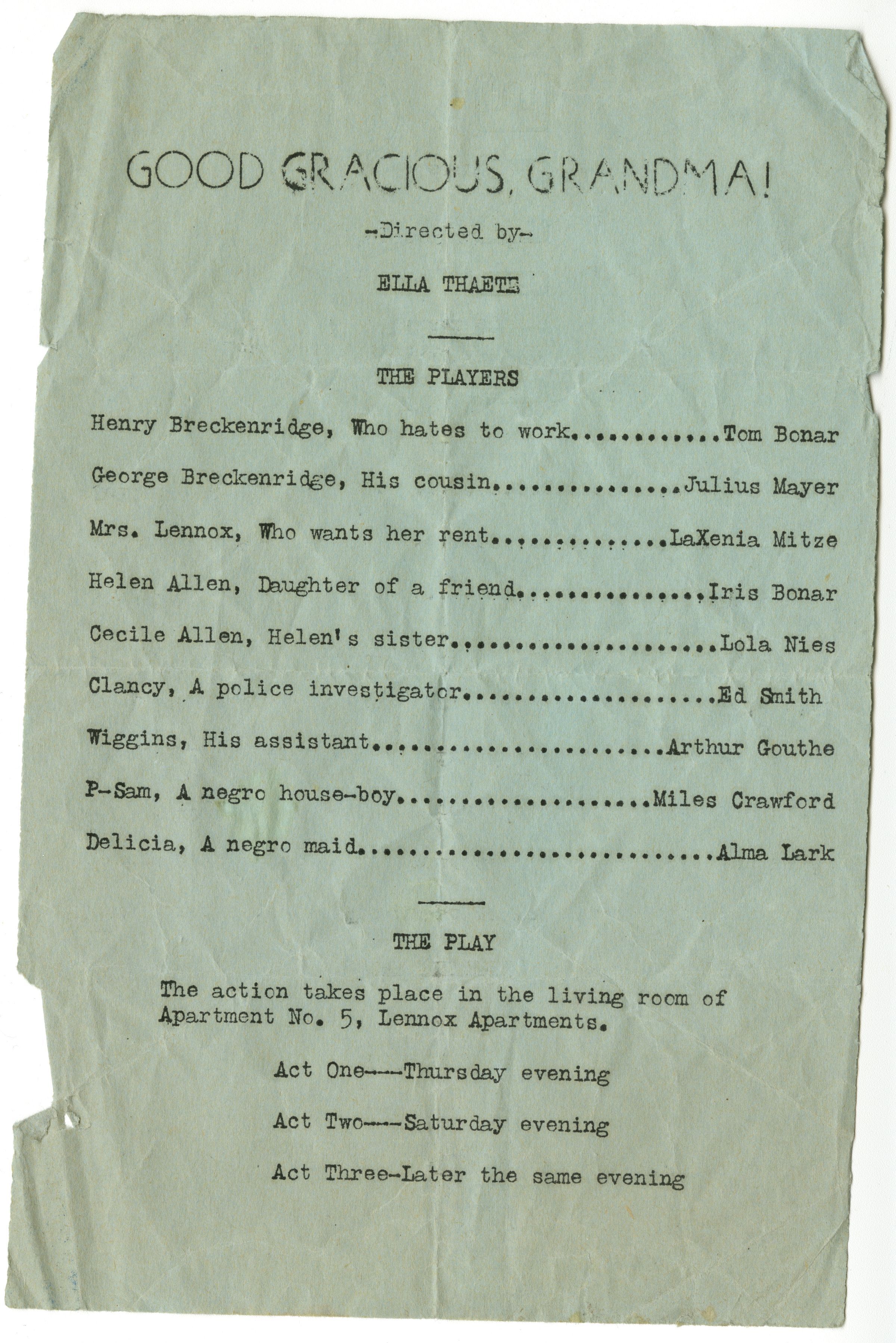 Paper is blue, one-sided. Directed by Ella Thaete. Players and roles are listed. The setting of all three acts is listed at the bottom.Collection