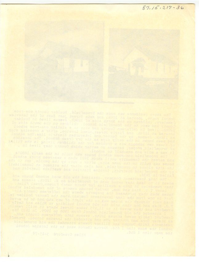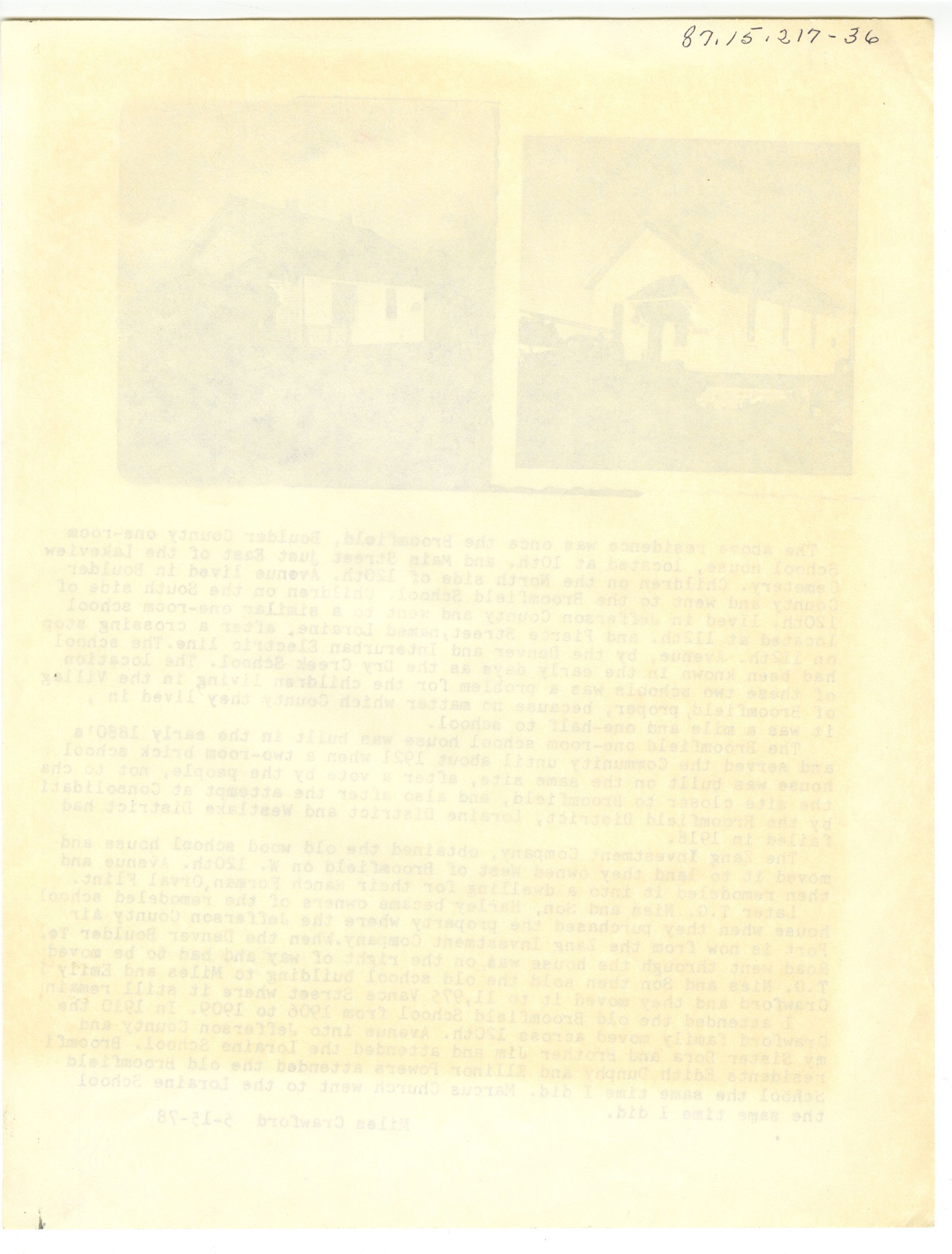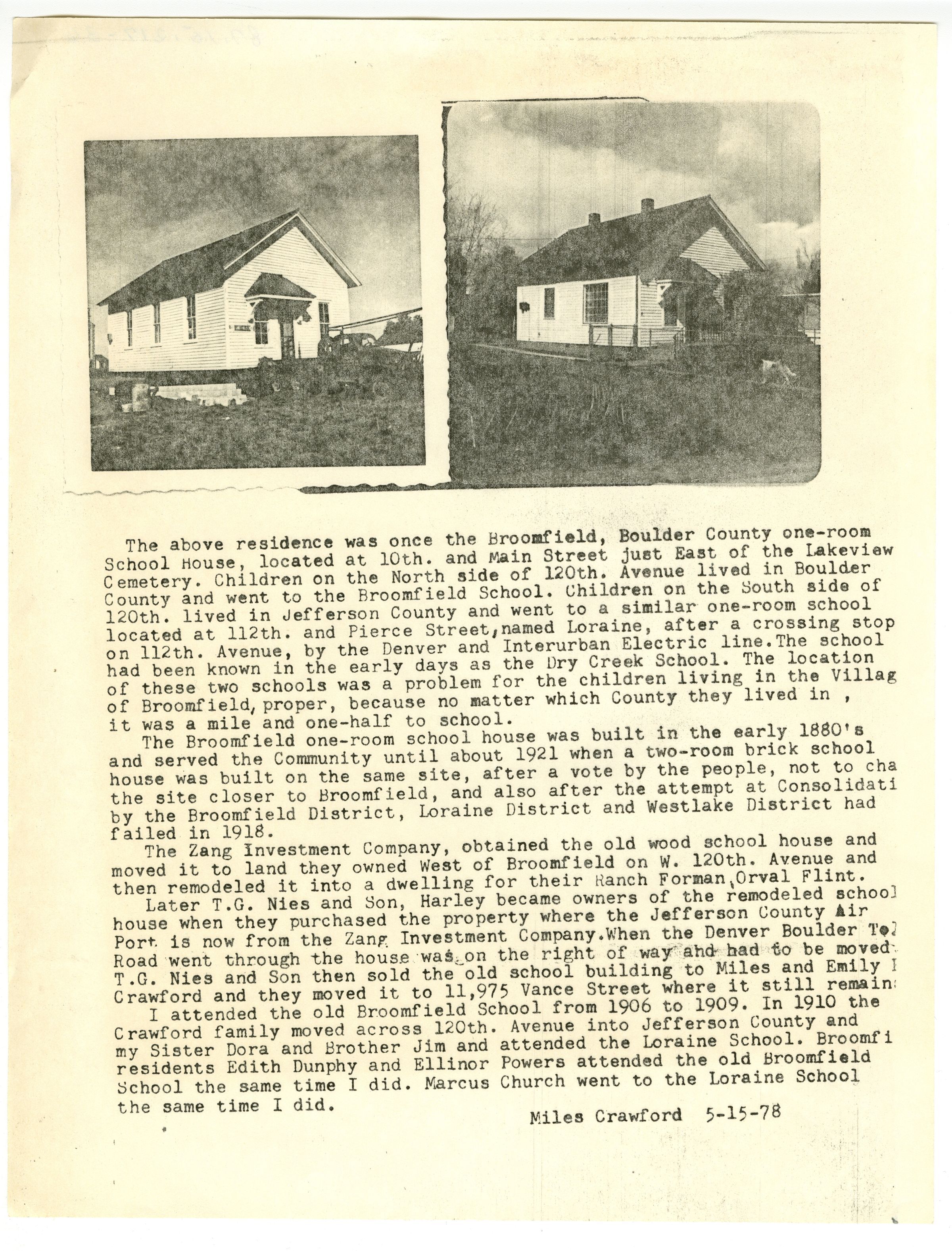 Two black and white photocopies of the Broomfield School House. Below these are 5 paragraphs, typed, by Miles Crawford, explaining the history of the building. Crawford had both attended the school and owned the building at one point. At bottom, typed, "Miles Crawford 5-15-78"Collection