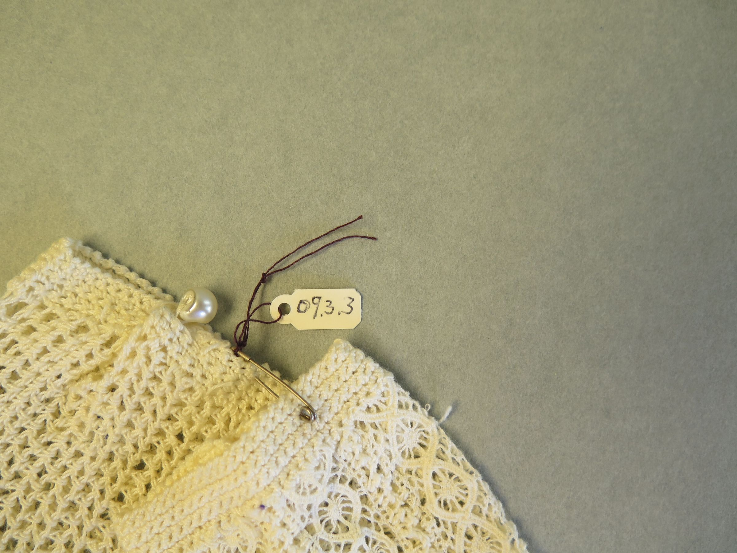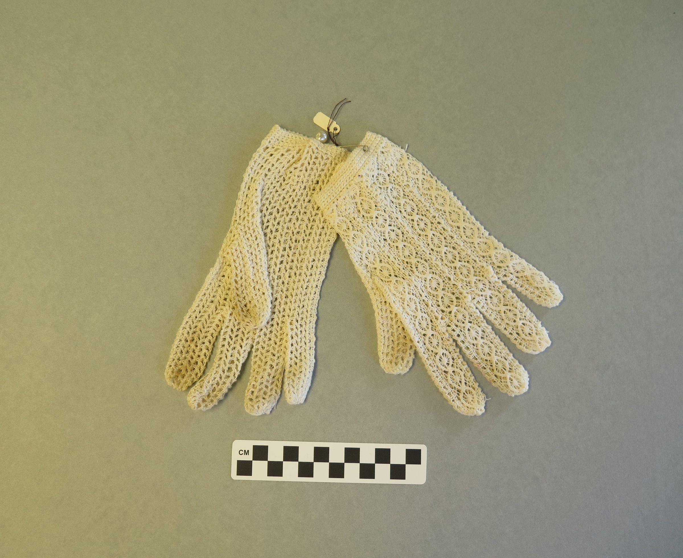 White wrist length women's lace gloves. There is a pearl button on the back of each wrist to close the gloves. The gloves measure 4" (w) x 7.5" (l).