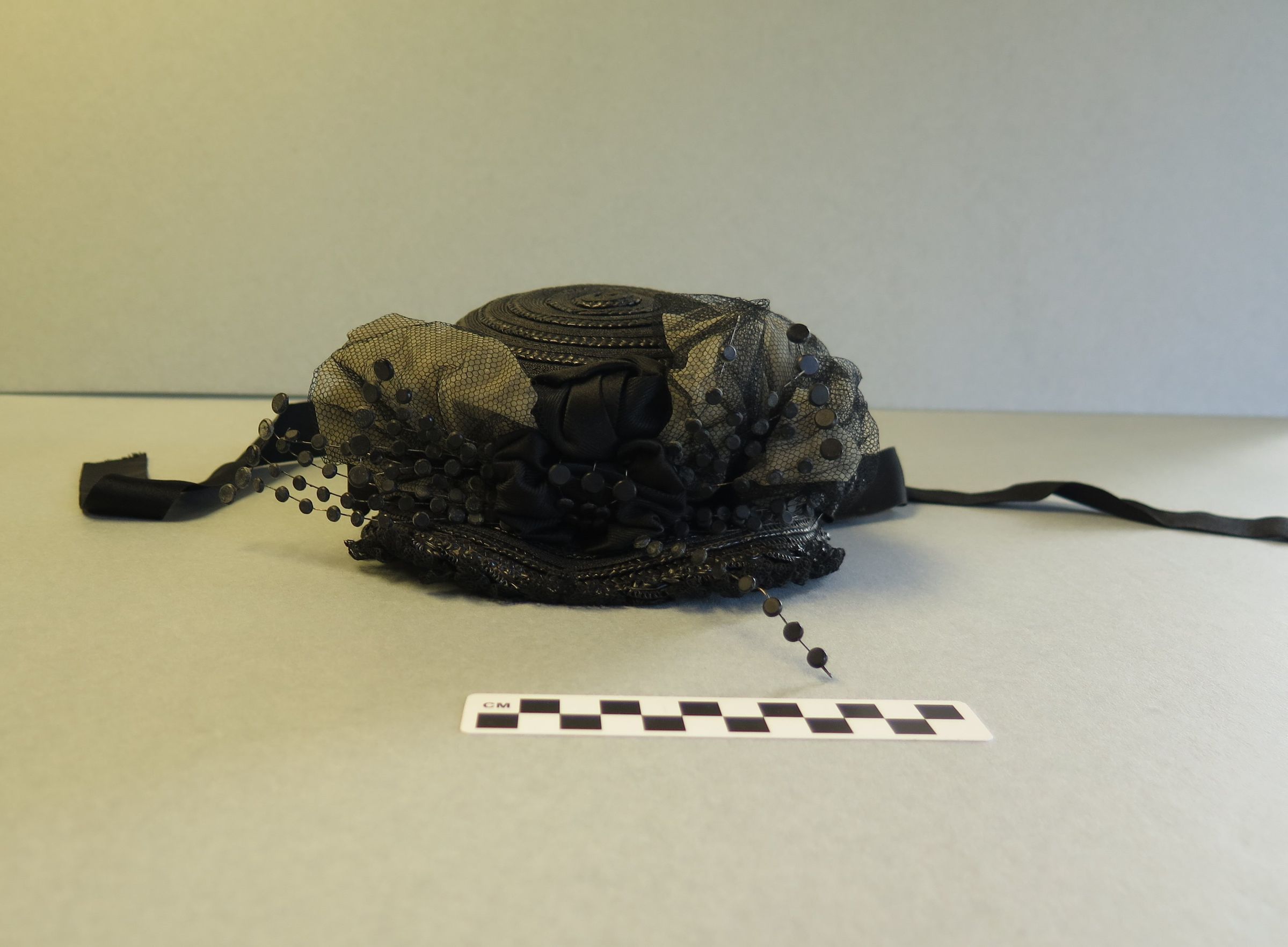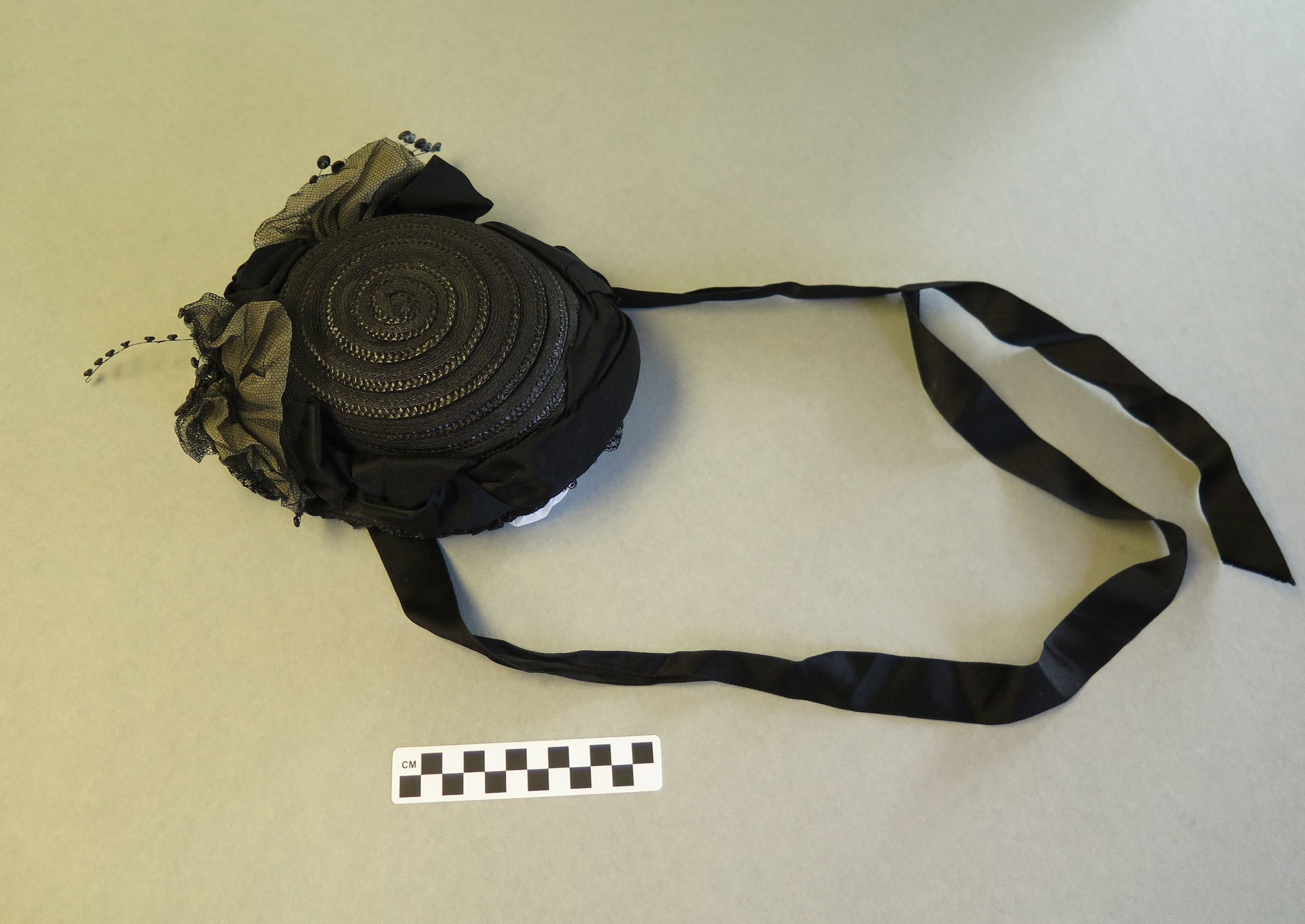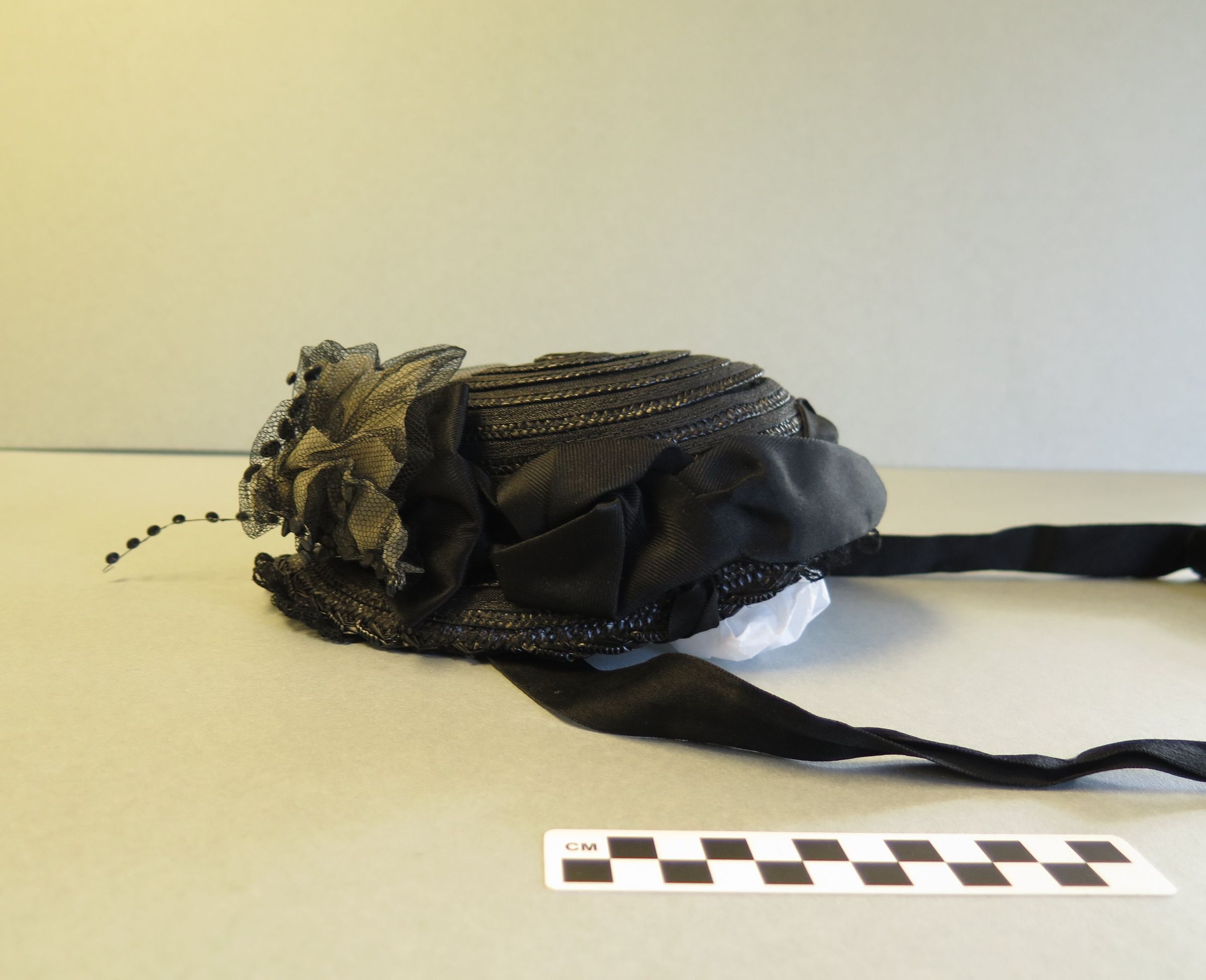 Black woven women's hat with black satin ribbon around the edges and two satin ribbons at the bottom to tie under the chin. The back of the hat has a grey satin bow covered in black lace and a black satin flower. There are black plastic details coming off the center of the bow. The hat measures 4.5" (w) x 9" (l).
