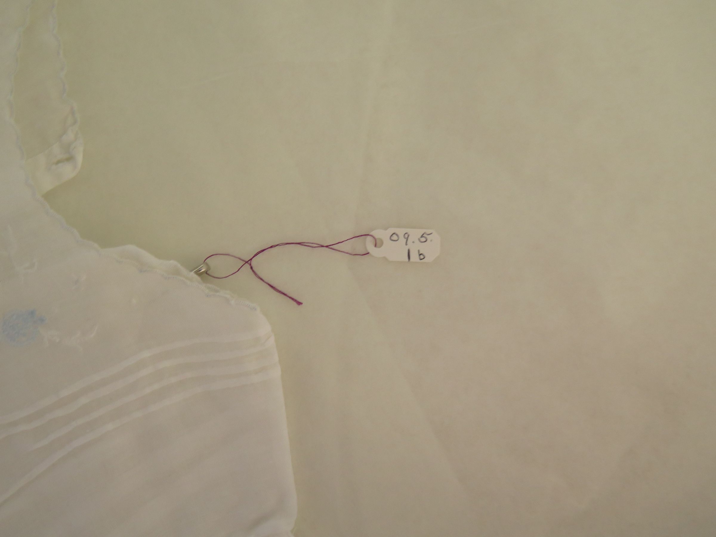 Baby's white dress with blue floral embroidery at the neckline. The dress as scalloped edges along the bottom. The dress is c. 1910. The dress measures 14" (w) x 18" (l).