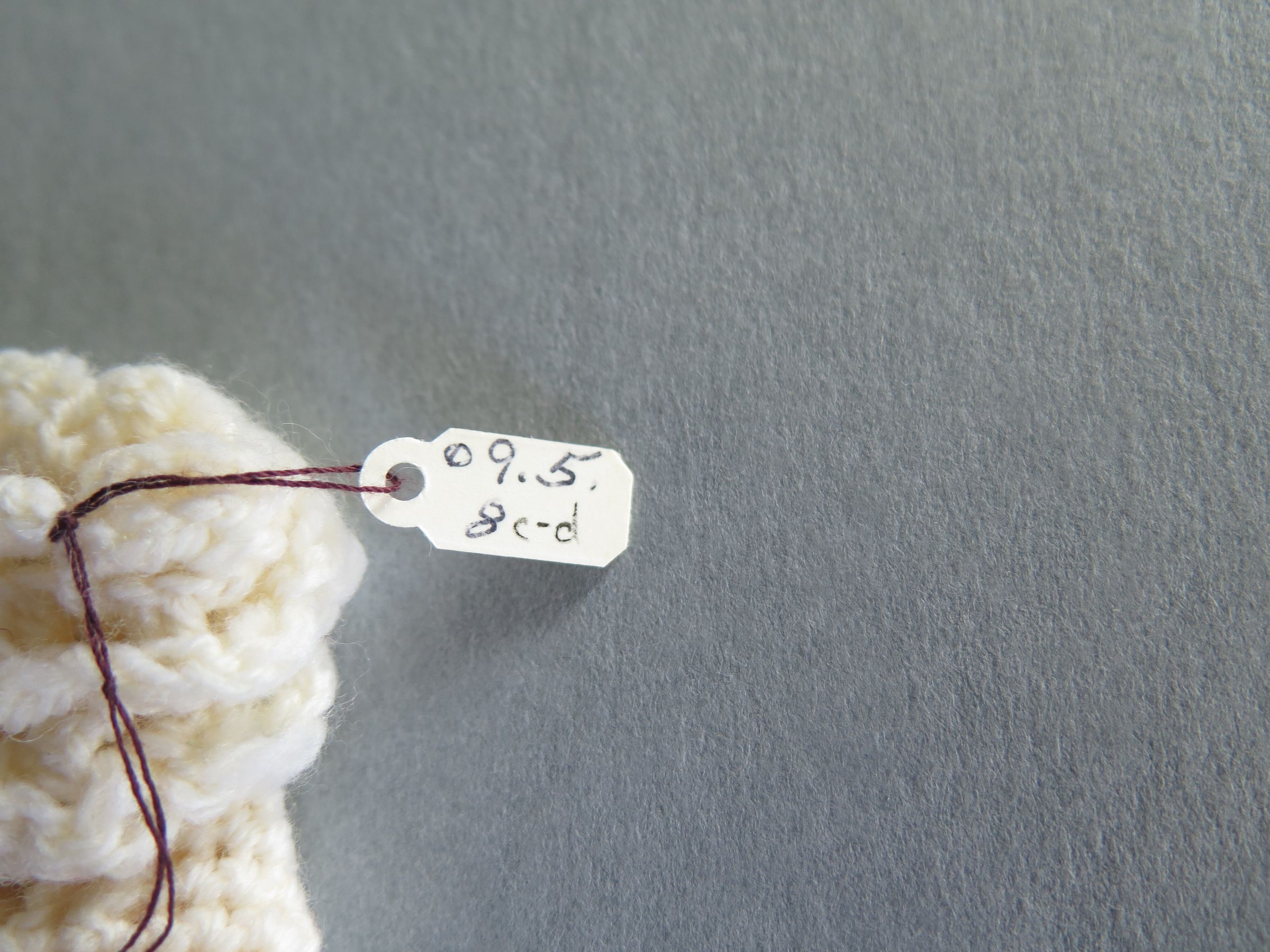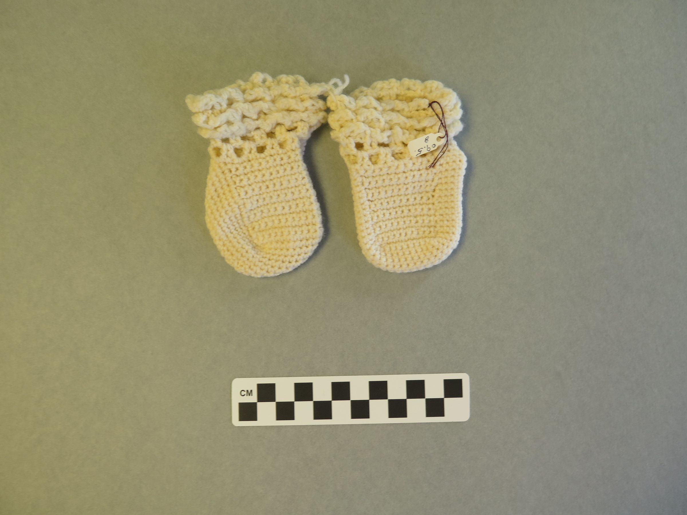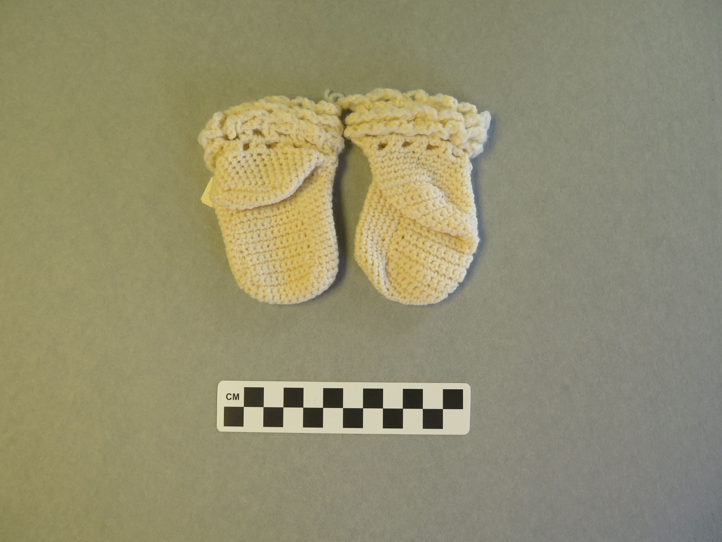 Crochet off-white baby booties, c. 1910. The booties measure 2" (w) x 4" (l).