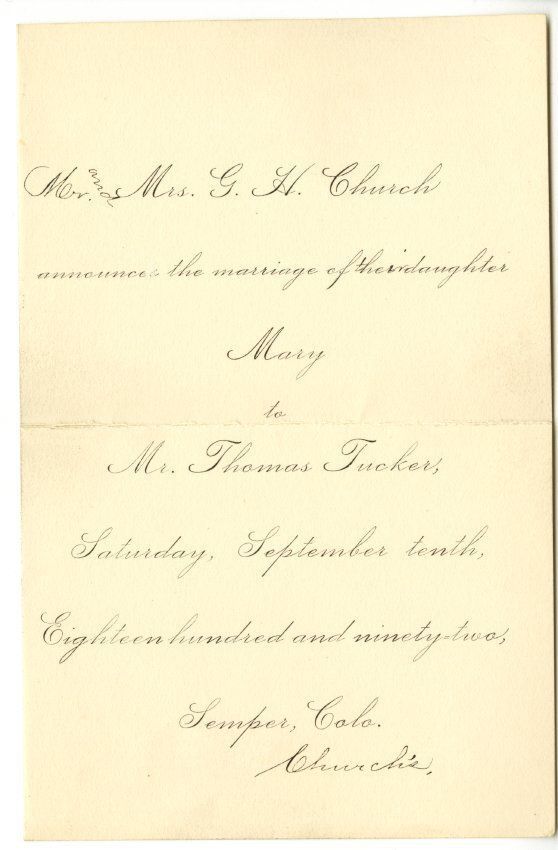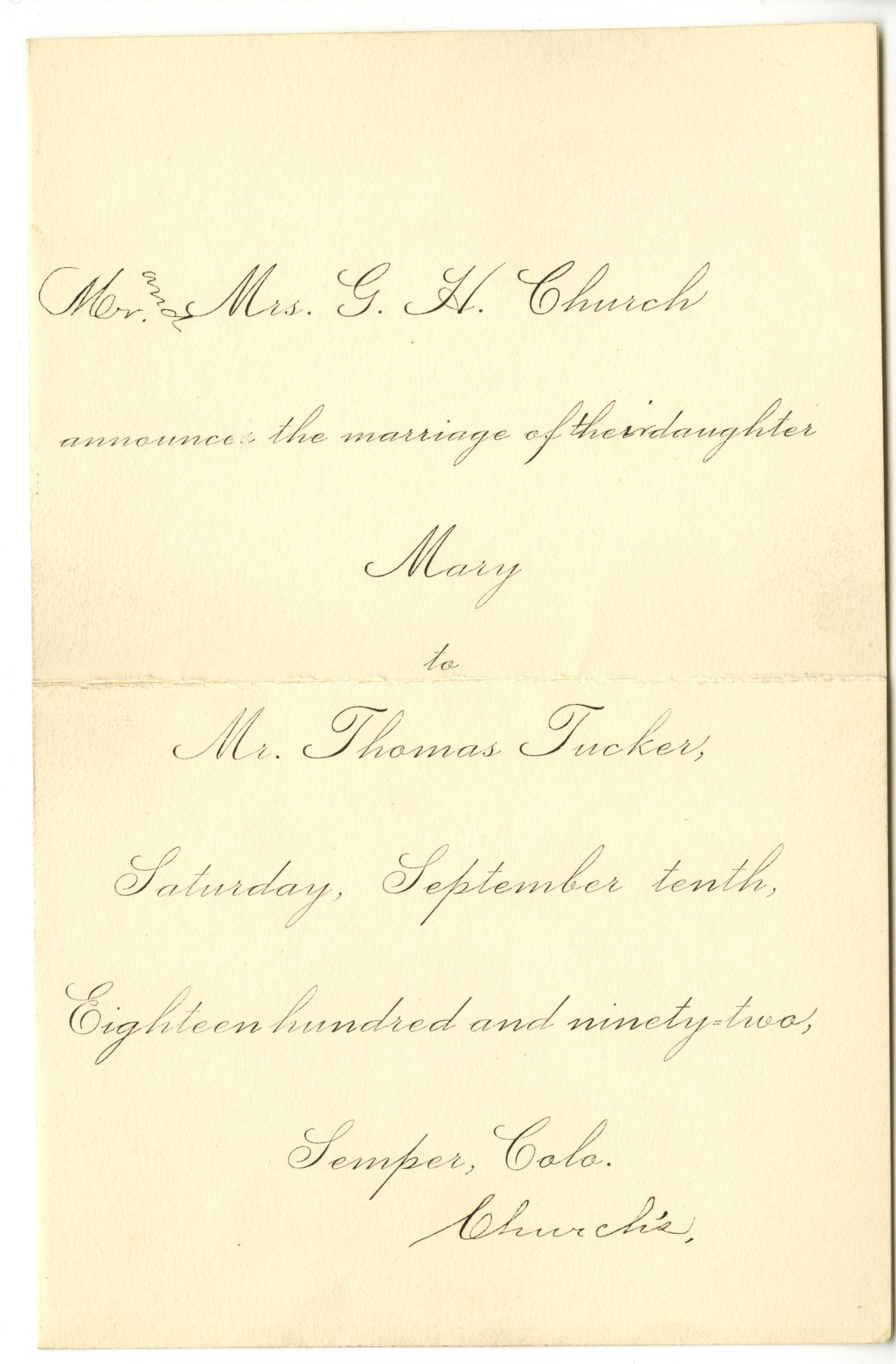 Announcement: "Mr. And Mrs. G. H. Church announce the marriage of their daughter Mary to Mr, Thomas Tucker, Saturday, September tenth, Eighteen hundred and nintety-two, Semper, Colo. Church's."