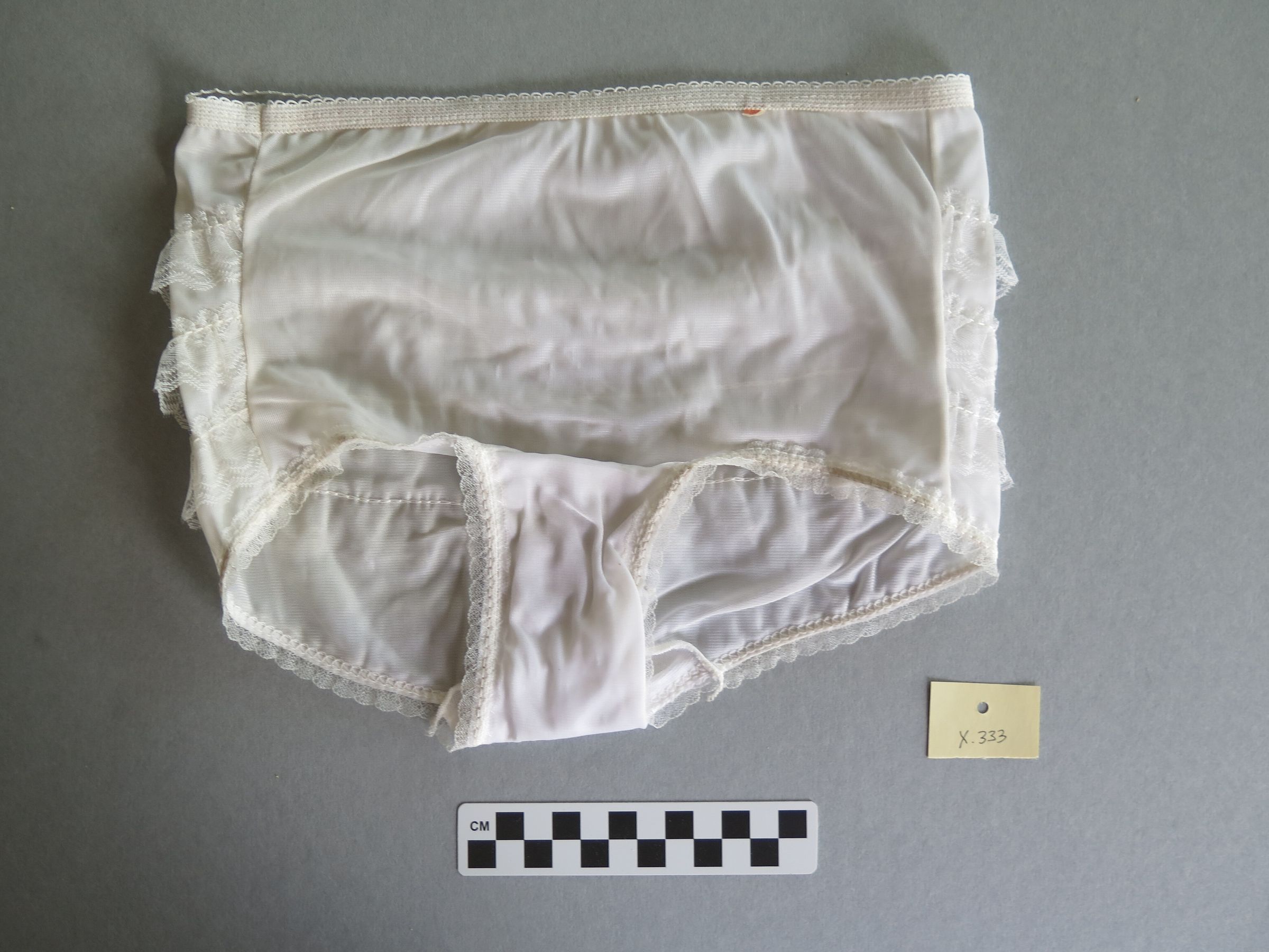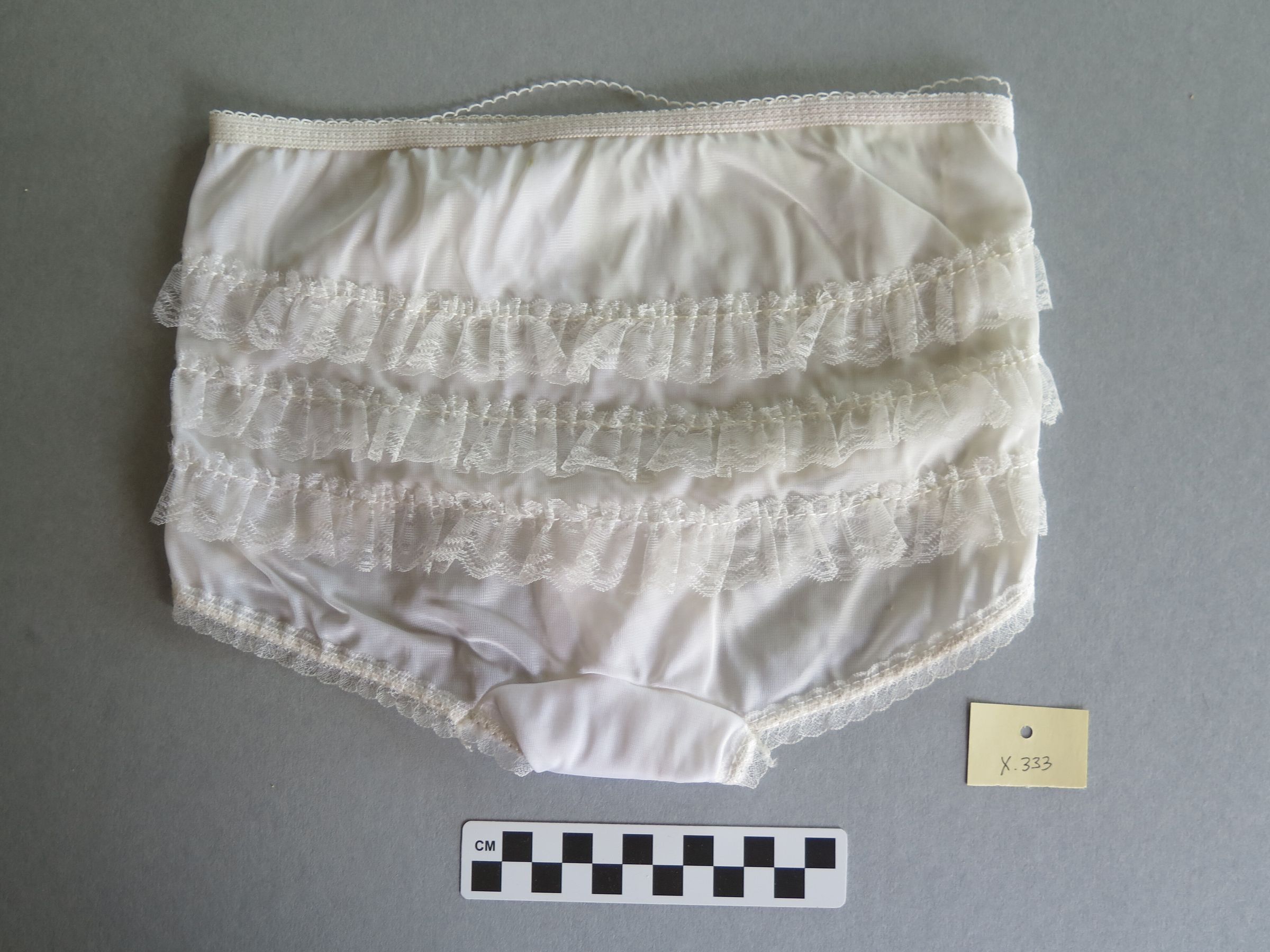 White women's panties with a white lace trim along the edges. There are white lace ruffles on the back of the panties of the same white lace trim. The panties measure 9" (w) x 10" (l).