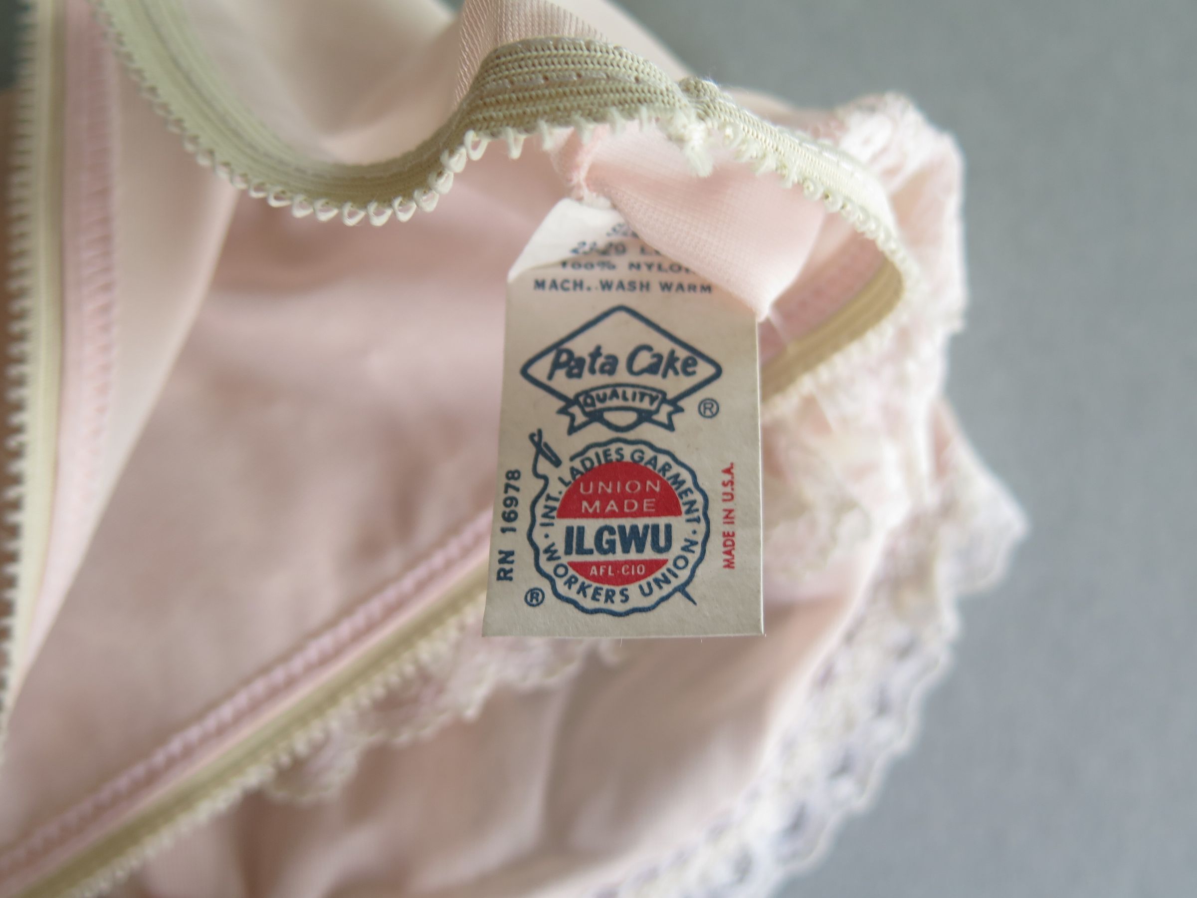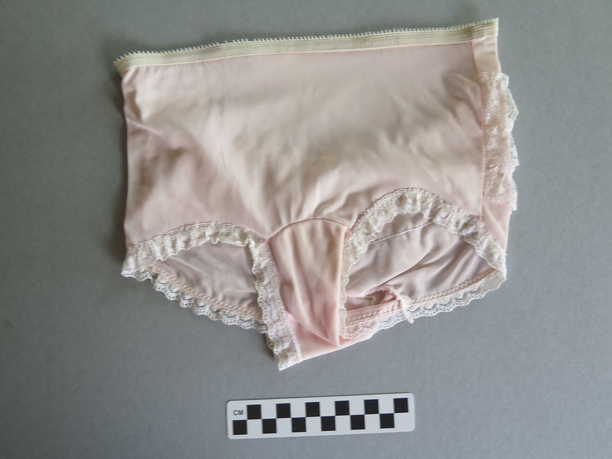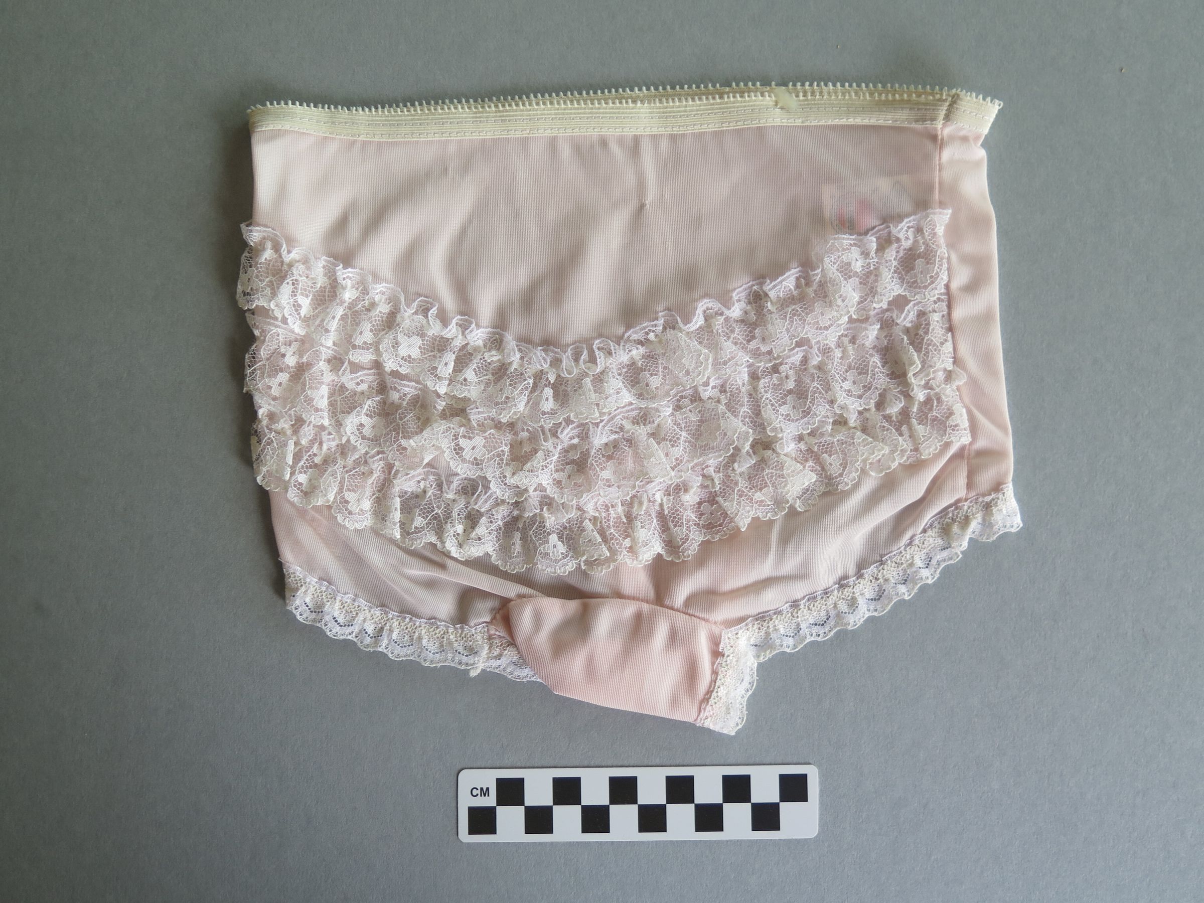 Pink women's panties with a white lace trim along the edges. There are white lace ruffles on the back of the panties of the same white lace trim. The panties measure 9" (w) x 10" (l).