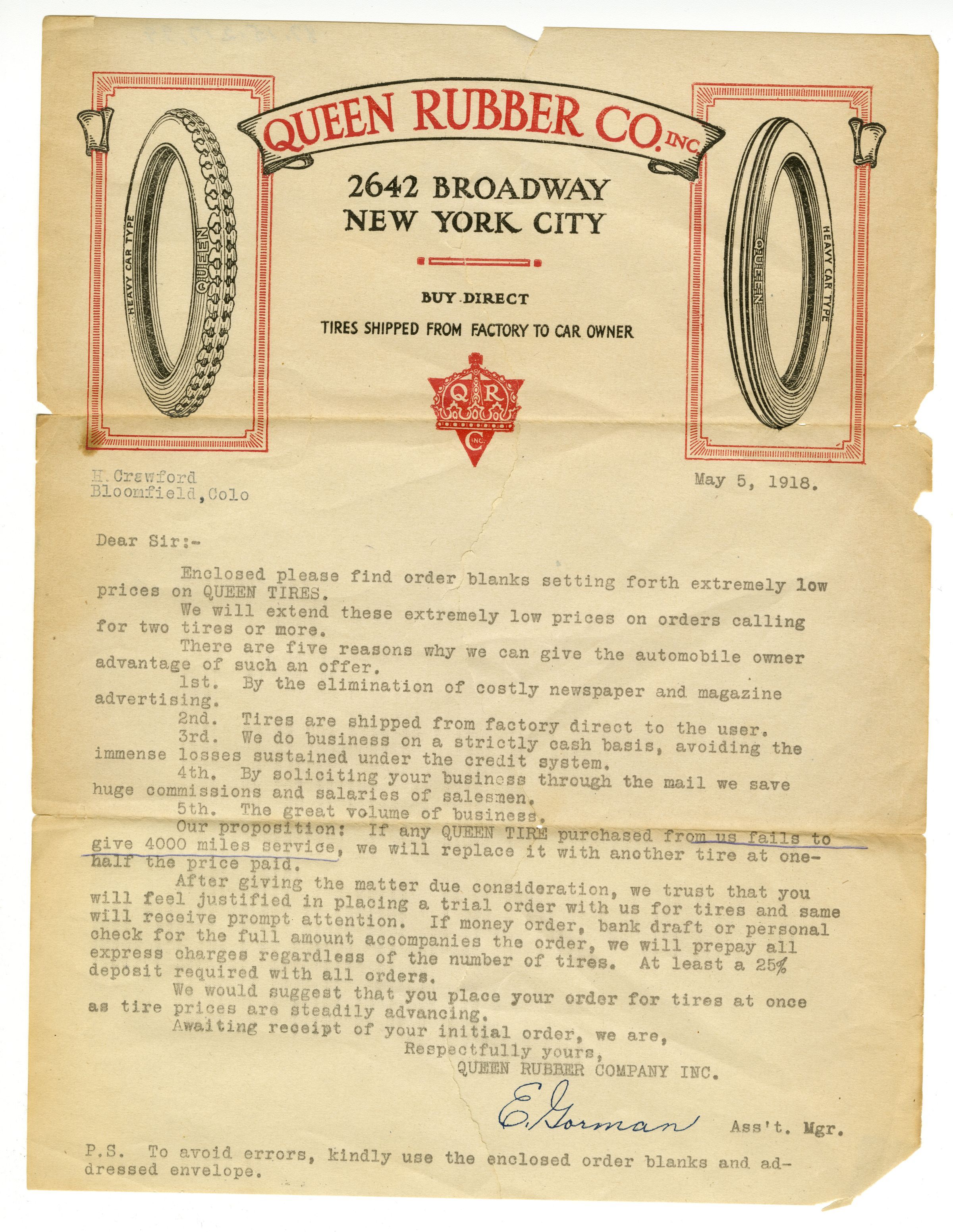 An ad from Queen Rubber Co. addressed to H. Crawford of "Bloomfield, Colo." [sic]