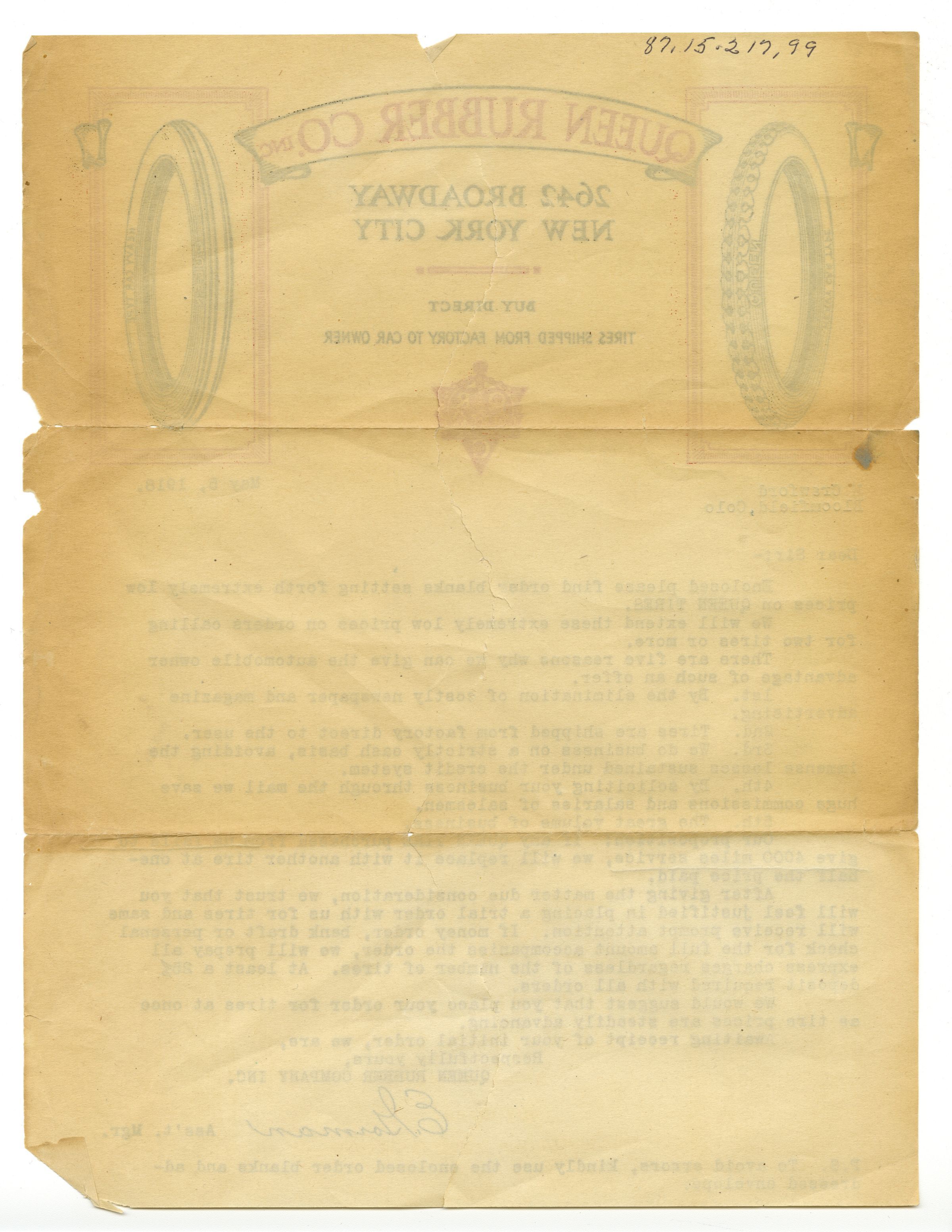 "Queen Rubber Co. Inc., 2642 Broadway, New York City. Buy Direct, Tires Shipped from Factory to Car Owner" A little red logo: QRC, with a crown. The ad has two prints of tires in the top corners, surrounded by red boxes.