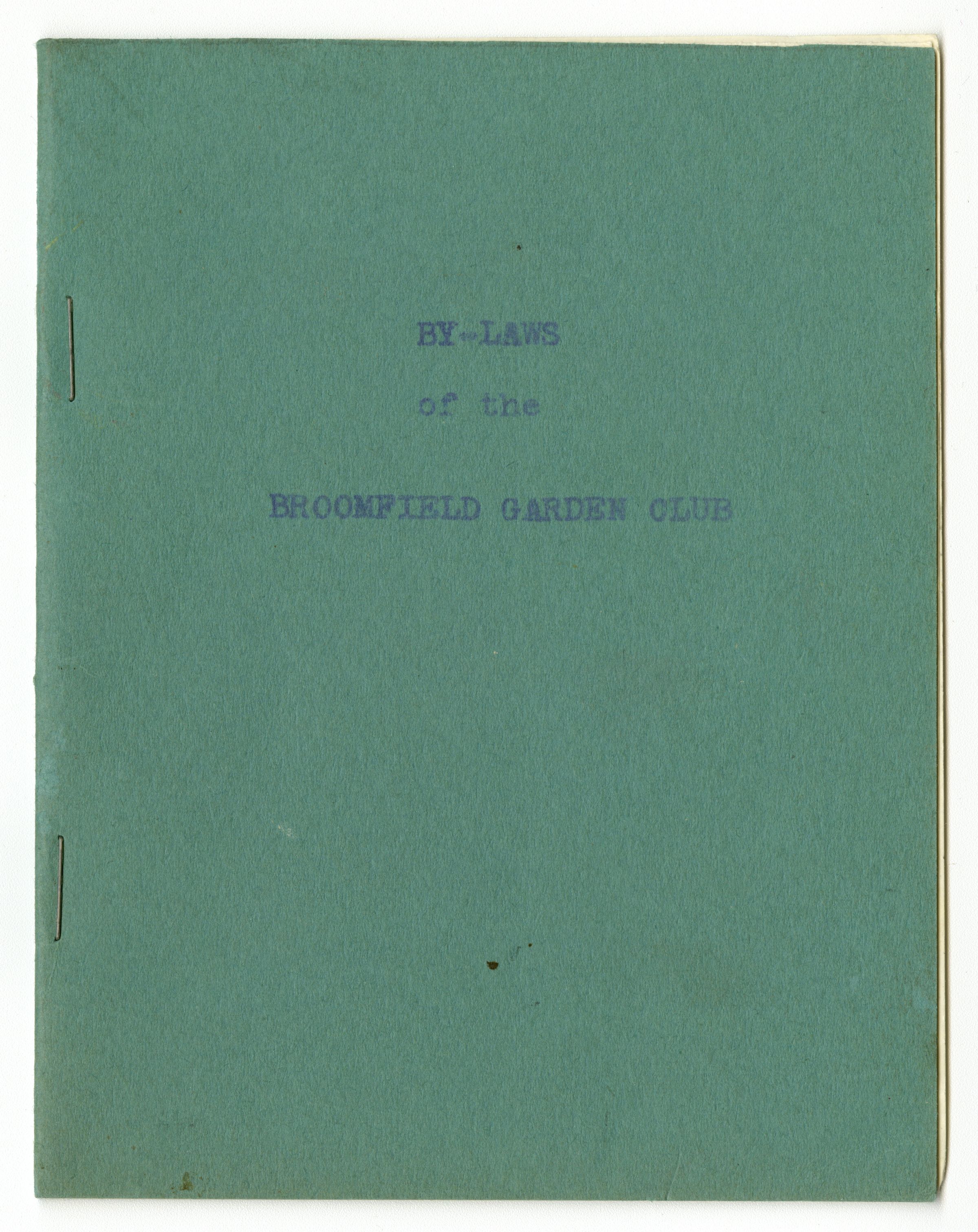 By-laws of the Broomfield Garden Club. Green booklet, 8 pages. Torn page in middle, unsure what is missing.Collection