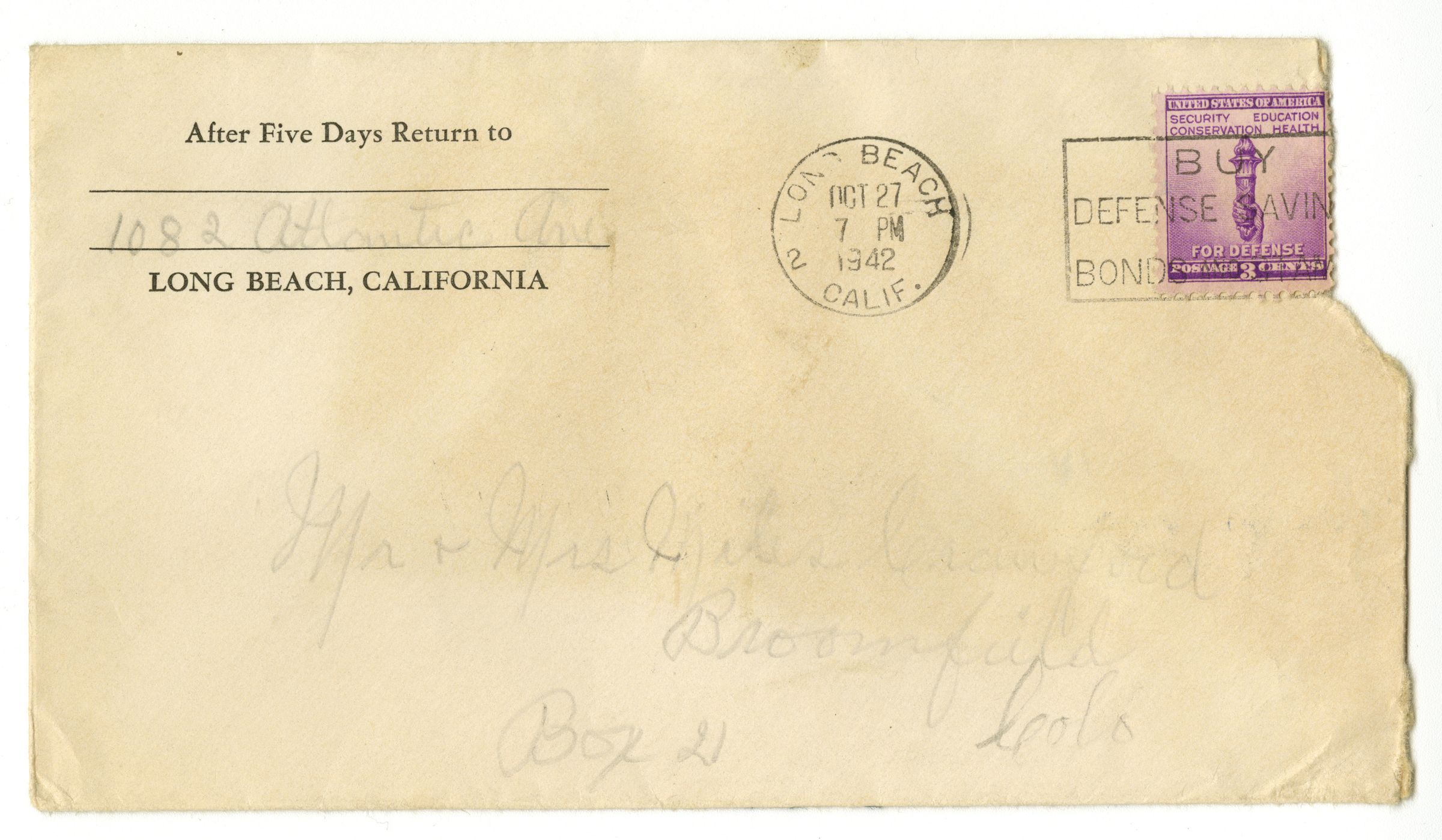 Envelope addressed to "Mr + Mrs Miles Crawford, Broomfield Colo, Box 21."