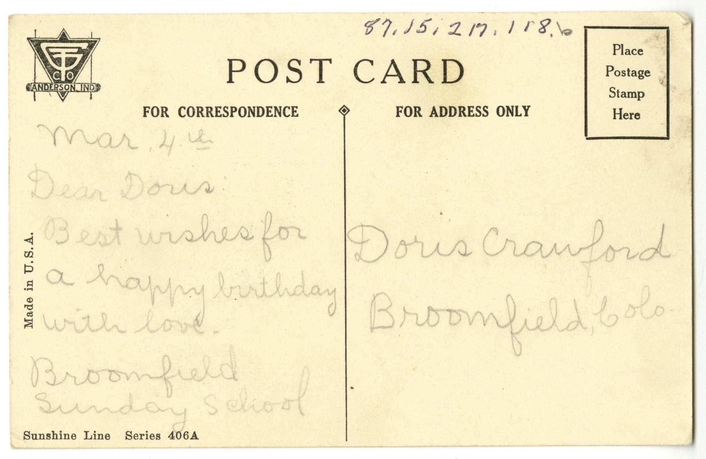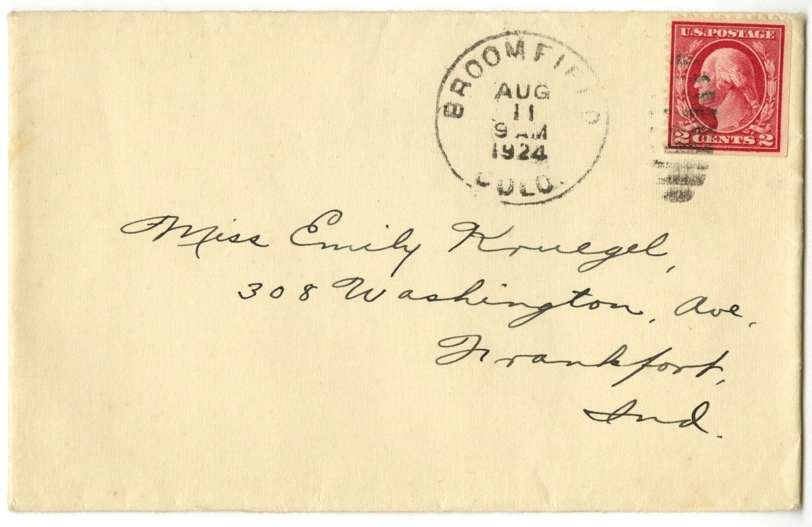 Envelope, addressed to "Miss Emily Kruegel, 308 Washington Ave, Frankfort, Ind." Postage stamp, red, 2c. Postal stamp, Broomfield Colo, Aug 11, 1924.Collection