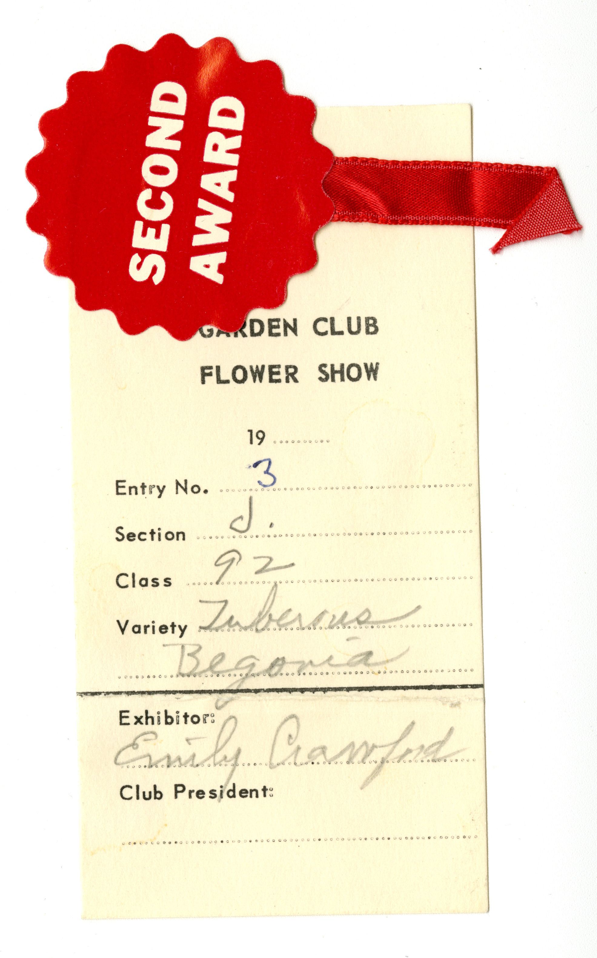 Entry card for Garden Club Flower Show. Giant red sticker with little red ribbon says "Second Award." "Entry no. 3. Section J. Class 92. Variety Tuberous Begonia. Exhibitor: Emily Crawford."