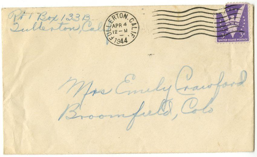 On front: 3c Postage stamp. Postal stamp from Fullerton, Calif, Apr 4, 1944.