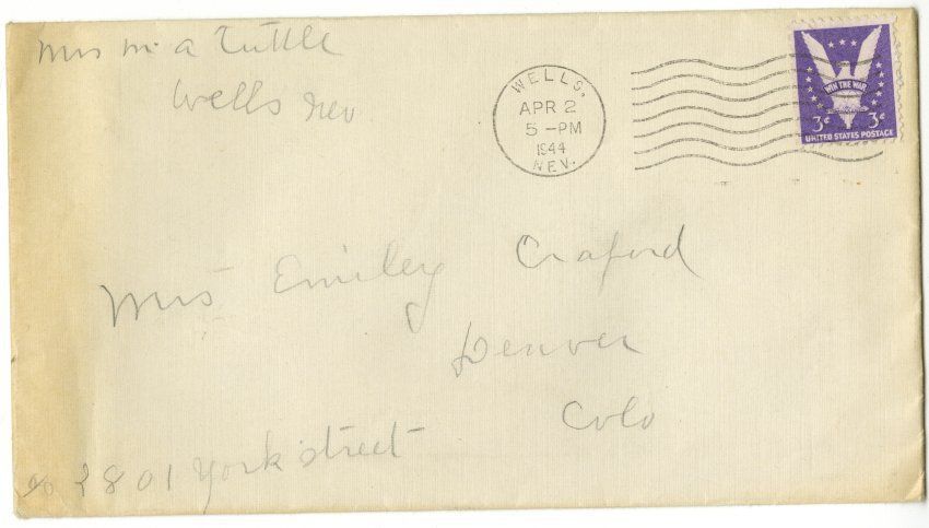 In bottom left corner: "% 2801 York Street" Also on front: a 3c postage stamp, and postal stamp from Wells, Nevada, Apr 2, 1944.