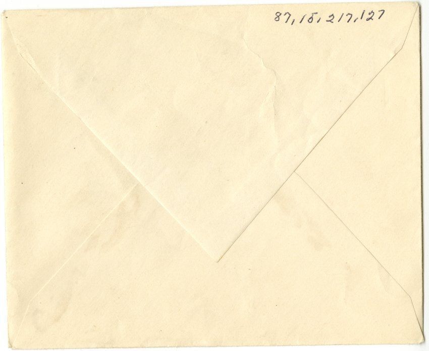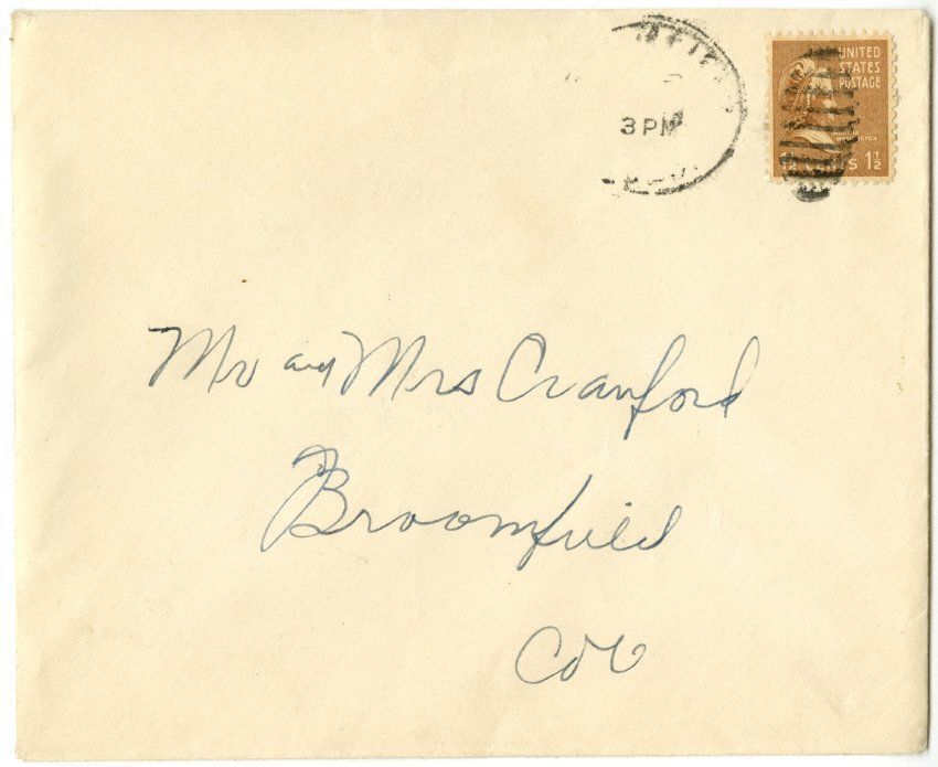 Envelope. Recipient address: "Mrs and Mrs Crawford. Broomfield, Colo." 1.5c postage stamp. Postal stamp, half missing.
