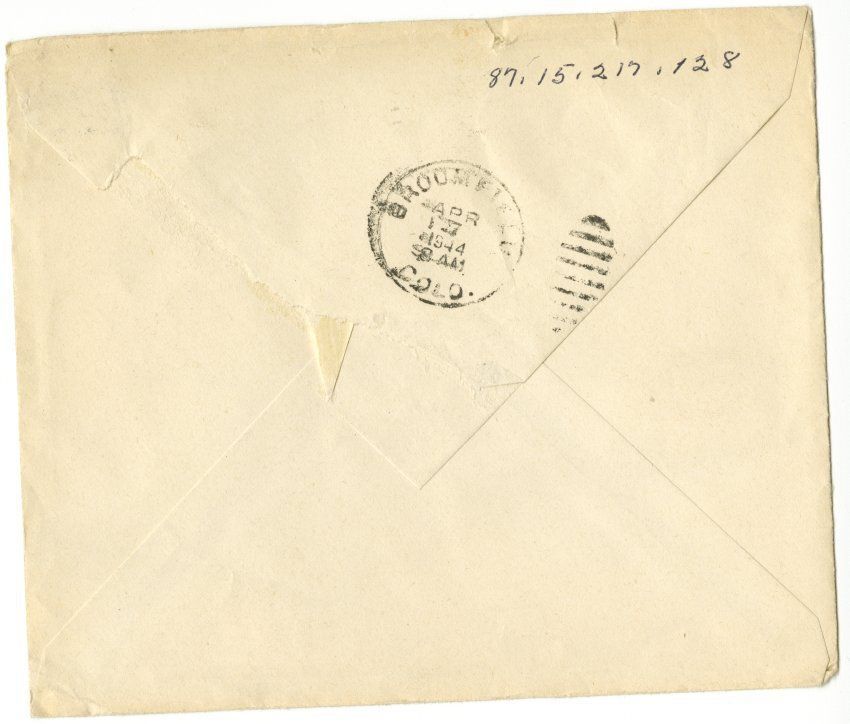 On front: 3c postage stamp. Postal stamp from Golden, Colo, Apr 6, 1944