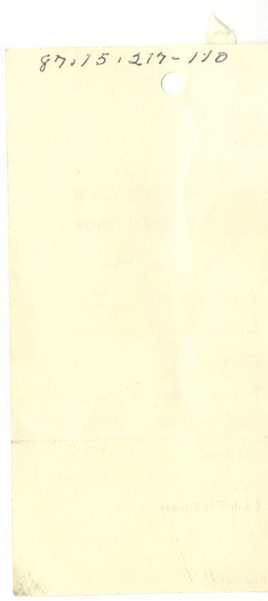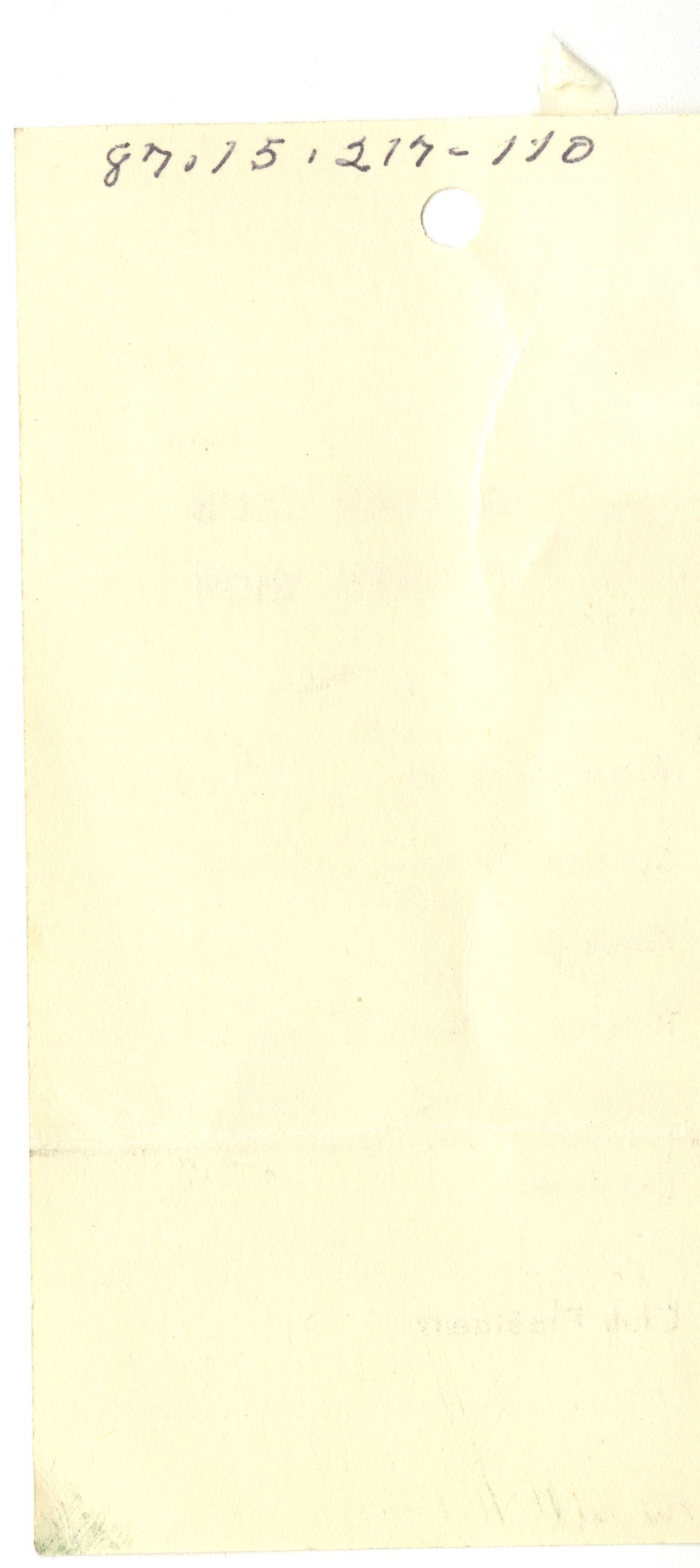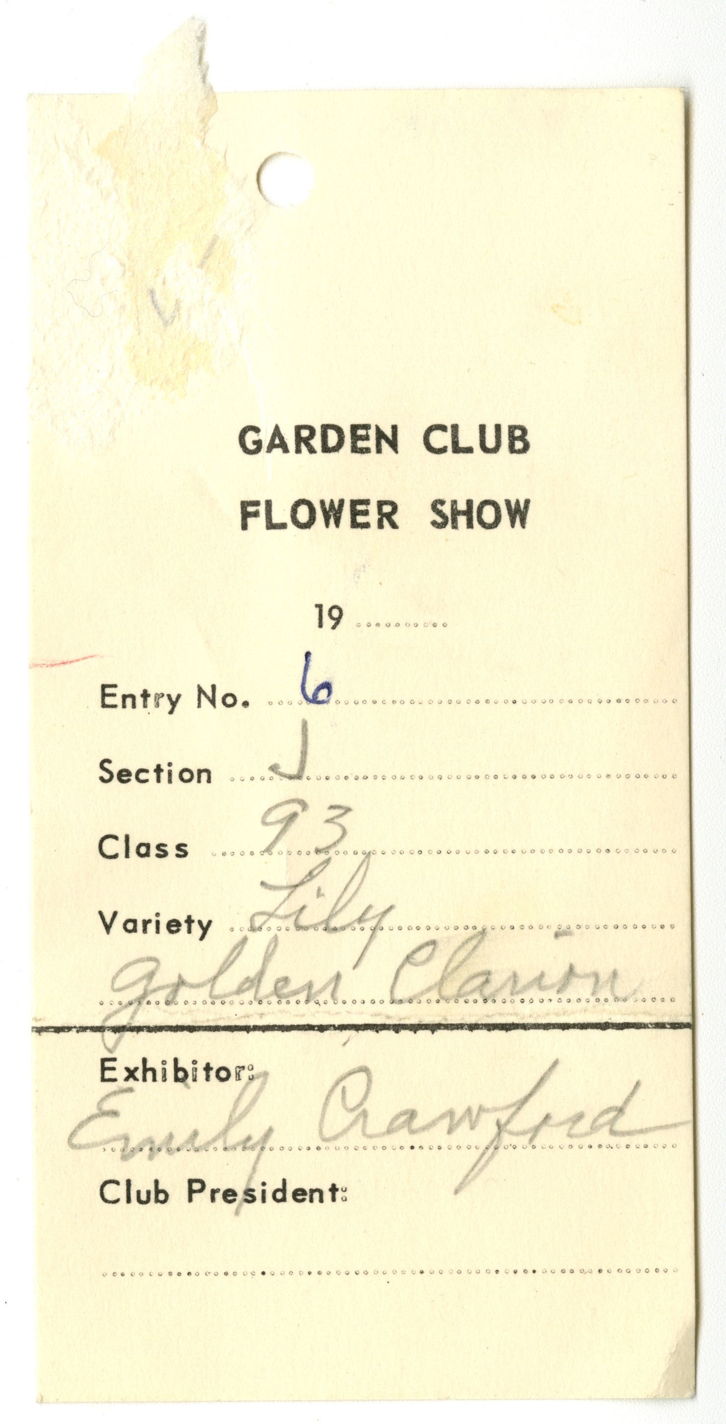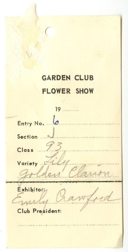 Award tag for the Garden Club Flower Show. Entry No. 6, Section J, Class 93, Variety Lily, Golden Clarion. Exhibitor: Emily Crawford. Award sticker missing.Collection