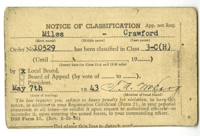Selective Service Notice of Classification for Miles Crawford.