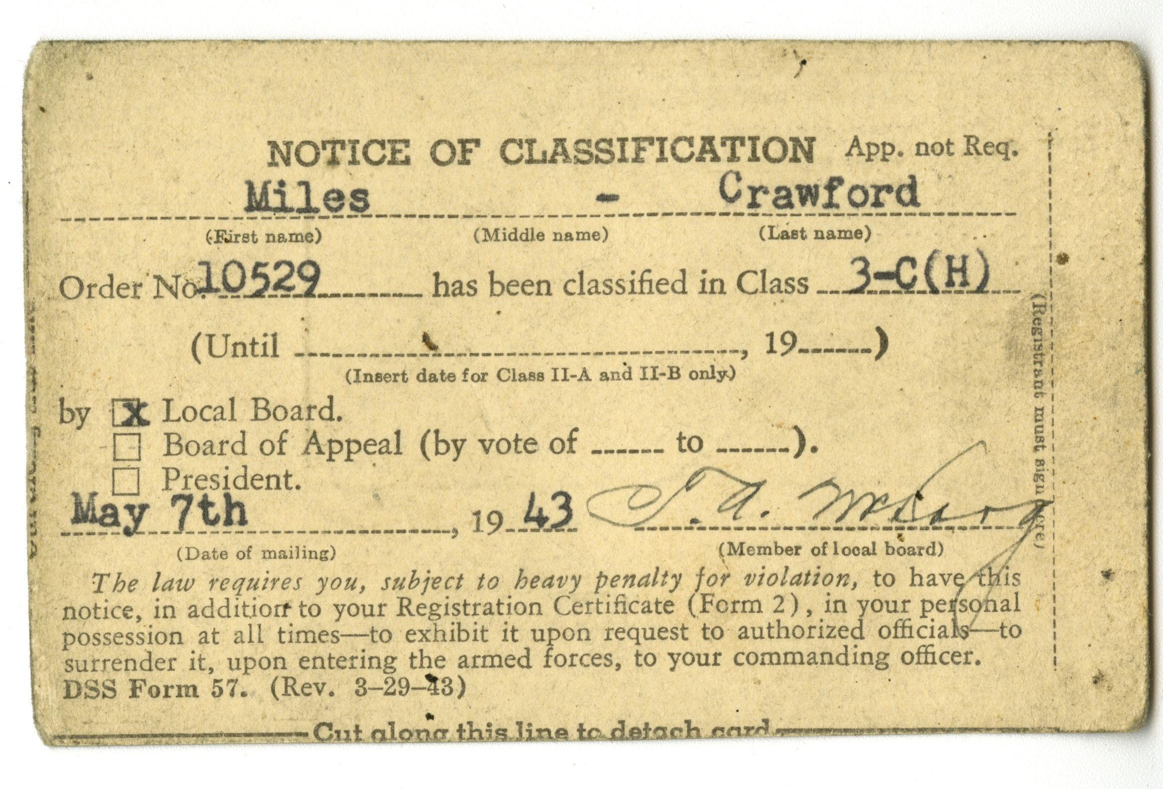 On front: Miles Crawford Order No. 10529, has been classified in Class 3-C(H). May 7th, 1943.
