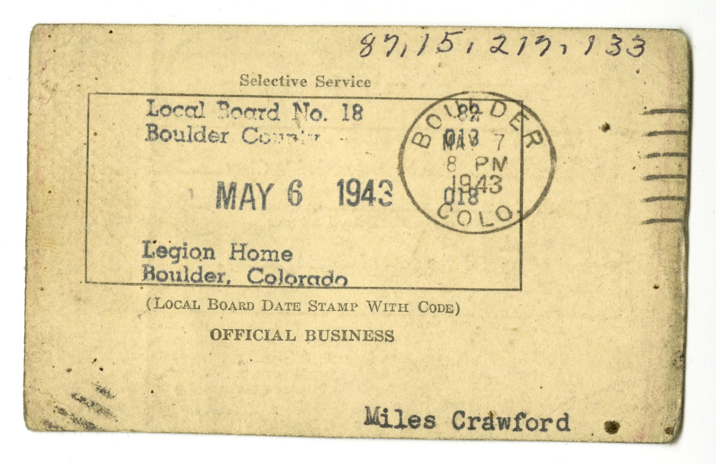 On back: Local Board No. 18, Boulder County. May 6, 1943. Legion Home, Boulder, Colorado. Stamp of Boulder Colo. May 7, 1943.Collection