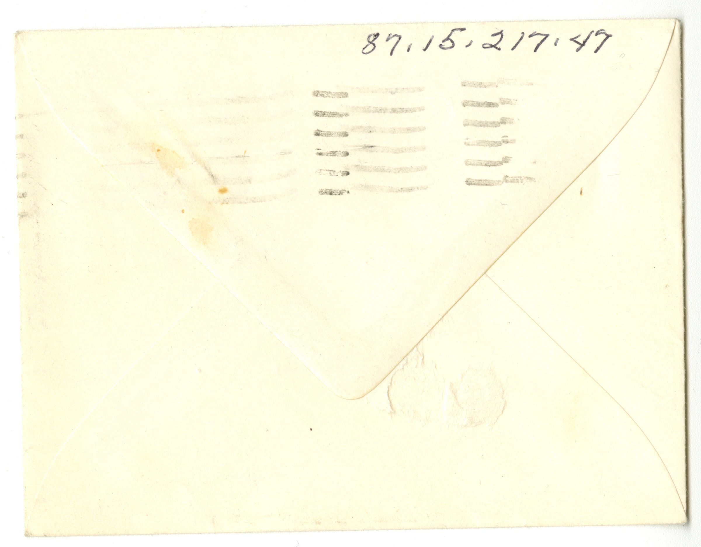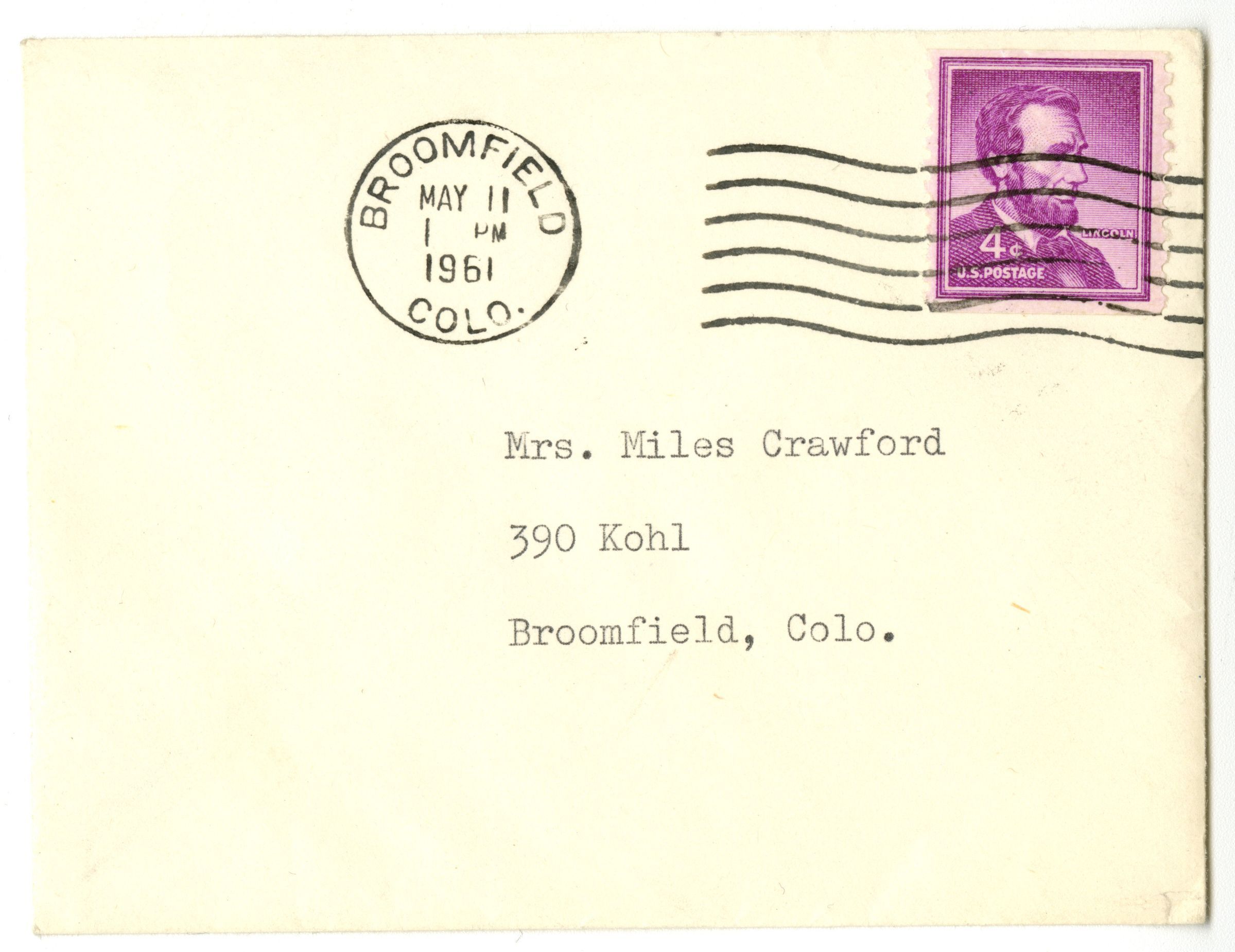 Envelope. Recipient address: Mrs. Miles Crawford, 390 Kohl, Broomfield, Colo. On front: 4c postage stamp. Postal stamp from Broomfield, May 11, 1961.