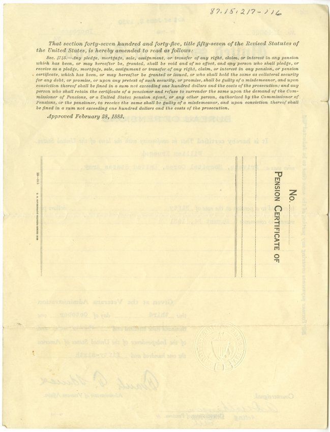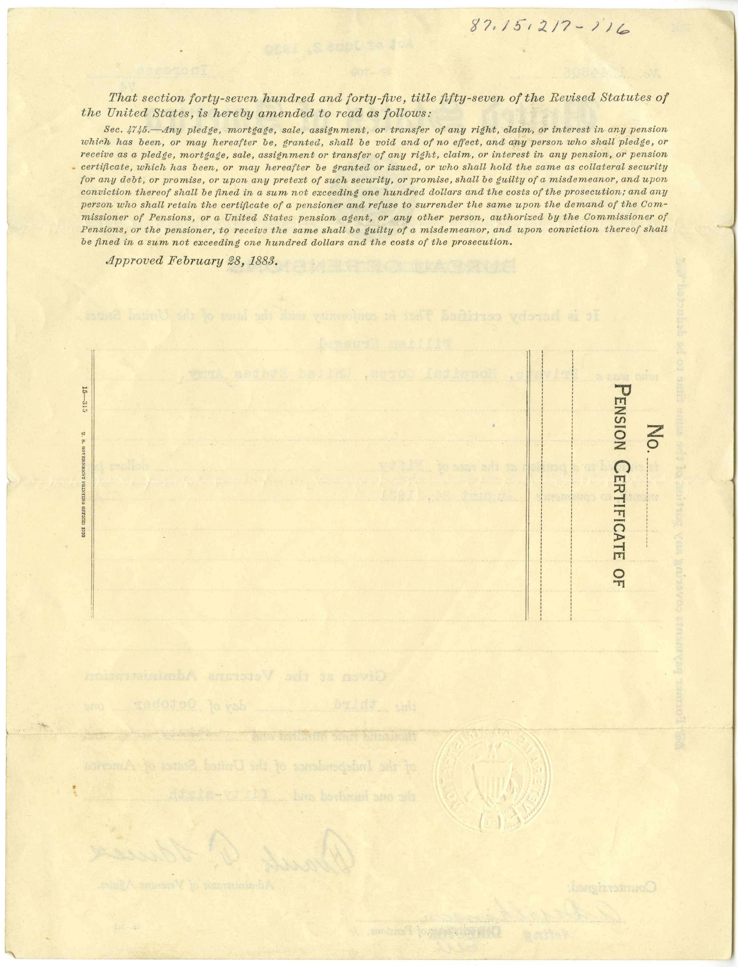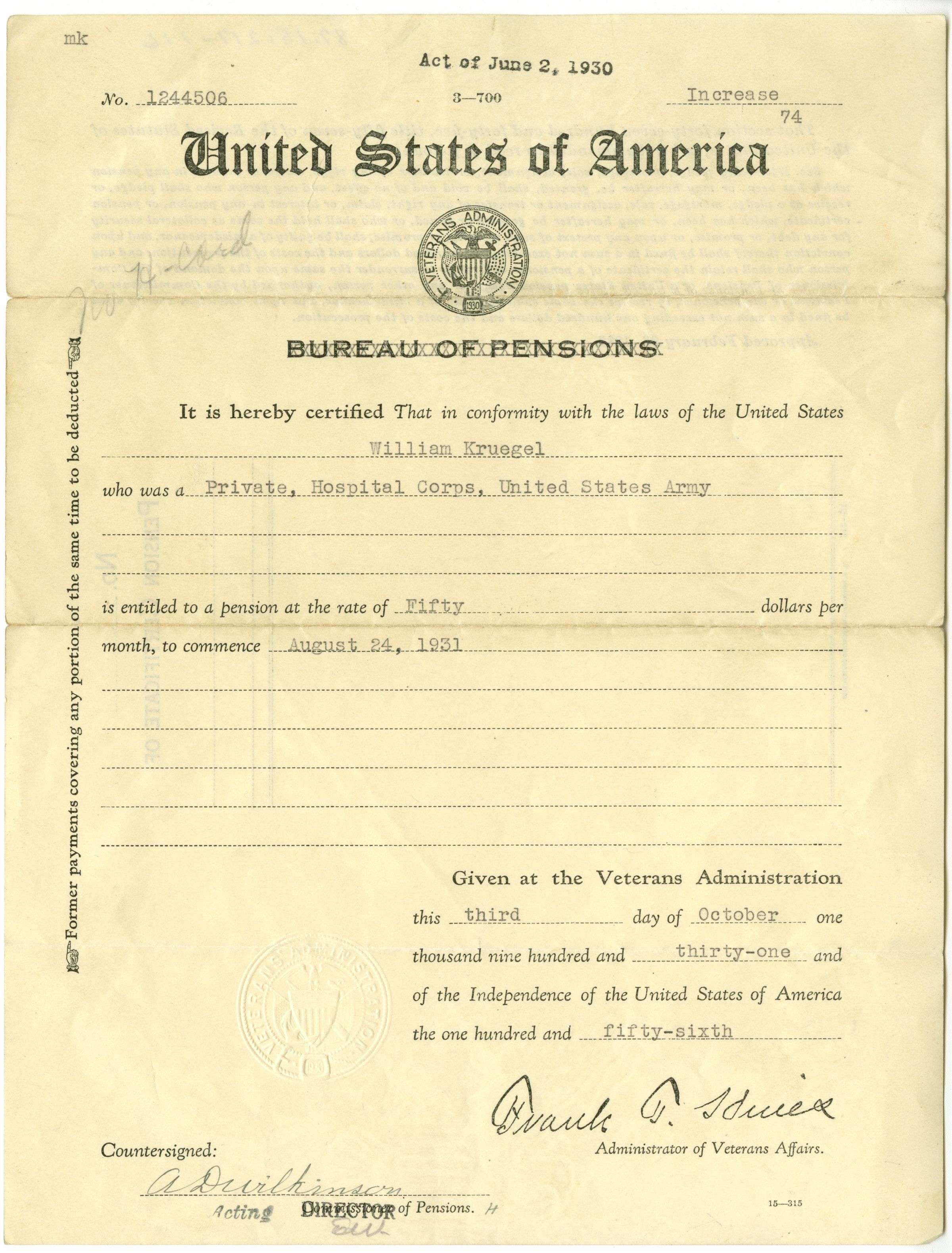 "It is hereby certified that in conformity witht he laws of the United States, William Kruegel who was a Private, Hospital Corps, United States Army, is entiteld to a pension at the rate of Fifty dollars per month, to commence August 24, 1931. Given at the Veterans Administration this third day of October one thousand nine hundred and thirty-one and of the Independence of the United States of America the one hundred and fifty-sixth." Signed Administrator of Veterans Affairs and Acting Director of Pensions.Collection