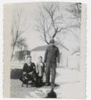 Black and white photograph of a young man, a boy, a man, and a dog. The young man is in a naval uniform. The boy is wearing dark pants and an oversized jacket. The man is wearing a hat, a sweater, dark pants, and shoes. The people are probably Clyde Brunner, Lester K Brunner, and Albert Brunner. Photograph was taken on a farm in winter. Photograph was taken circa 1946.Photograph Details