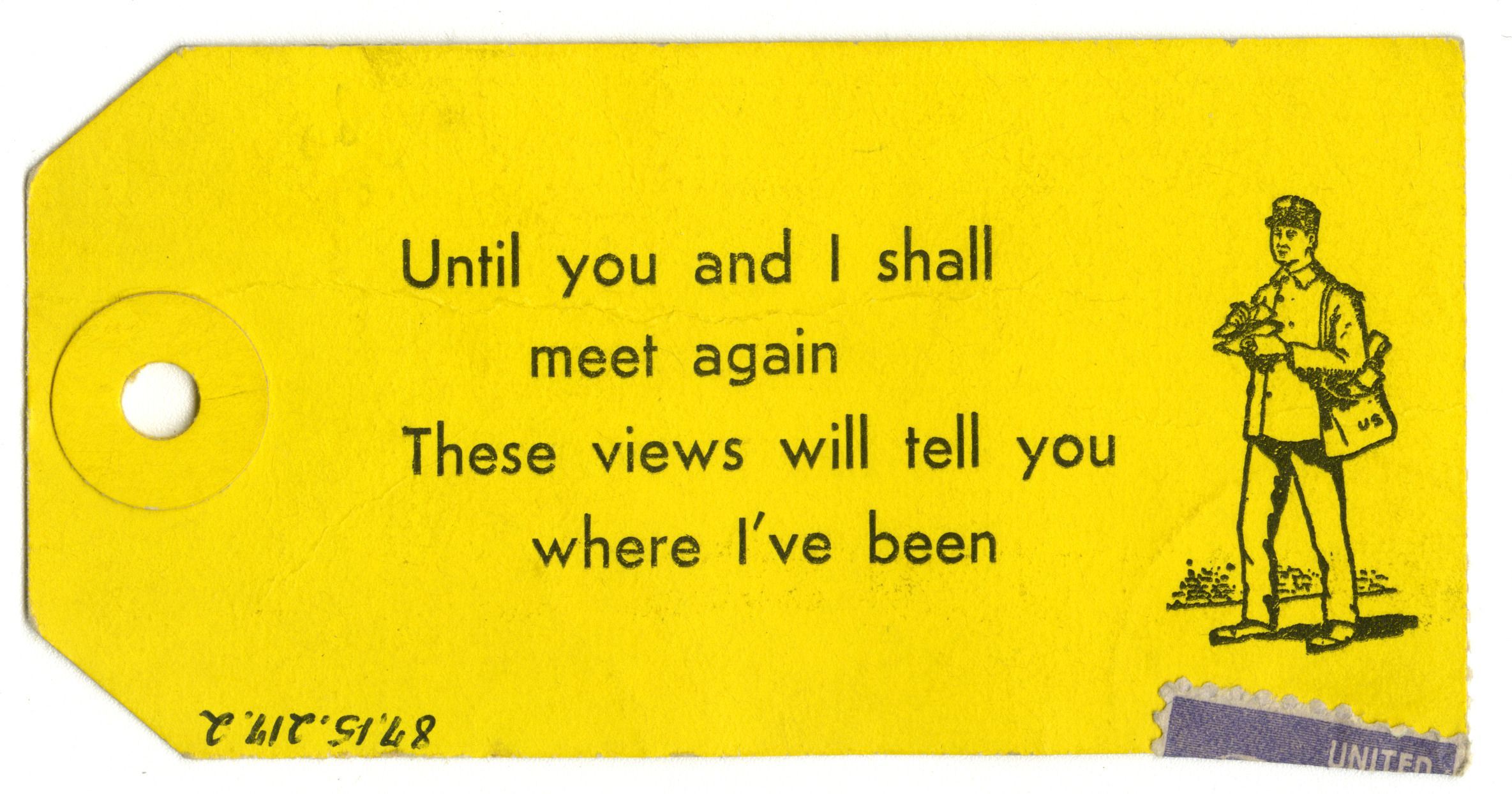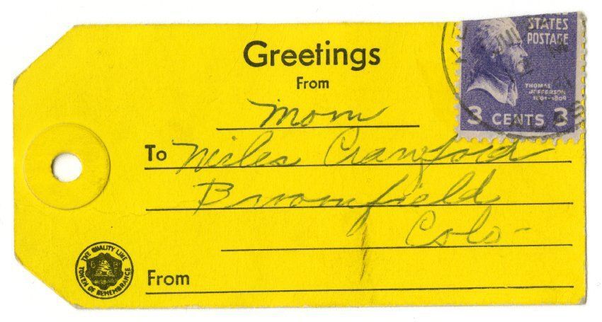 Yellow tag "Greetings from Mom to Miles Crawford, Broomfield Colo." 3c postage stamp. On back: "Until you and I shall meet again These views will tell you whre I've been." Along with a little drawing of a postal carrier.