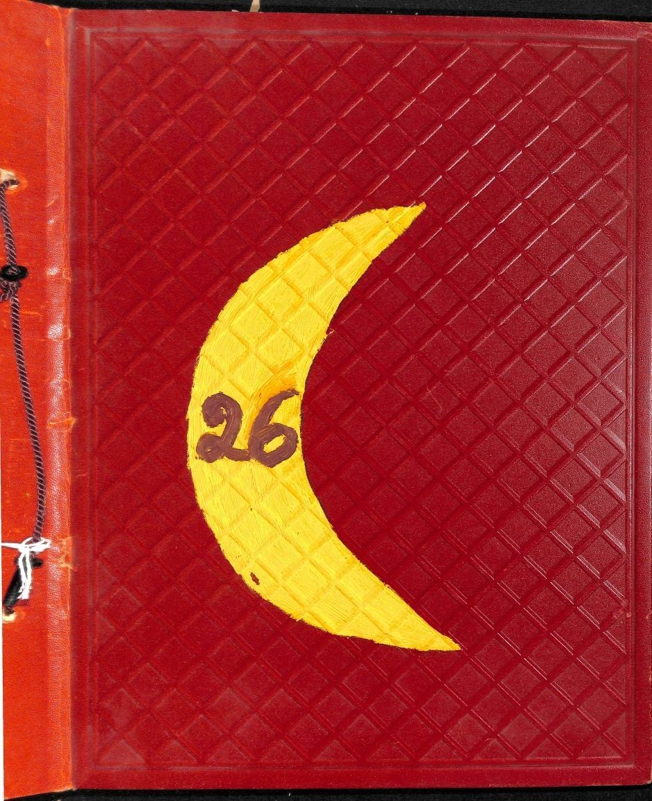 Item is a large hard-cover scrapbook compiled by the Crescent Grange, an organization that served as a means of social gathering for early Broomfield residents. The cover of the book is dark red with a diamond pattern, and a yellow crescent with the purple number 26 is painted on the front. The pages are bound together by string. This scrapbook focuses mainly on the activities of the Crescent Junior Grange, a youth organization, during the year 1951. Items within the pages include examples of crafts done, article supplements, and handwritten accounts of activities done by the group. Most of the latter pages are blank.Collection