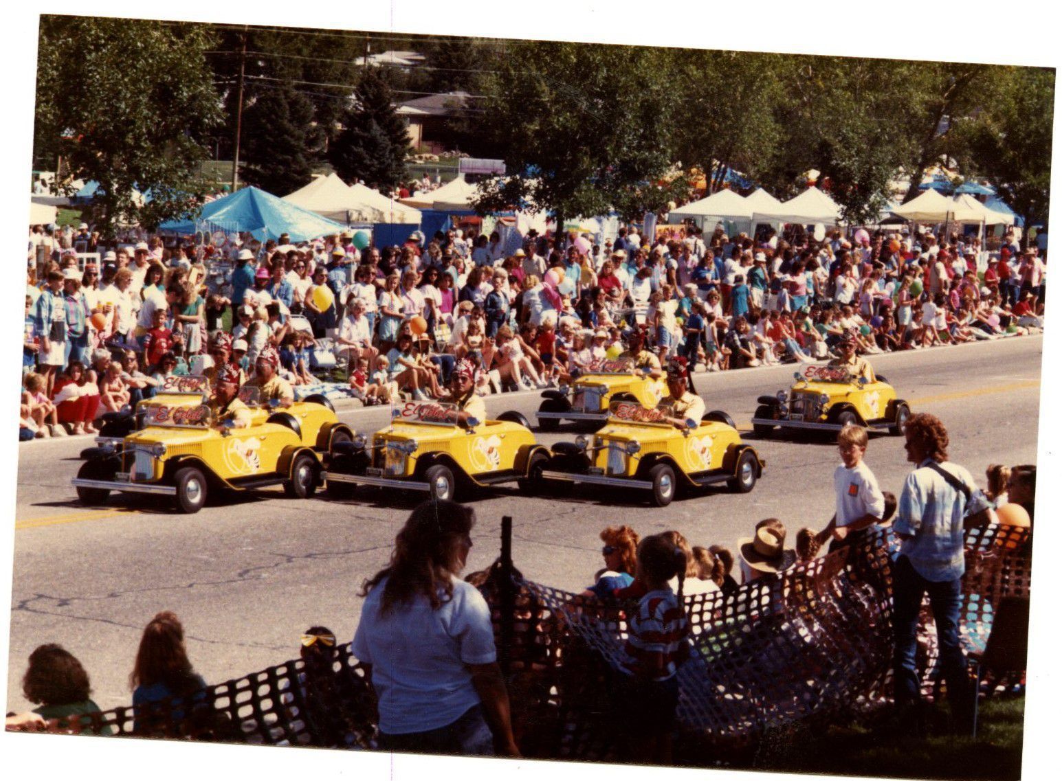 Item is a photograph printed on Kodak paper taken during the 1989 Broomfield Days event. The photo centers on the street, where large crowds have gathered on either side to witness the parade. Six vintage one-seater cars are driving in formation down the road, each with the same symbol plastered on to their yellow paint. White and blue tents hosting other festivities are visible beneath the trees in the background.Photograph Details