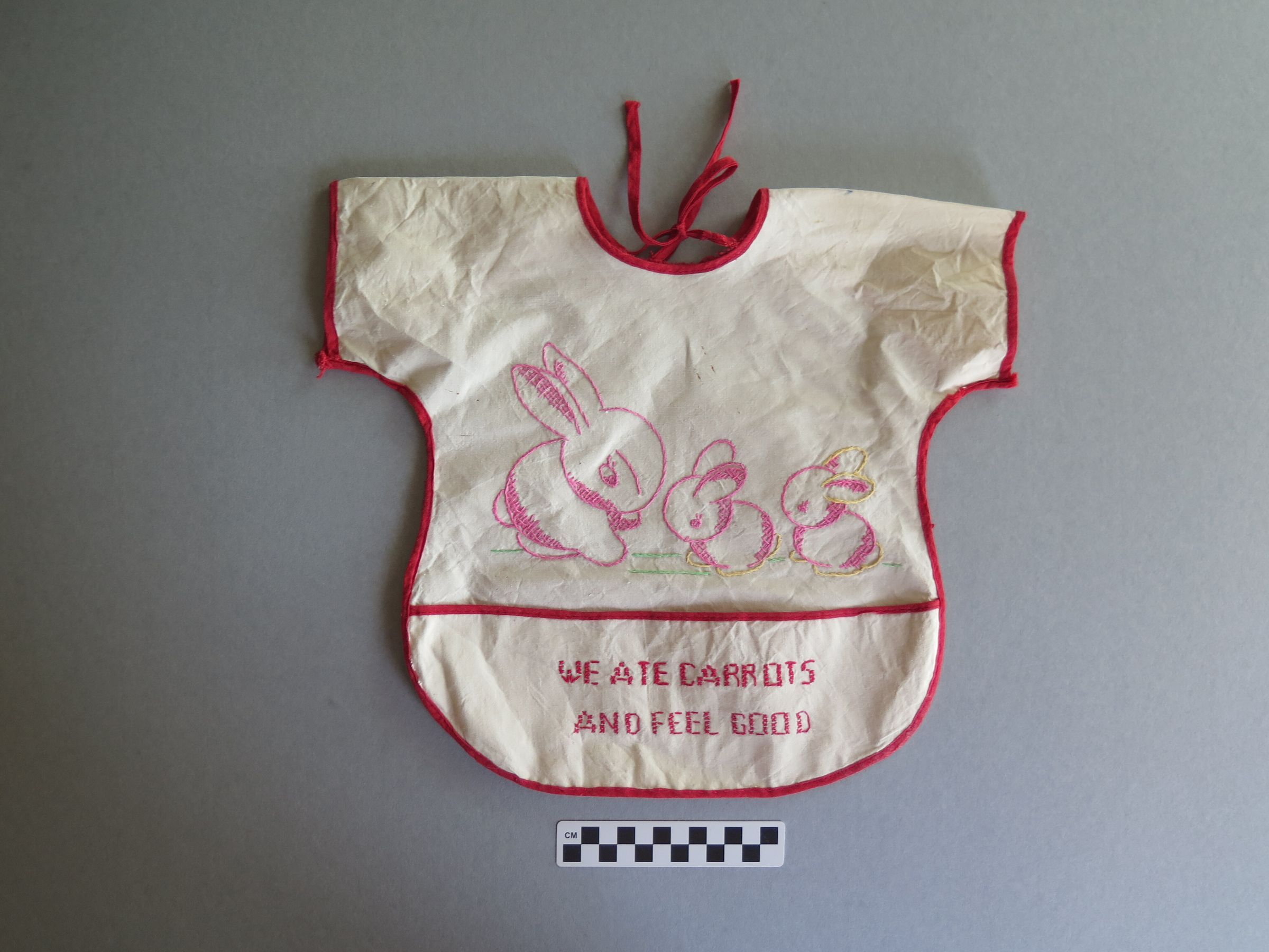 White or off white bib with red trim. There are three bunnies outlined in pink thread, one larger and two smaller. There is an open pocket at the bottom of the bib in red text that reads "We Ate Carrots And Feel Good." The bib measures 14" (w) x 17" (l).