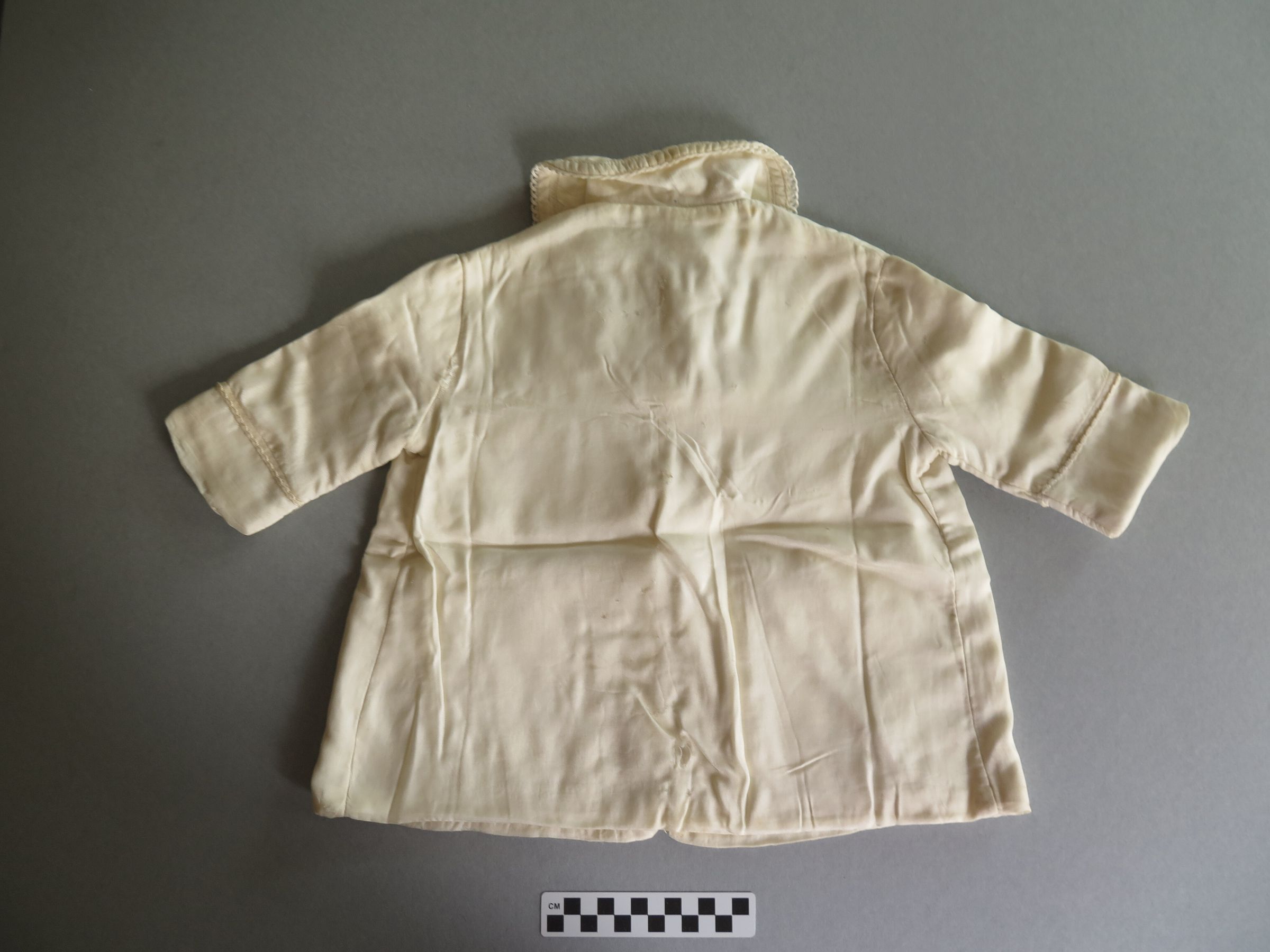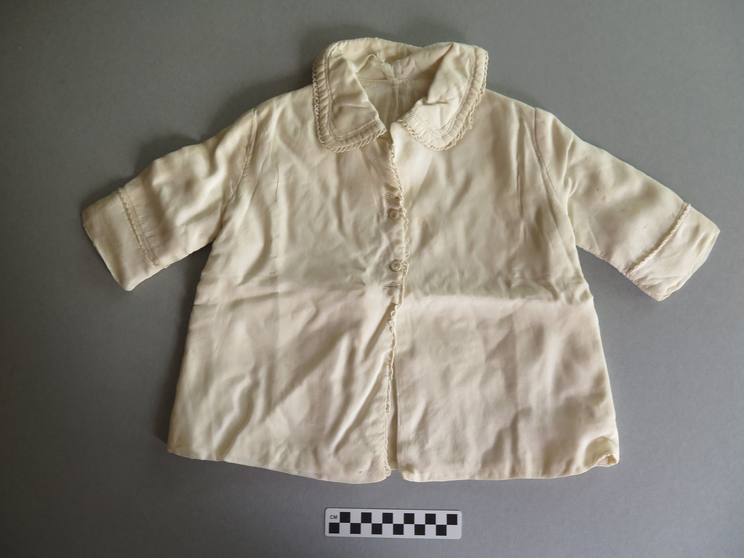 Child's white jacket with a collar around the neck and buttons going half way down the front. The edges of the collar are trimmed with a scalloped design. The coat measures 17" (w) x 22" (l).