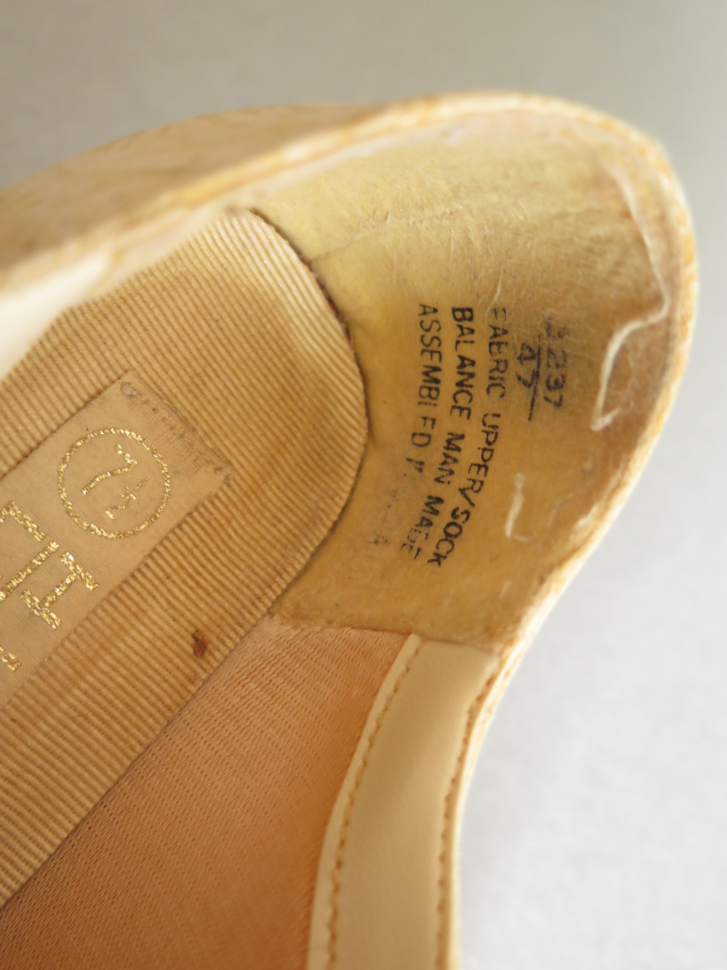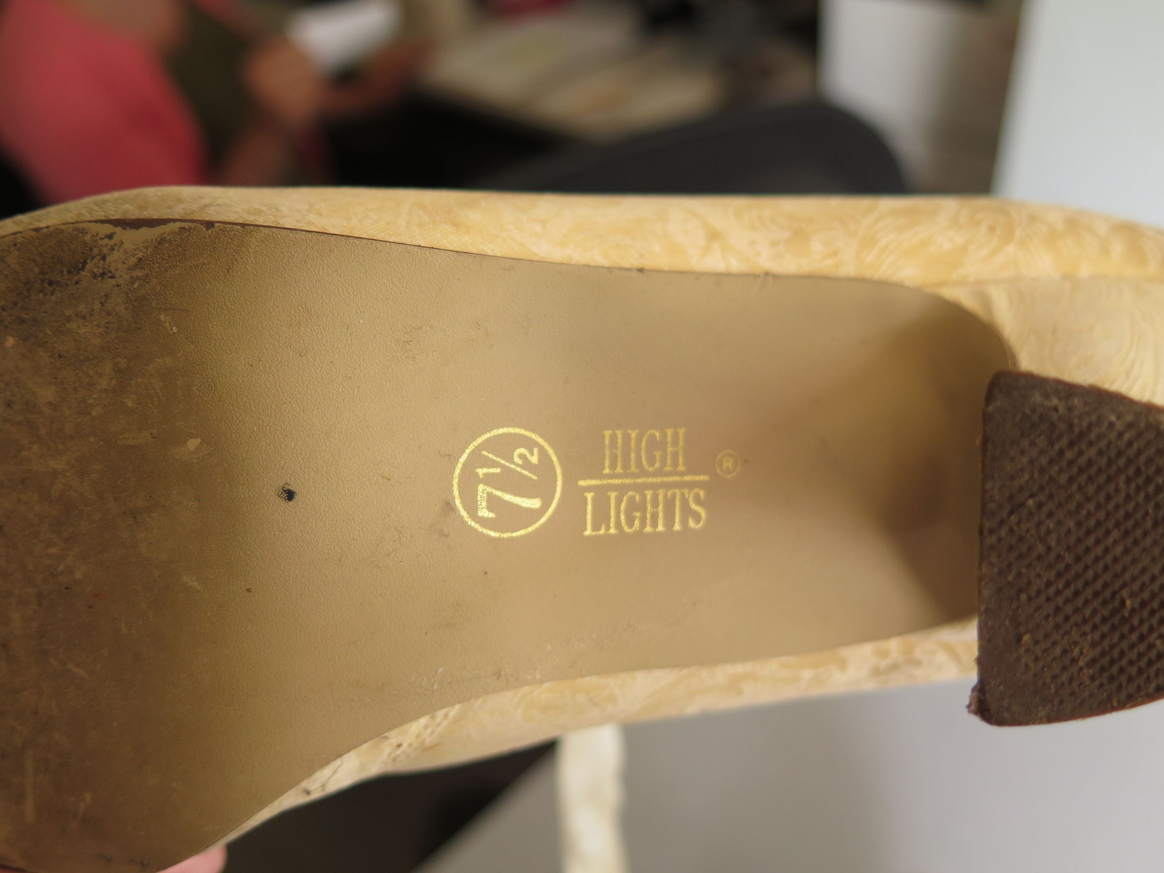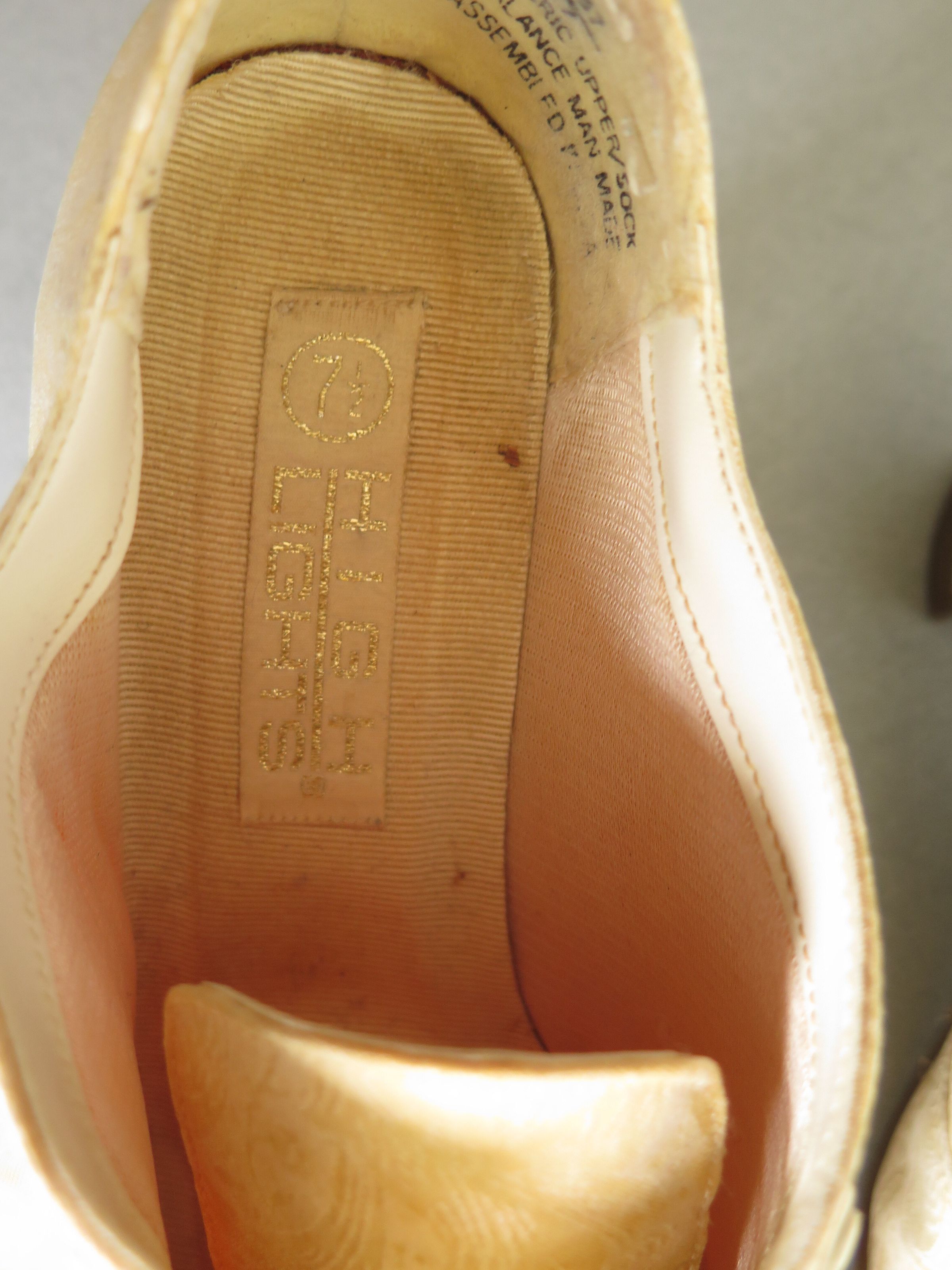 Cream colored women's high heeled shoes with cream colored ribbbon laces. The shoes have a tone on tone paisley pattern on them. The tag in the shoe says it is the brand High Lights and is a size 7.5. The text printed on the shoe in black reads "Balance Man Made Assembled in U.S.A. The shoes measure 9" (h) x 3" (w) x 5" (depth).