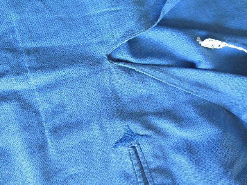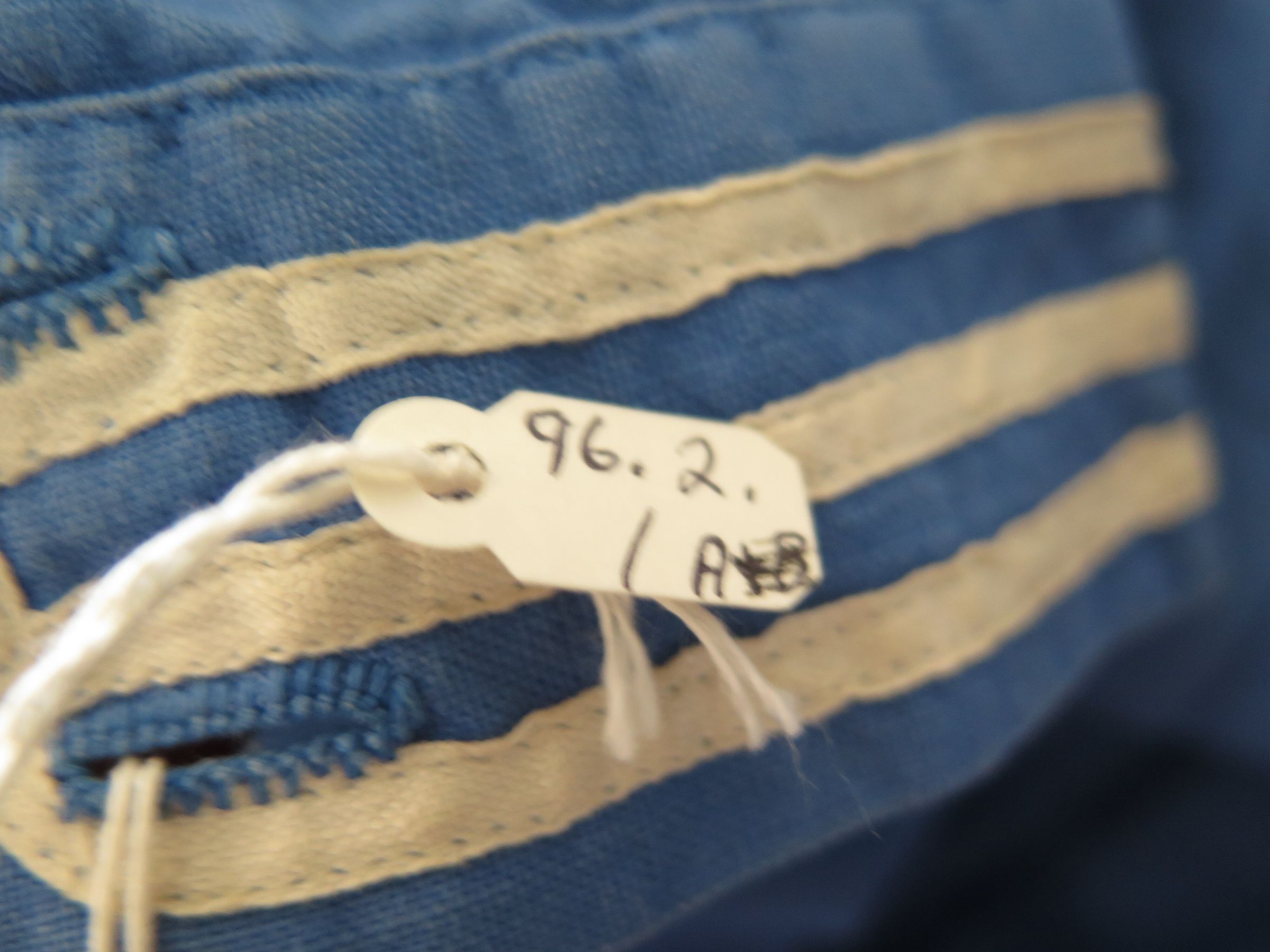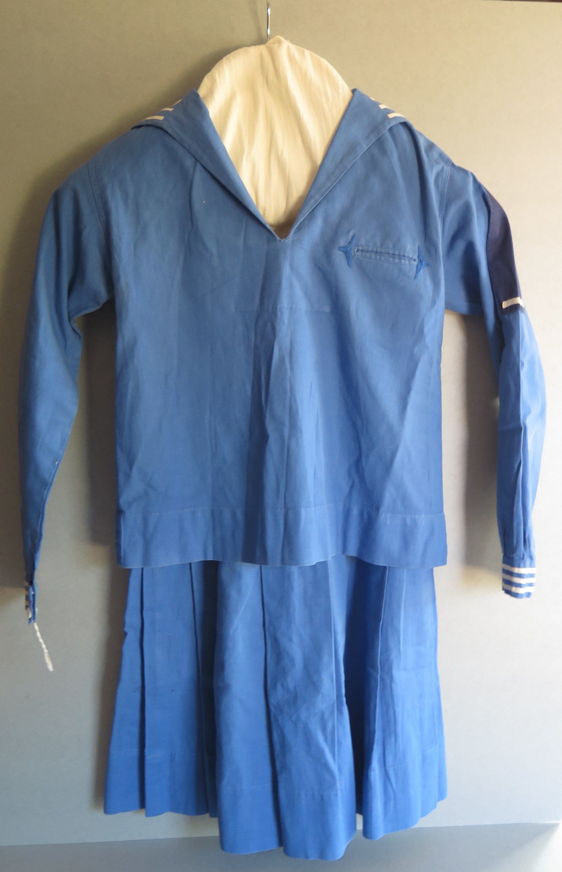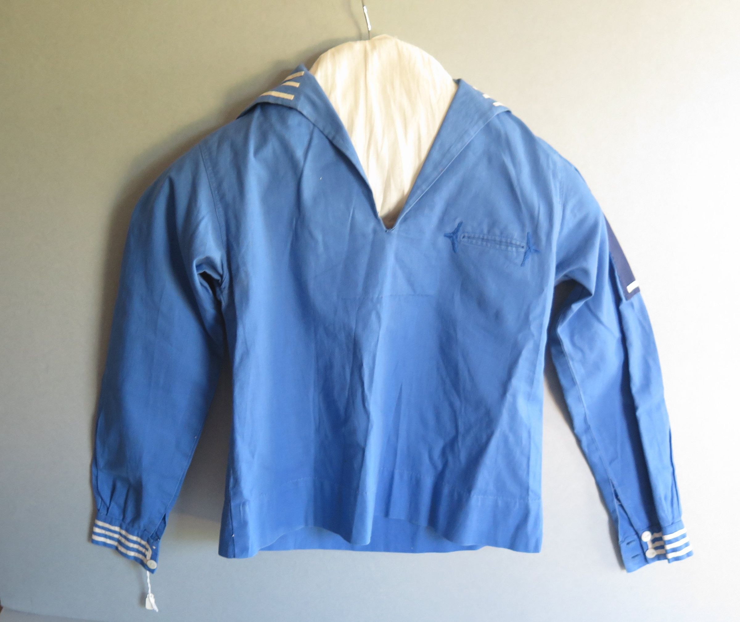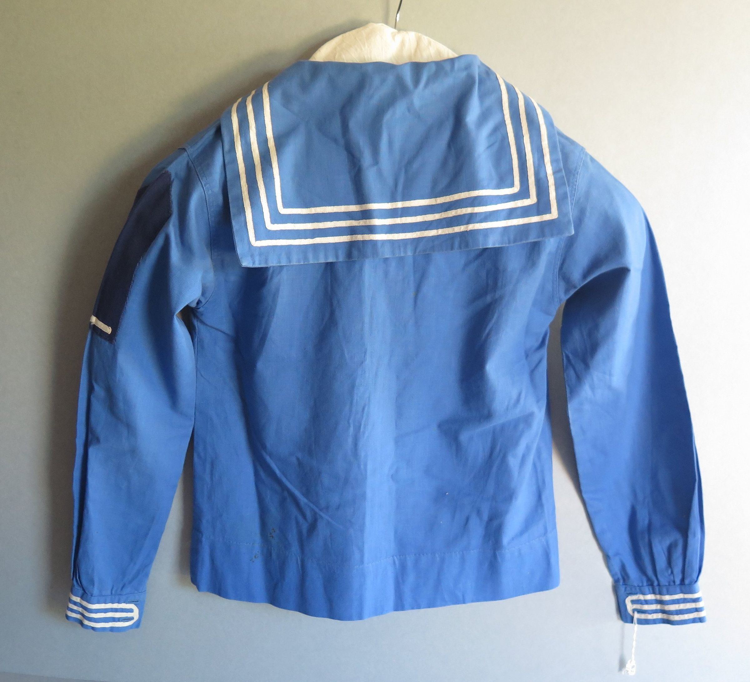 Girl's blue sailor uniform. With white stripes along the wrists and on the flap in the back. There is a darker blue patch on the upper arm of one sleeve. There is a inverted breast pocket with embroidered details on wither side. The jacket measures 24" (w) x 34" (l).
