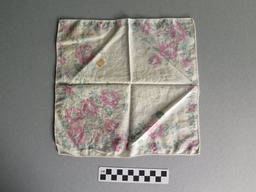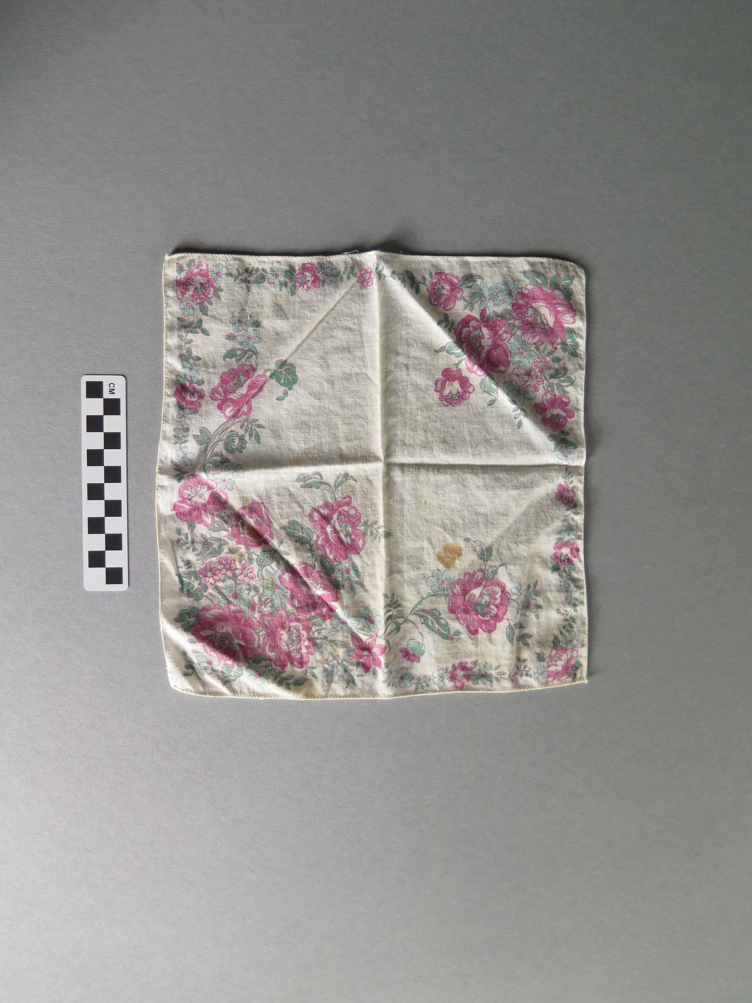 White handkerchief with pink roses. The handkerchief measures 11" (w) x 11" (l).
