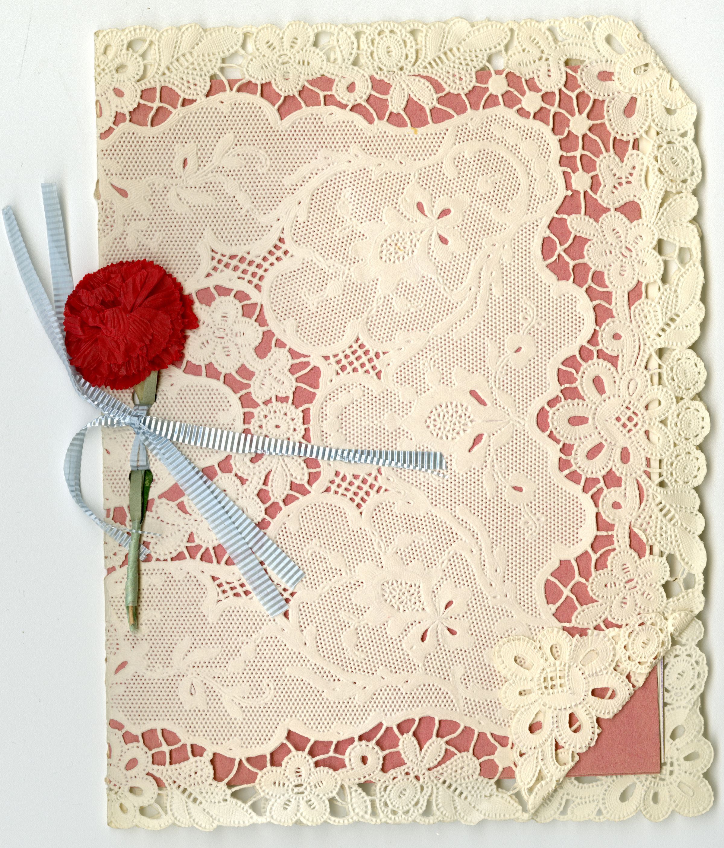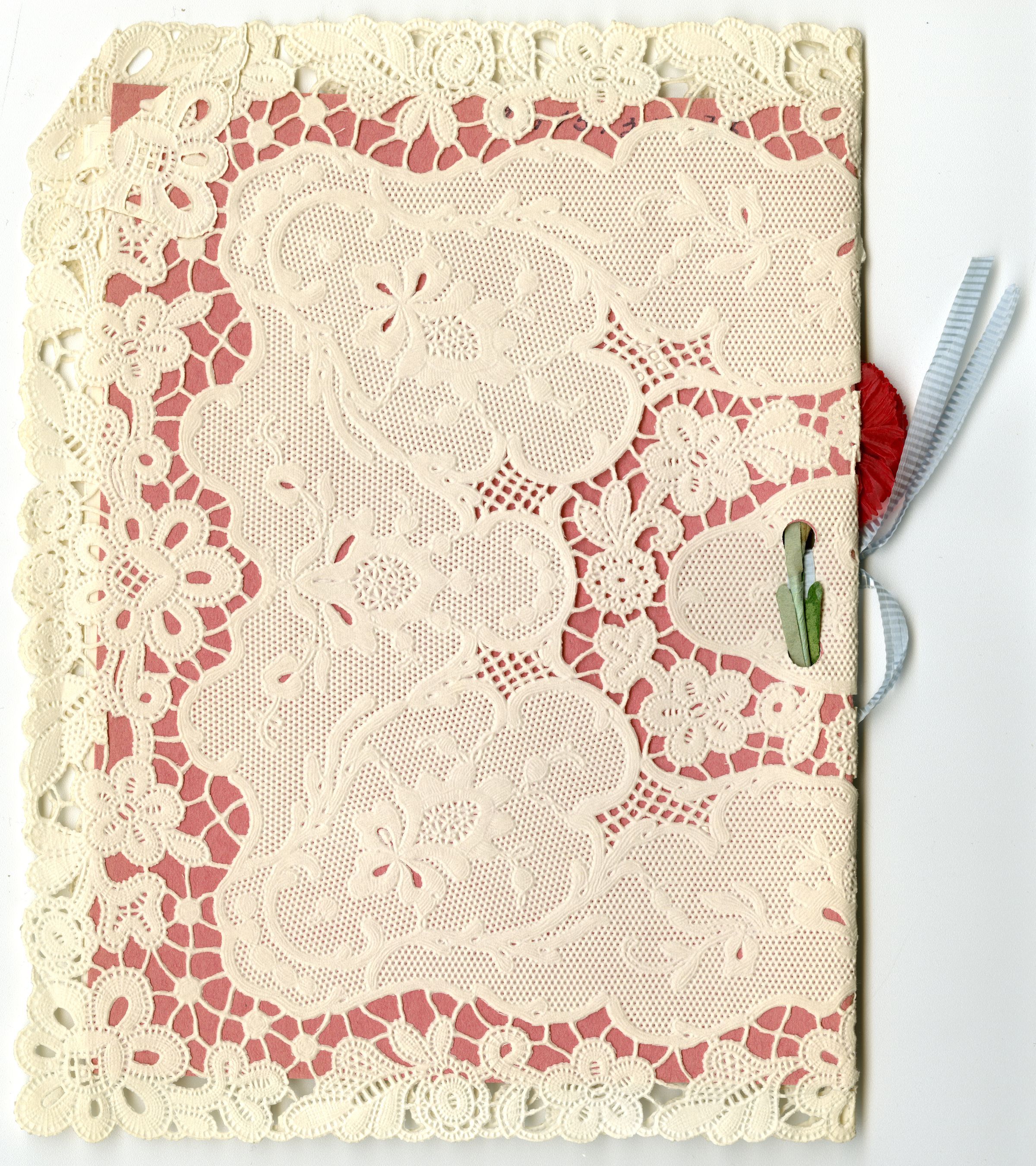 Program for the Colorado Mother's Association Luncheon, May 6, 1961. Pink book, with lace around it. In the binding there is a red flower with a blue ribbon.Collection
