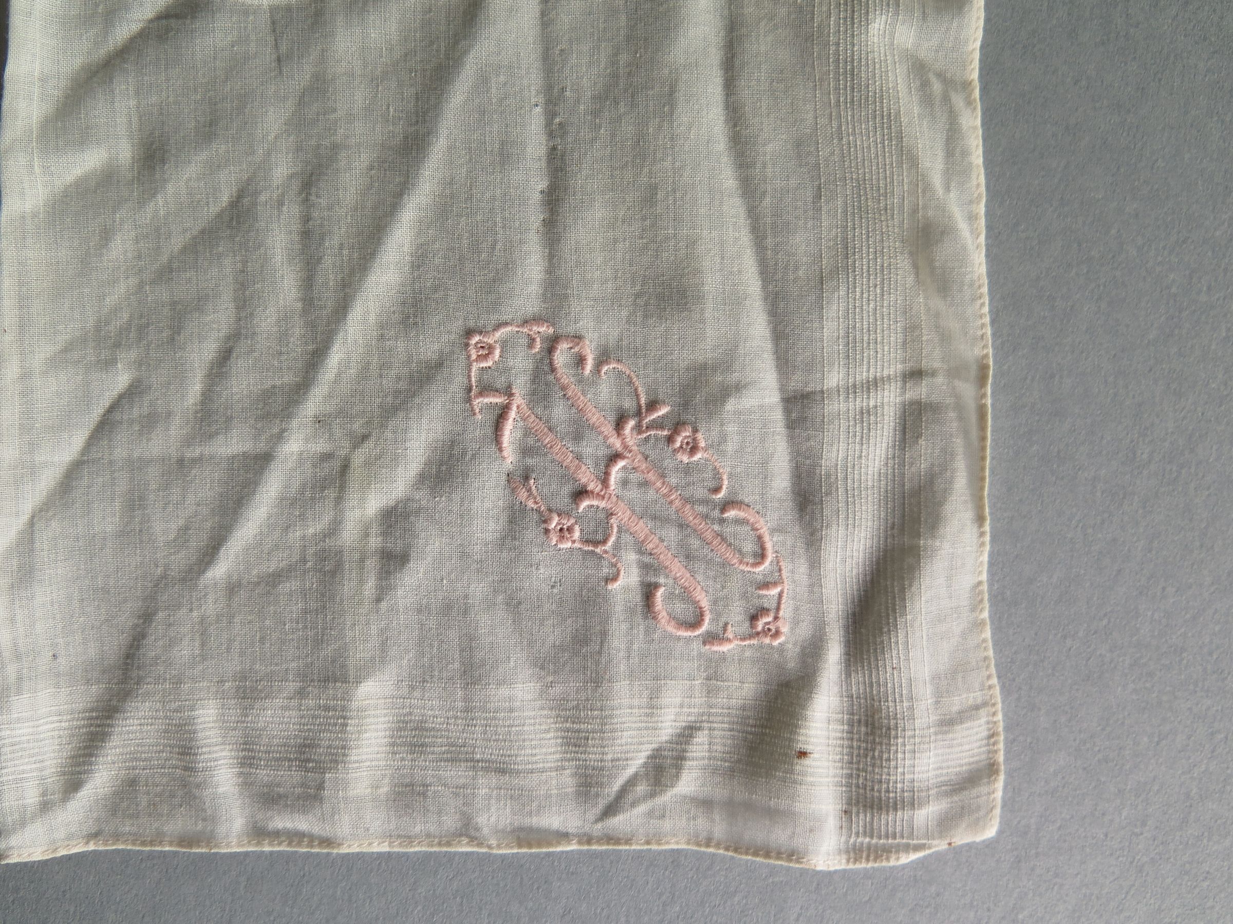 White handkerchief with pink "H" in one corner. The handkerchief measures 11" (w) x 11"(l).
