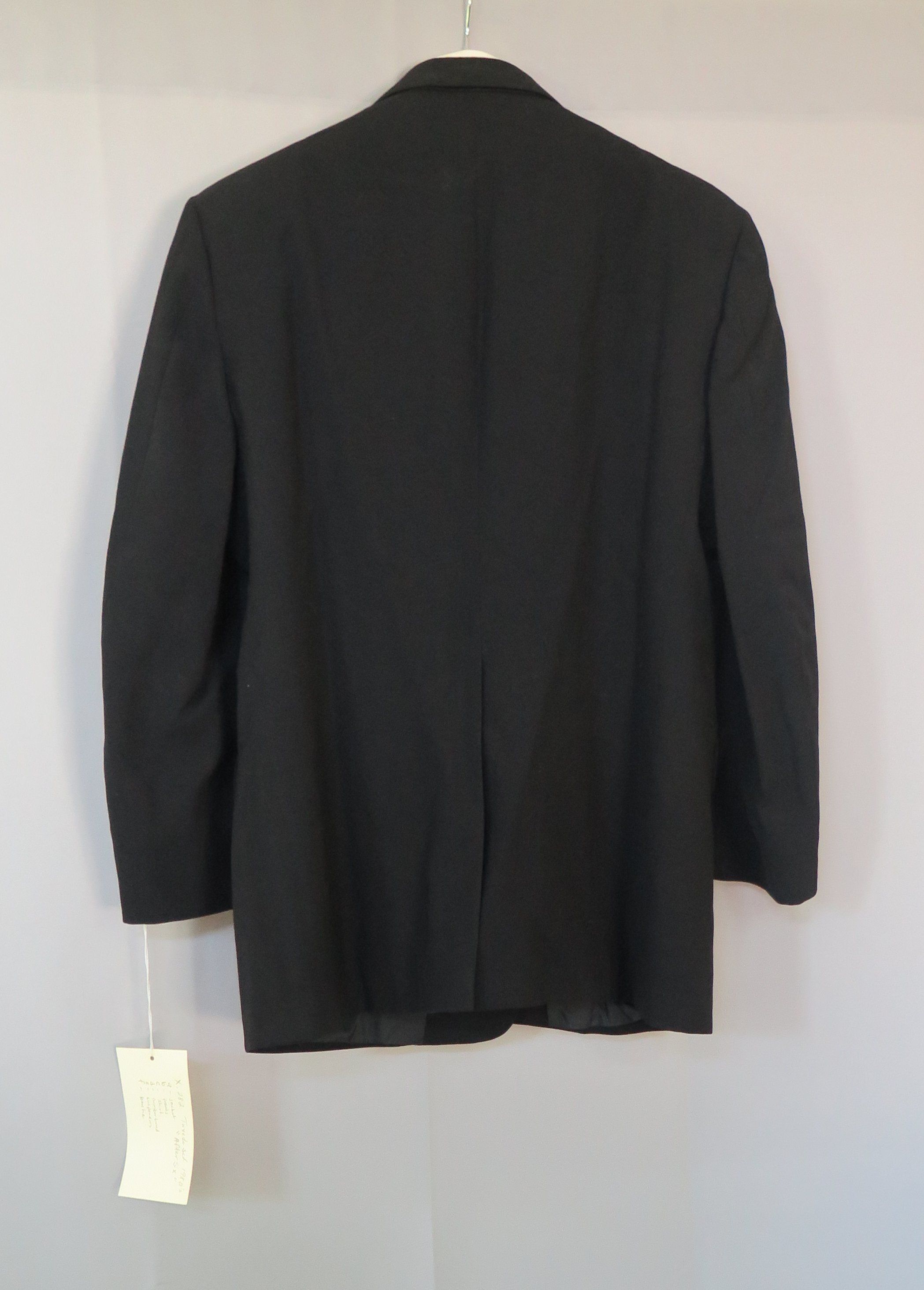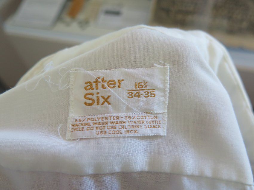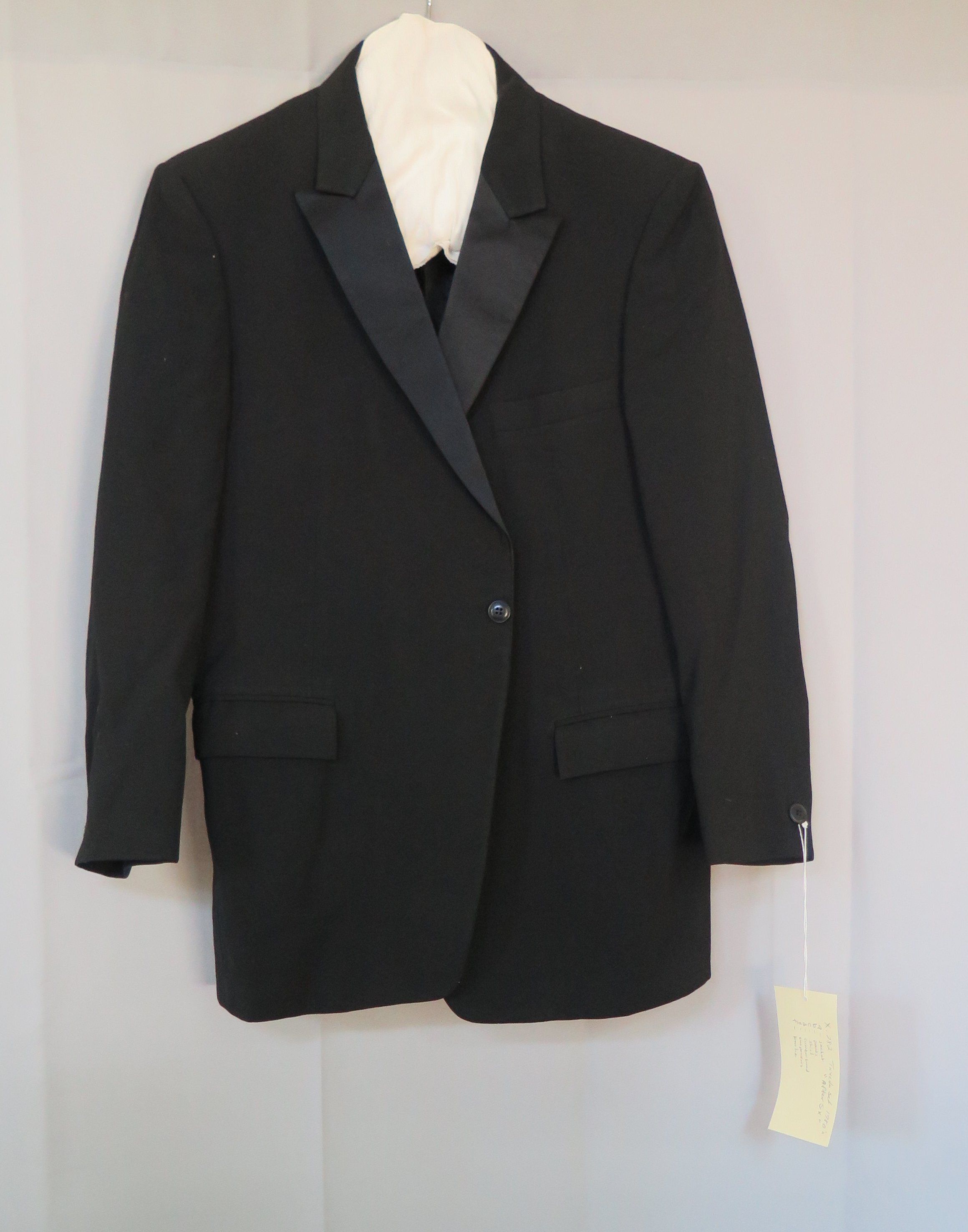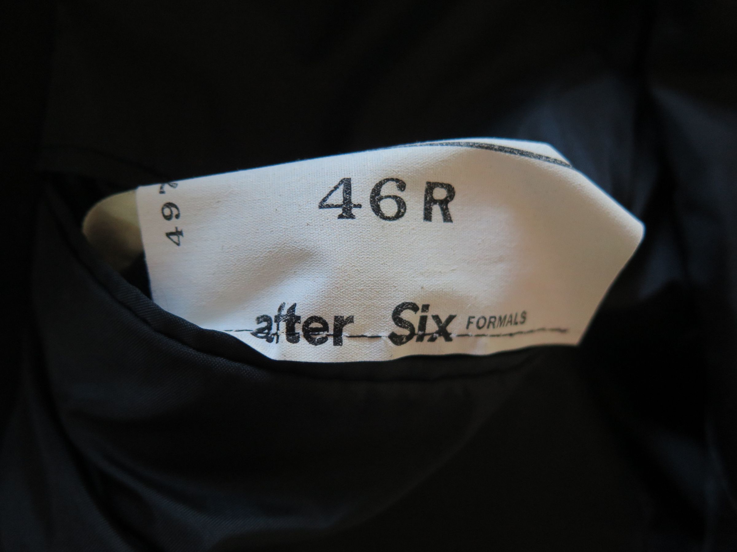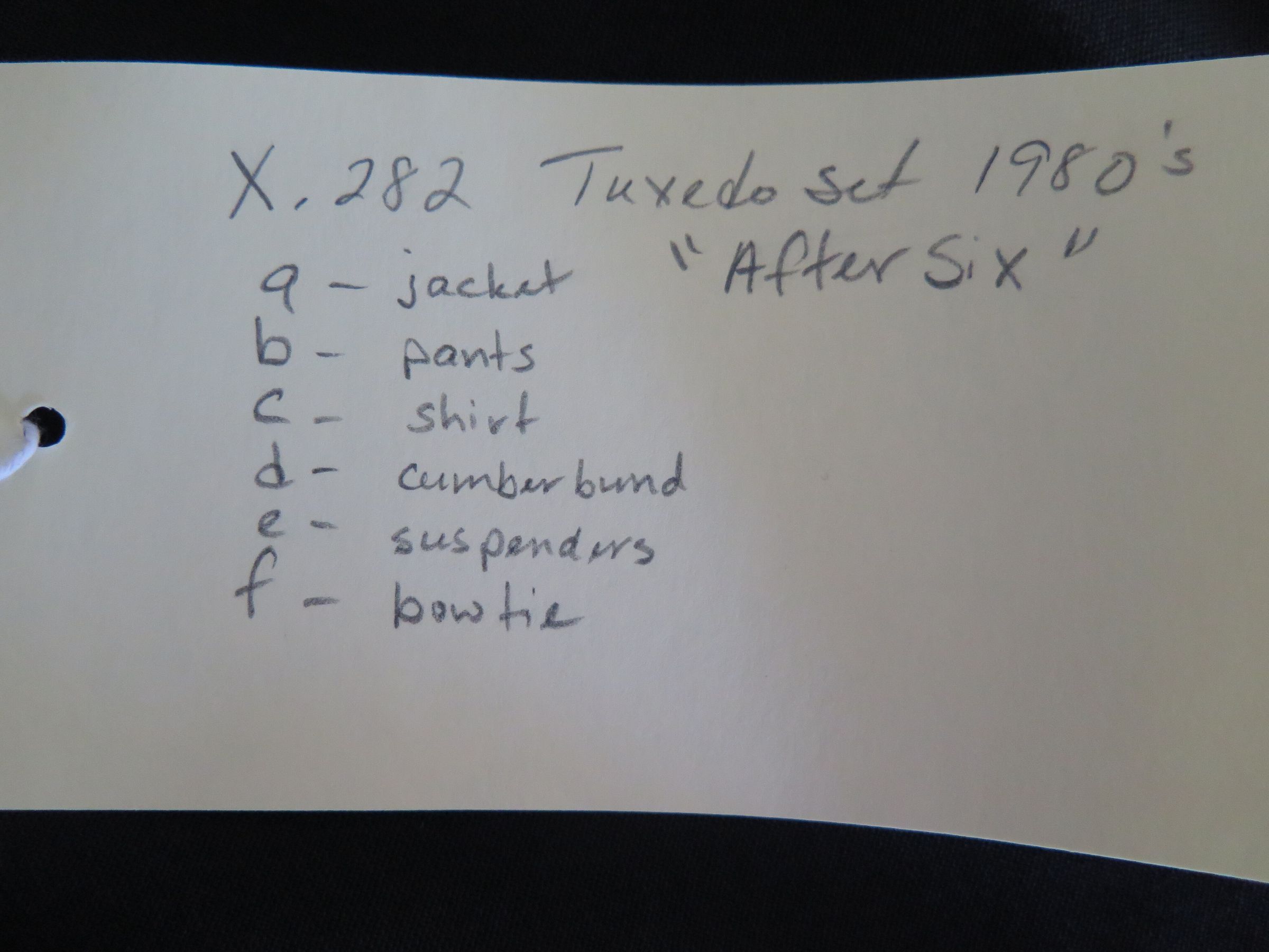 Black tuxedo jacket (a) from a tuxedo rental. The jacket is a single button peak lapel with a center vent. There is one button on each sleeve. The tag on the inside explains it is a 46Regular from the company After Six Formals, circa 1970-80s. Black tuxedo pants (b), from a rental tuxedo. The pants are three size adjustable: waist sizes 36-37-38. Inside the pants is a handwritten tag which reads "James." The shirt (c) is a button up tuxedo shirt with a point collar and white ruffles on the front trimmed in with black edging. The sleeves are a French cuff with black trim along the scalloped edges. The tag inside the shirt reads "After Six 16.5 34-35 65% polyester - 35% cotton." Black cummerbund (d) with gold clip in the back. Brown suspenders (e) with white stripes. The black bow tie (f) is a clip on with s cinch in the back to change size. The jacket (a) measures 33" (w) x 48" (l), the pants (b) measures 24.5" (w) x 40.5" (l), the shirt (c) measures 16.5" (w) x 34" (l), the cummerbund (d) measures 5" (w) x 42" (l), the suspenders (e) measure 5" (w) x 38" (l), the bow tie measure 2" (w) x 18" (l).
