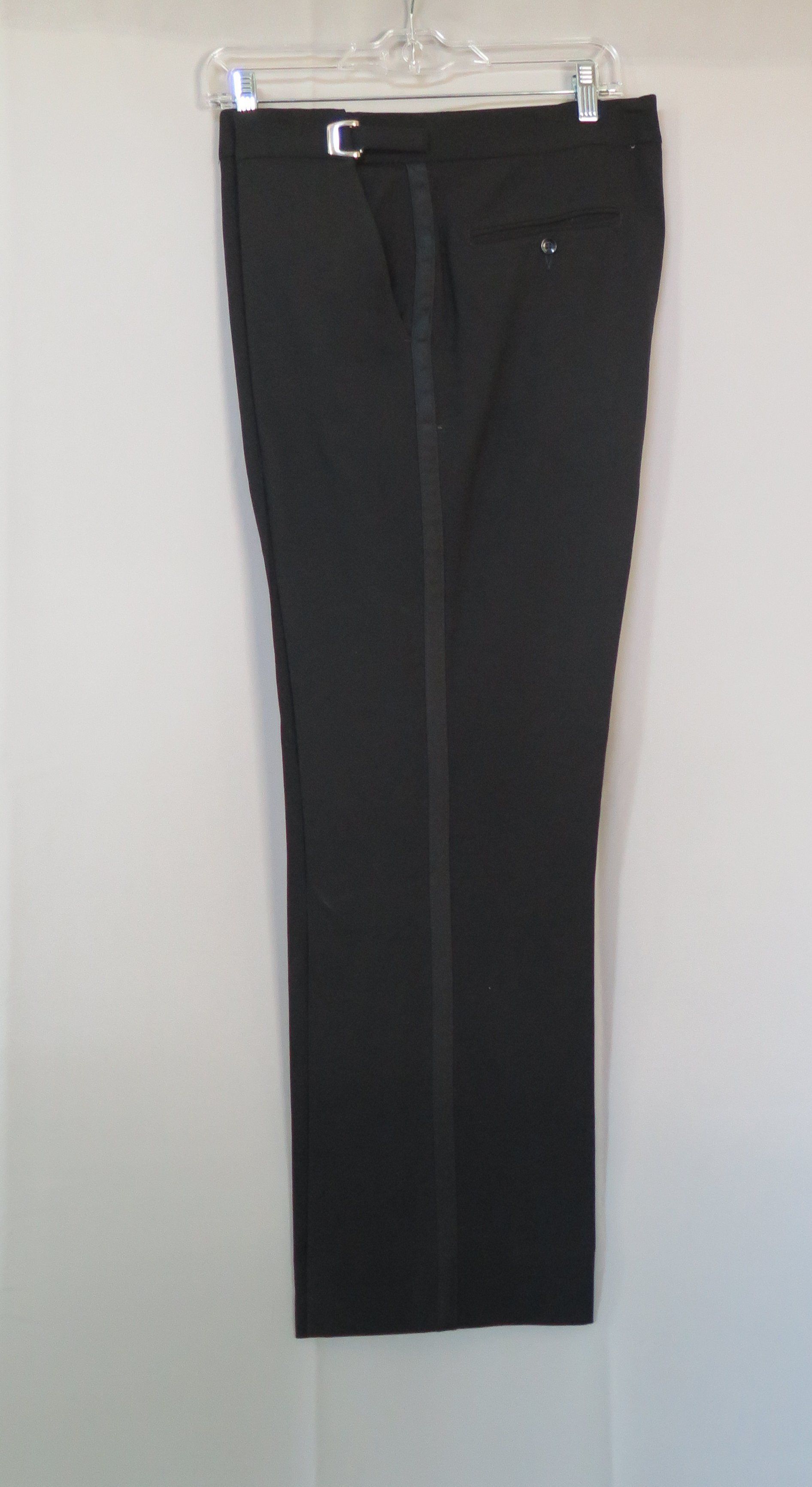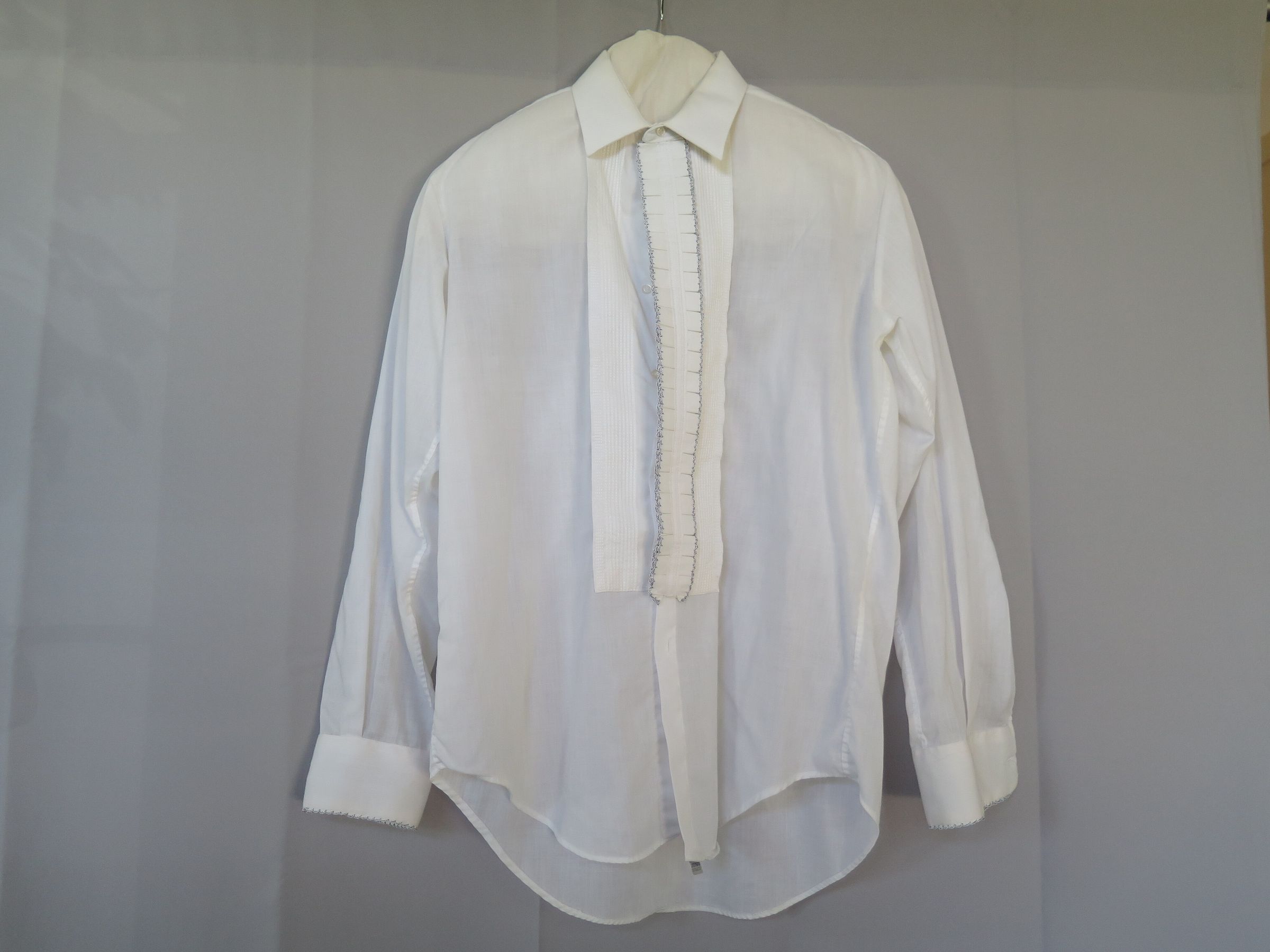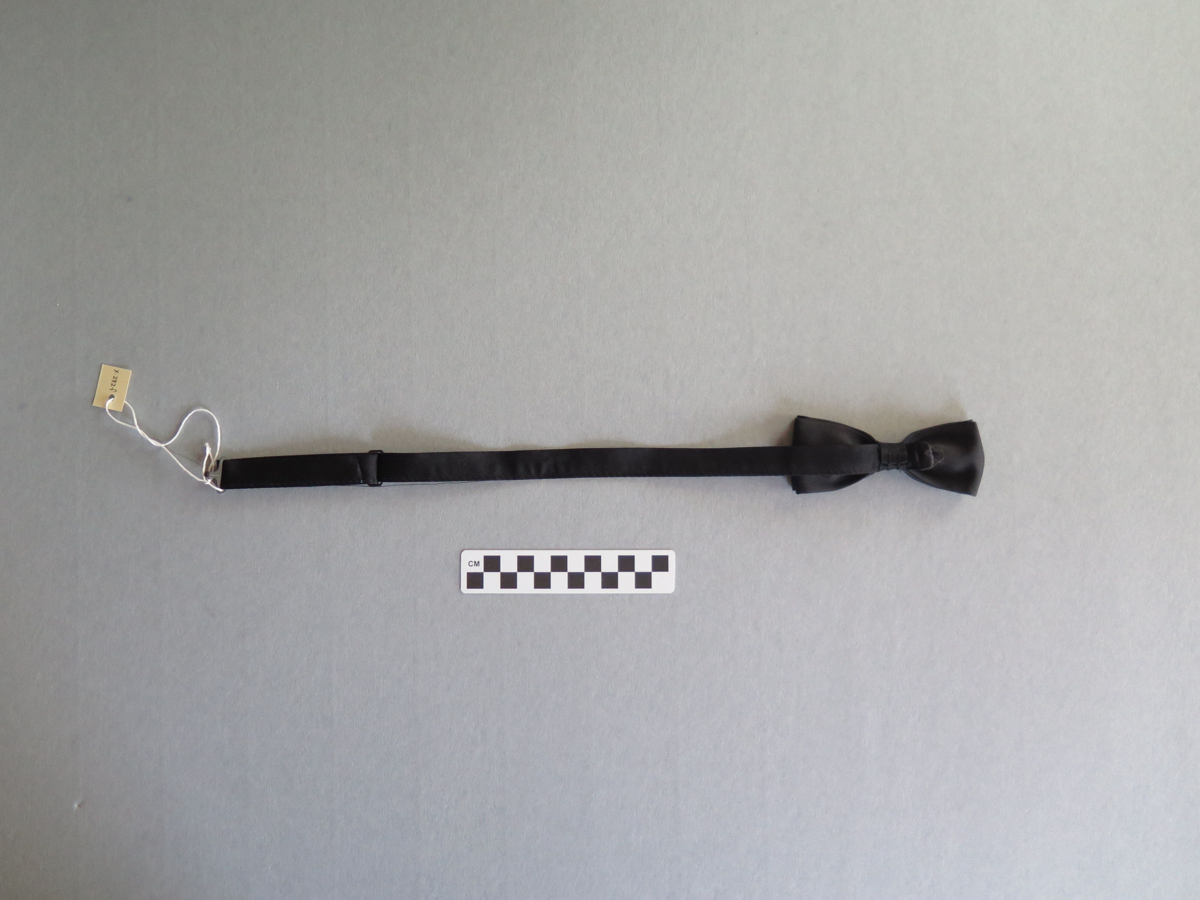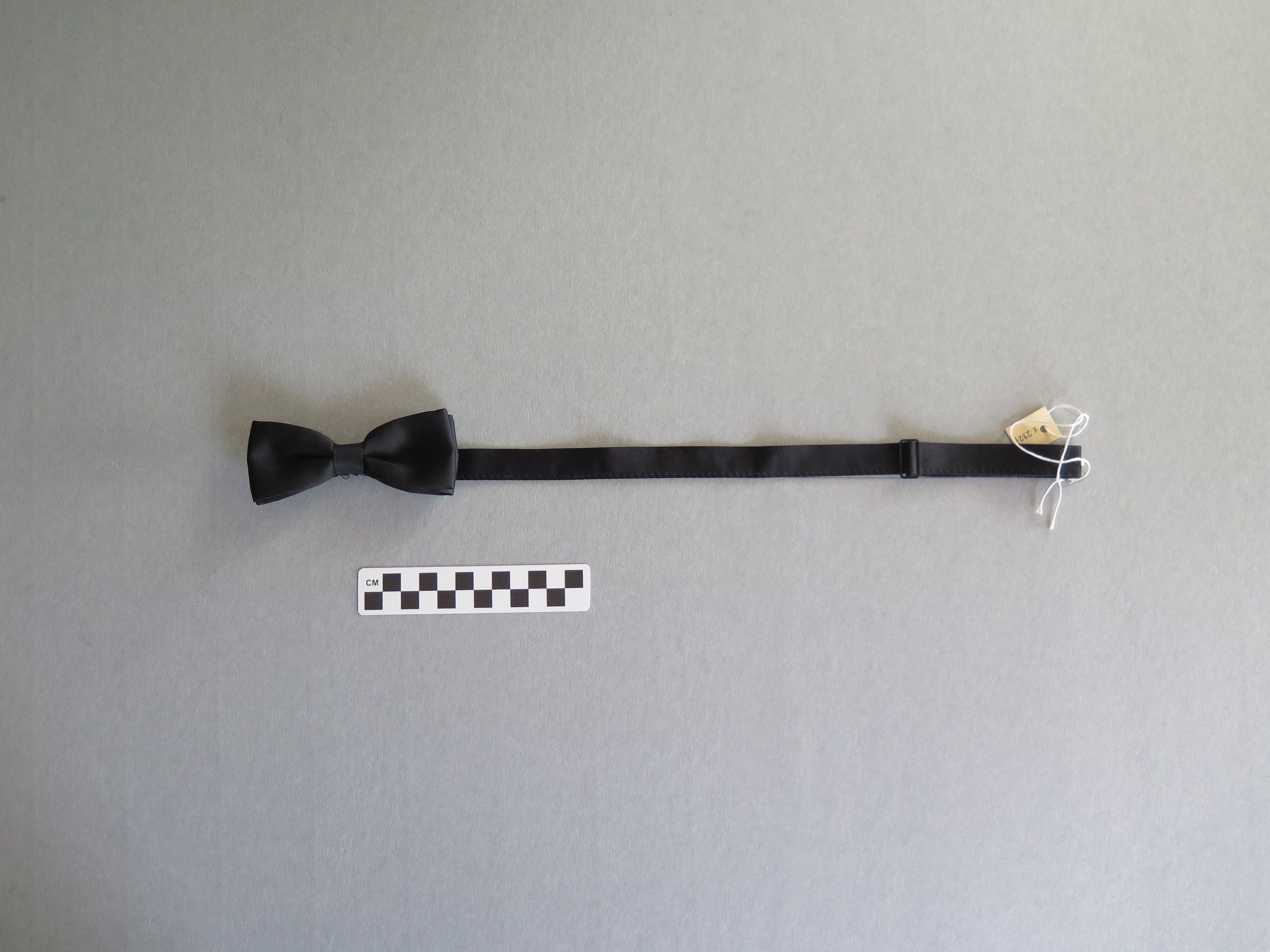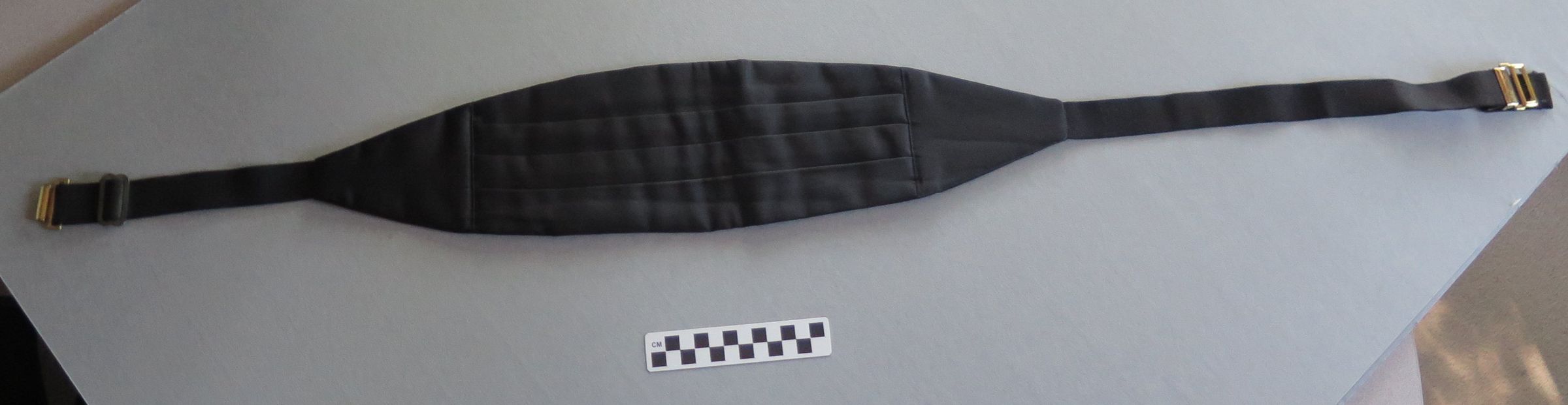 Black tuxedo jacket (a) from a tuxedo rental. The jacket is a single button peak lapel with a center vent. There is one button on each sleeve. The tag on the inside explains it is a 46Regular from the company After Six Formals, circa 1970-80s. Black tuxedo pants (b), from a rental tuxedo. The pants are three size adjustable: waist sizes 36-37-38. Inside the pants is a handwritten tag which reads "James." The shirt (c) is a button up tuxedo shirt with a point collar and white ruffles on the front trimmed in with black edging. The sleeves are a French cuff with black trim along the scalloped edges. The tag inside the shirt reads "After Six 16.5 34-35 65% polyester - 35% cotton." Black cummerbund (d) with gold clip in the back. Brown suspenders (e) with white stripes. The black bow tie (f) is a clip on with s cinch in the back to change size. The jacket (a) measures 33" (w) x 48" (l), the pants (b) measures 24.5" (w) x 40.5" (l), the shirt (c) measures 16.5" (w) x 34" (l), the cummerbund (d) measures 5" (w) x 42" (l), the suspenders (e) measure 5" (w) x 38" (l), the bow tie measure 2" (w) x 18" (l).